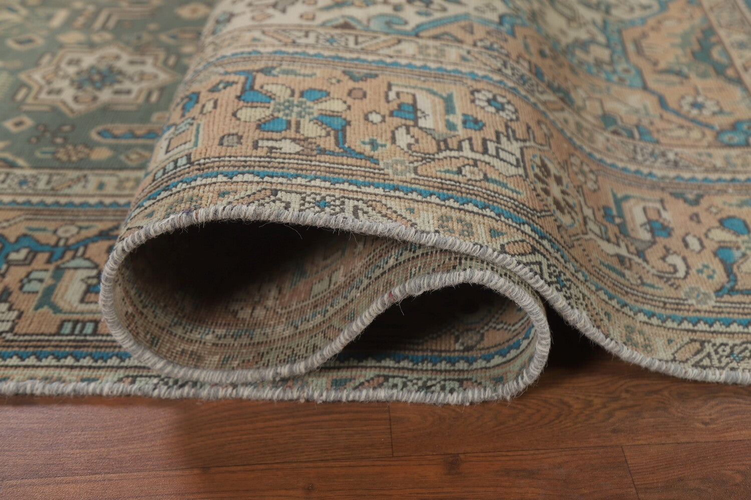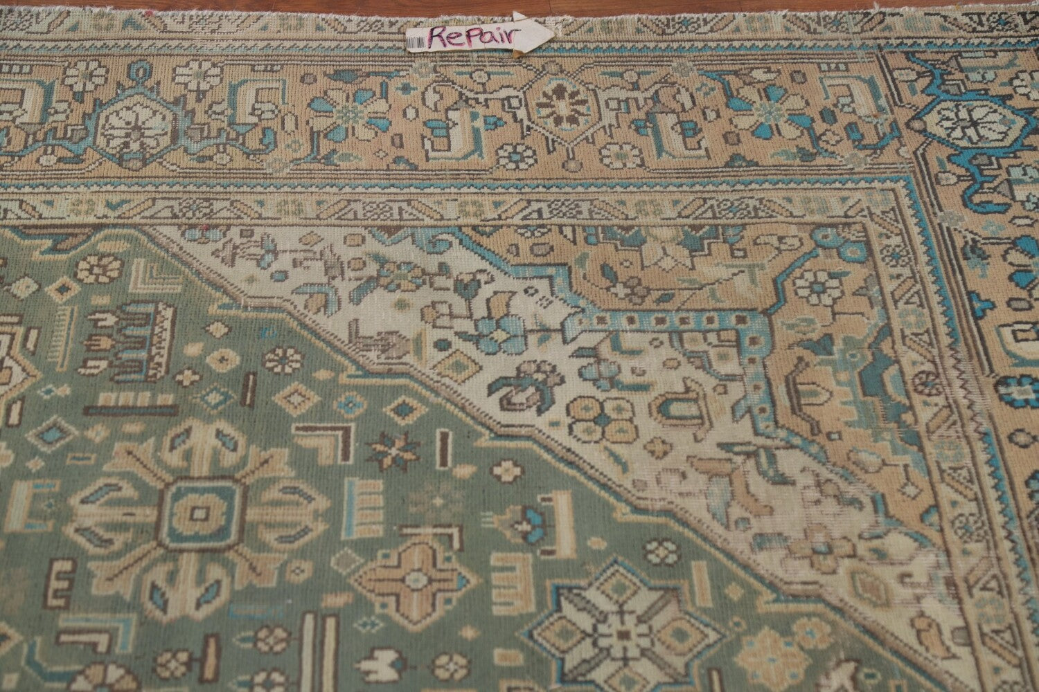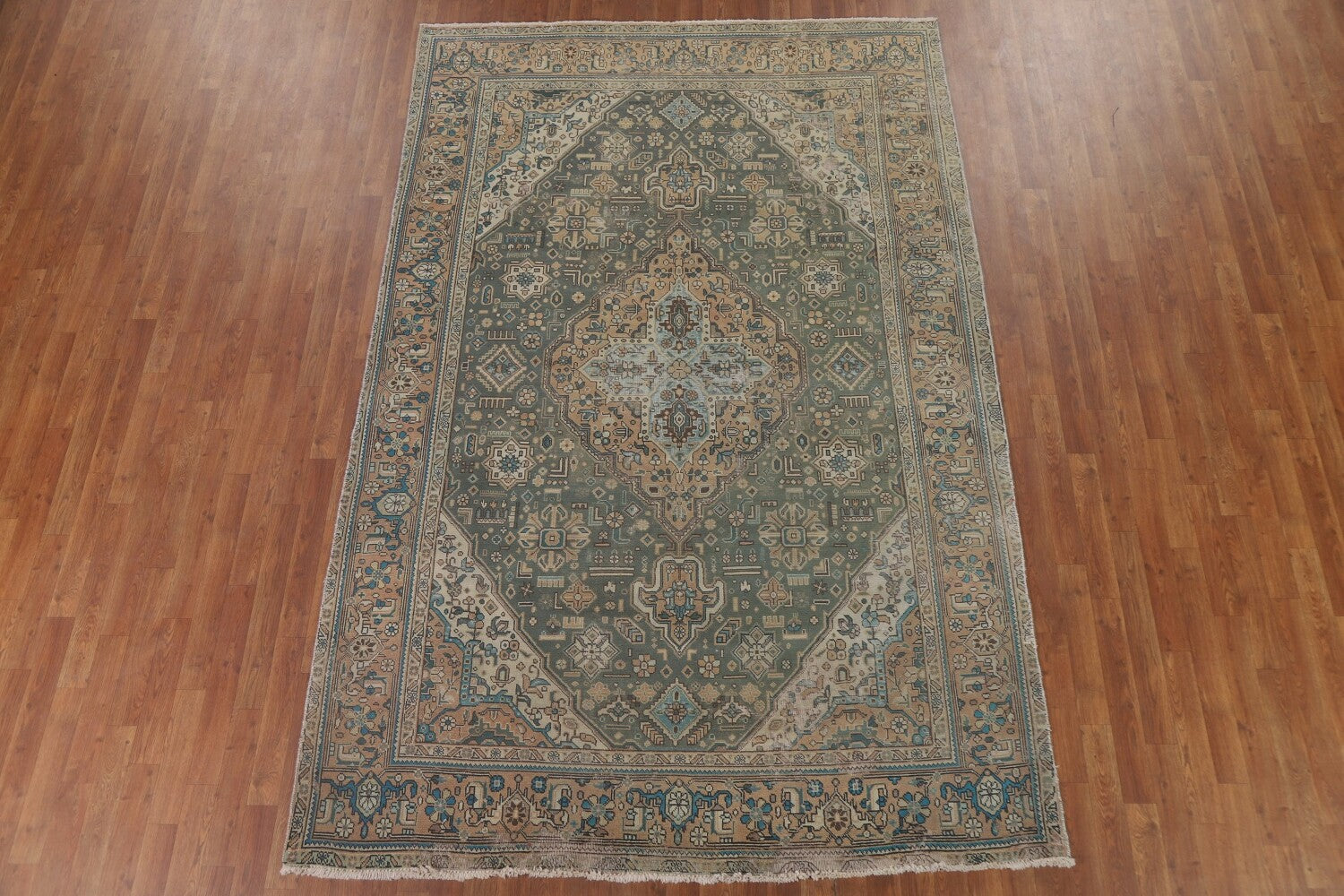 A Beautiful Genuine Persia ( Persia ) Tabriz rug is Hand Knotted by skillful weavers in Persia ( Persia ) with 100% Wool Material. This rug is in Very Good (Evenly Low Pile-small Repair) condition. dimensions are 9' 8'' X 6' 5'' in foot and 295 X 196 in centimeter. the primary color is Green.