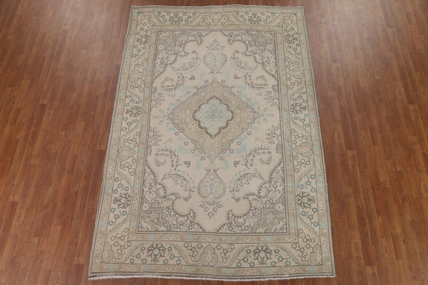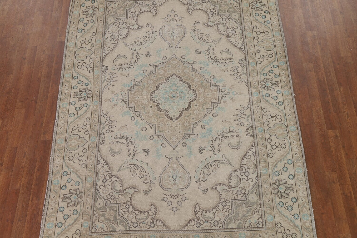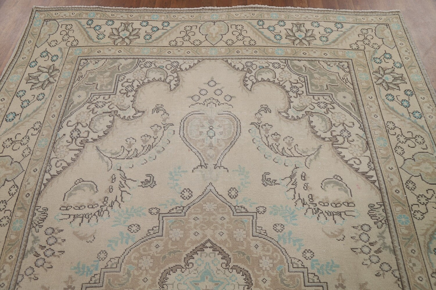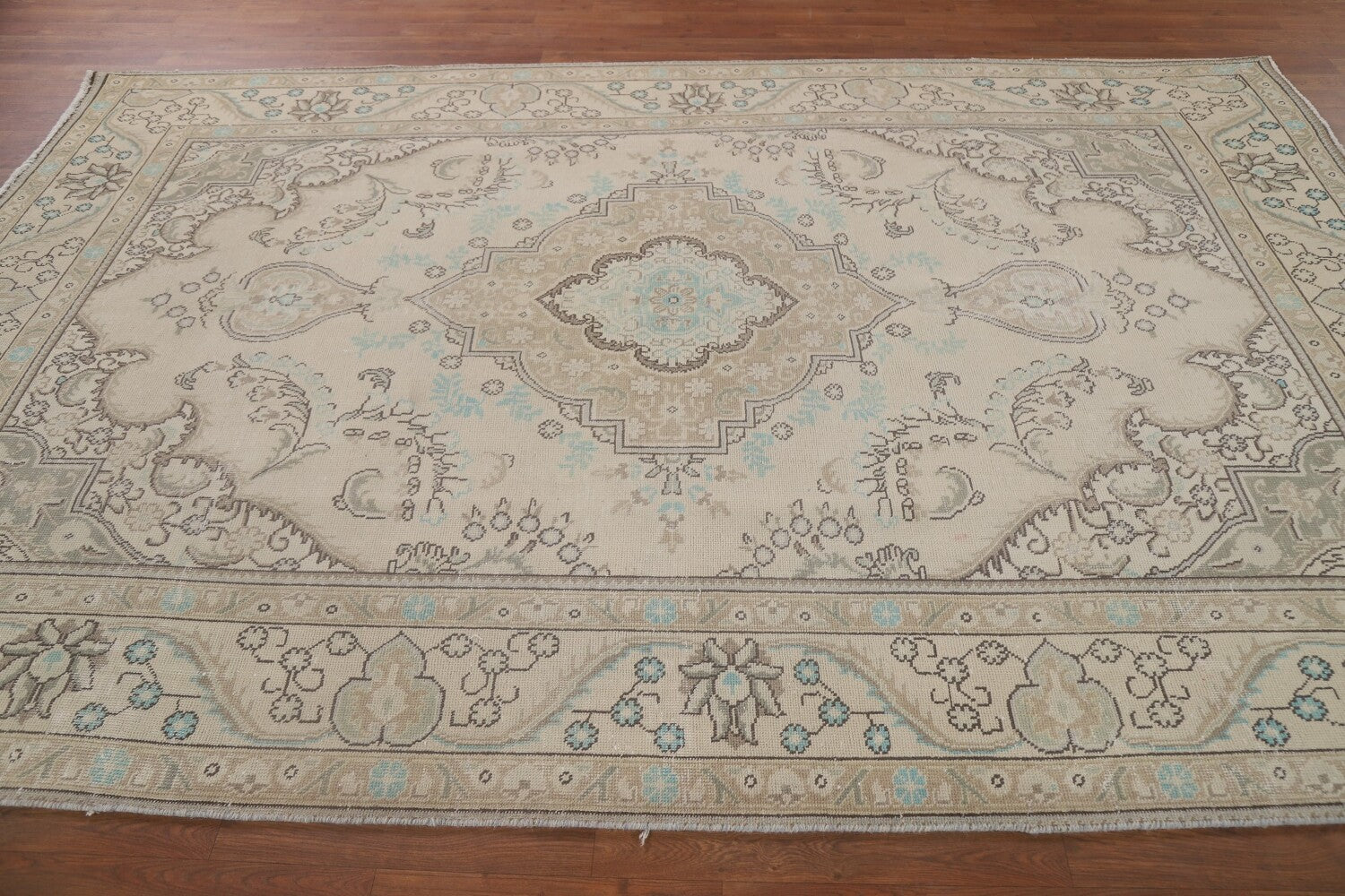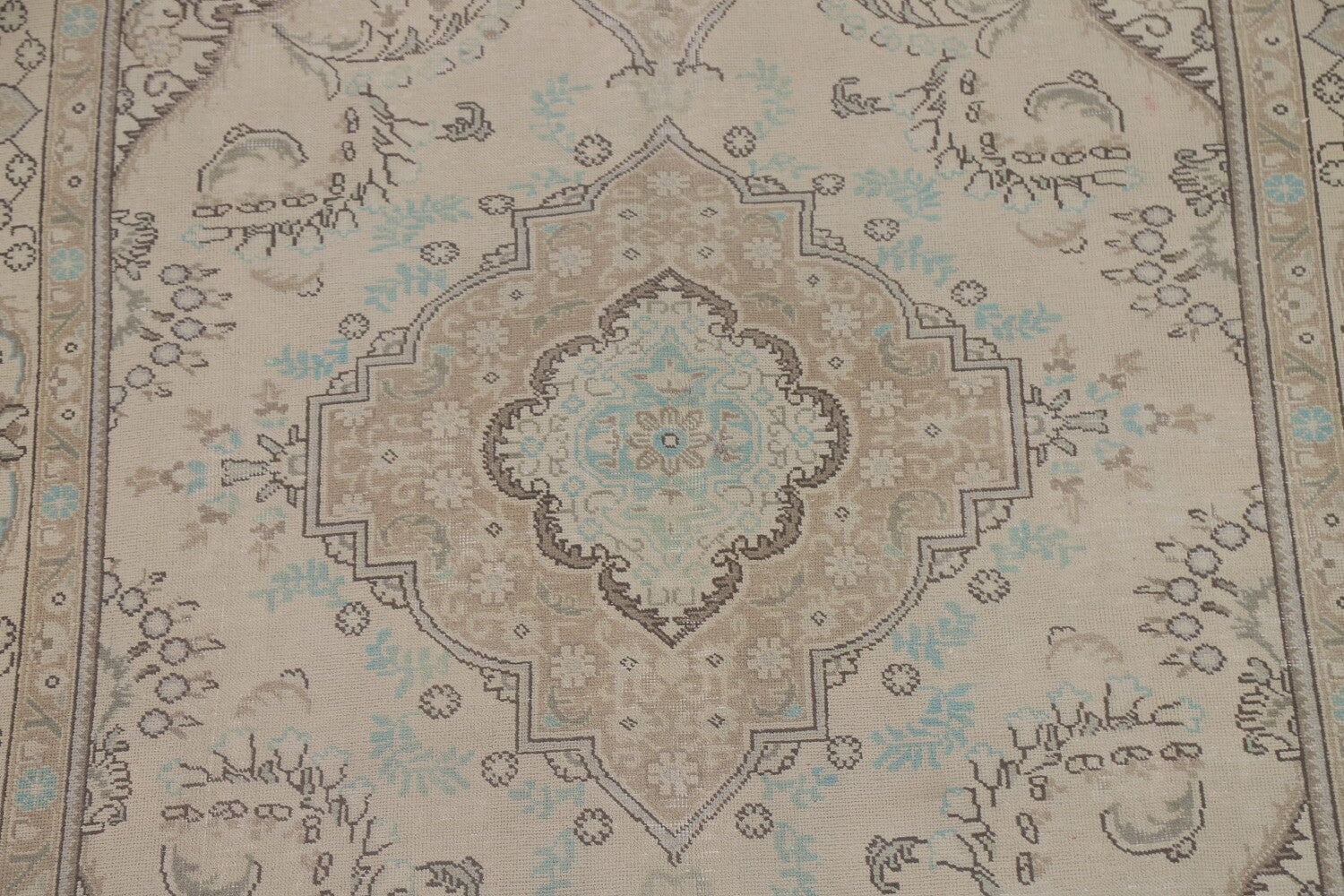 A Beautiful Genuine Persia ( Persia ) Tabriz rug is Hand Knotted by skillful weavers in Persia ( Persia ) with 100% Wool Material. This rug is in Very Good (Low Pile) condition. dimensions are 9' 8'' X 6' 5'' in foot and 295 X 196 in centimeter. the primary color is Beige & Ivories.