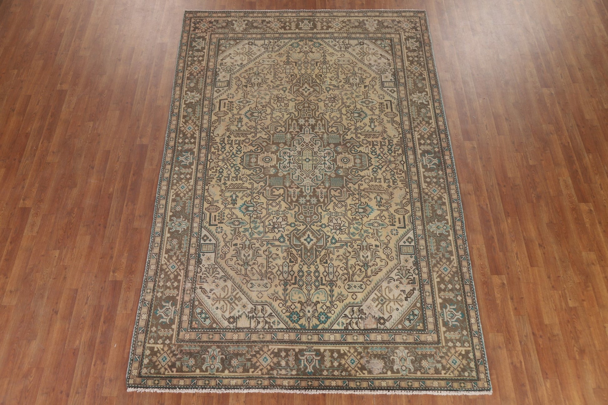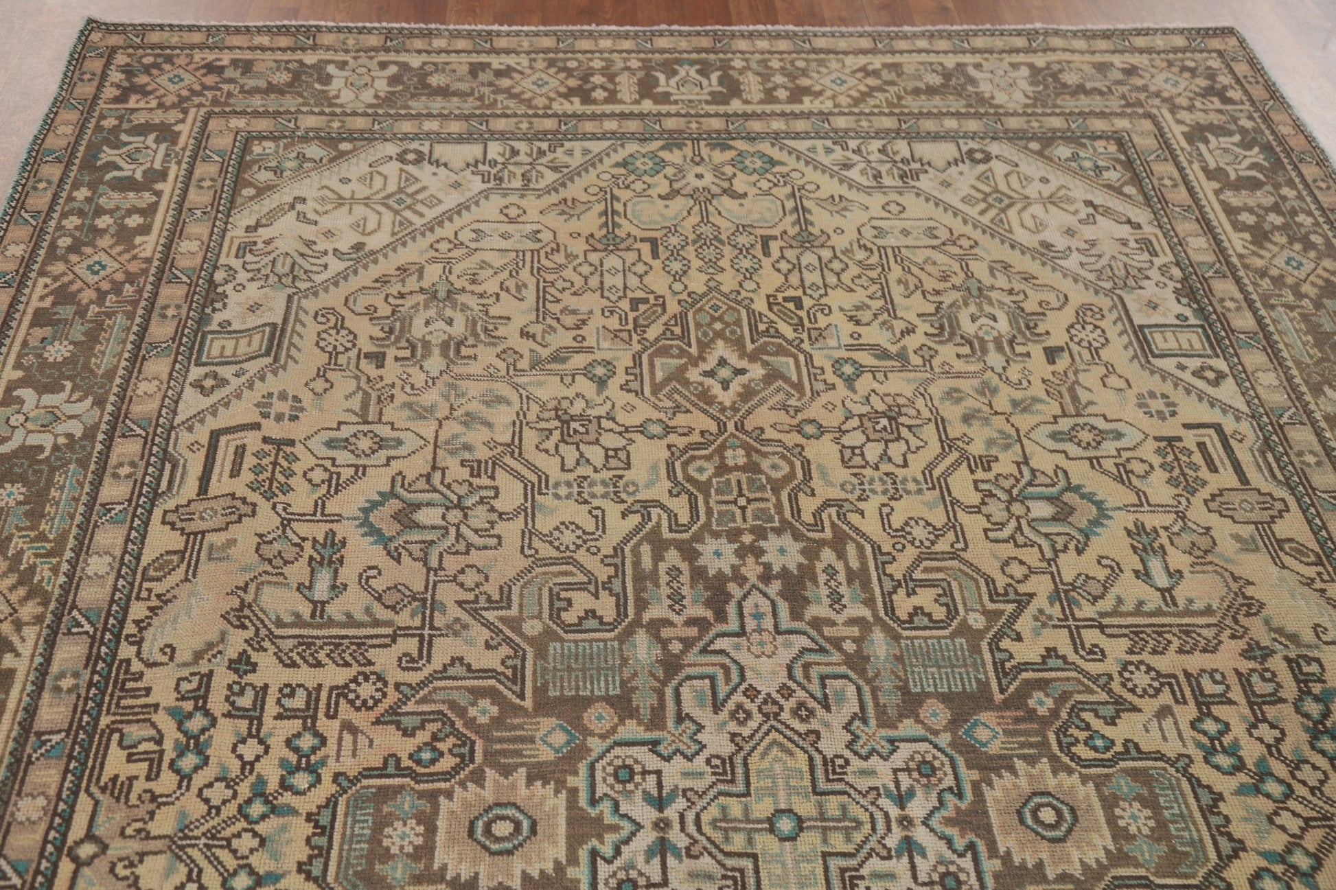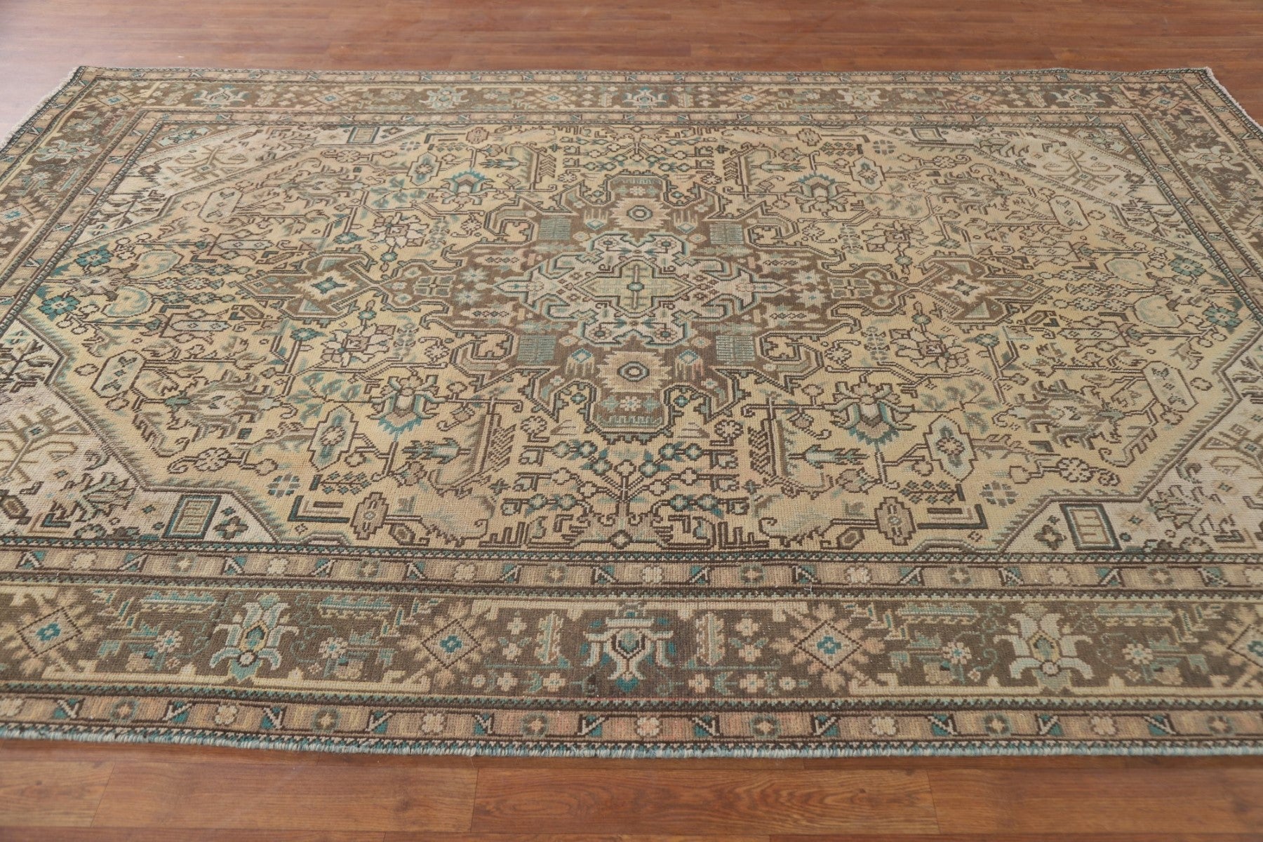 A Beautiful Genuine Persia ( Persia ) Tabriz rug is Hand Knotted by skillful weavers in Persia ( Persia ) with 100% Wool Material. This rug is in Very Good (Low Pile) condition. dimensions are 9' 10'' X 6' 4'' in foot and 300 X 193 in centimeter. the primary color is Peach.