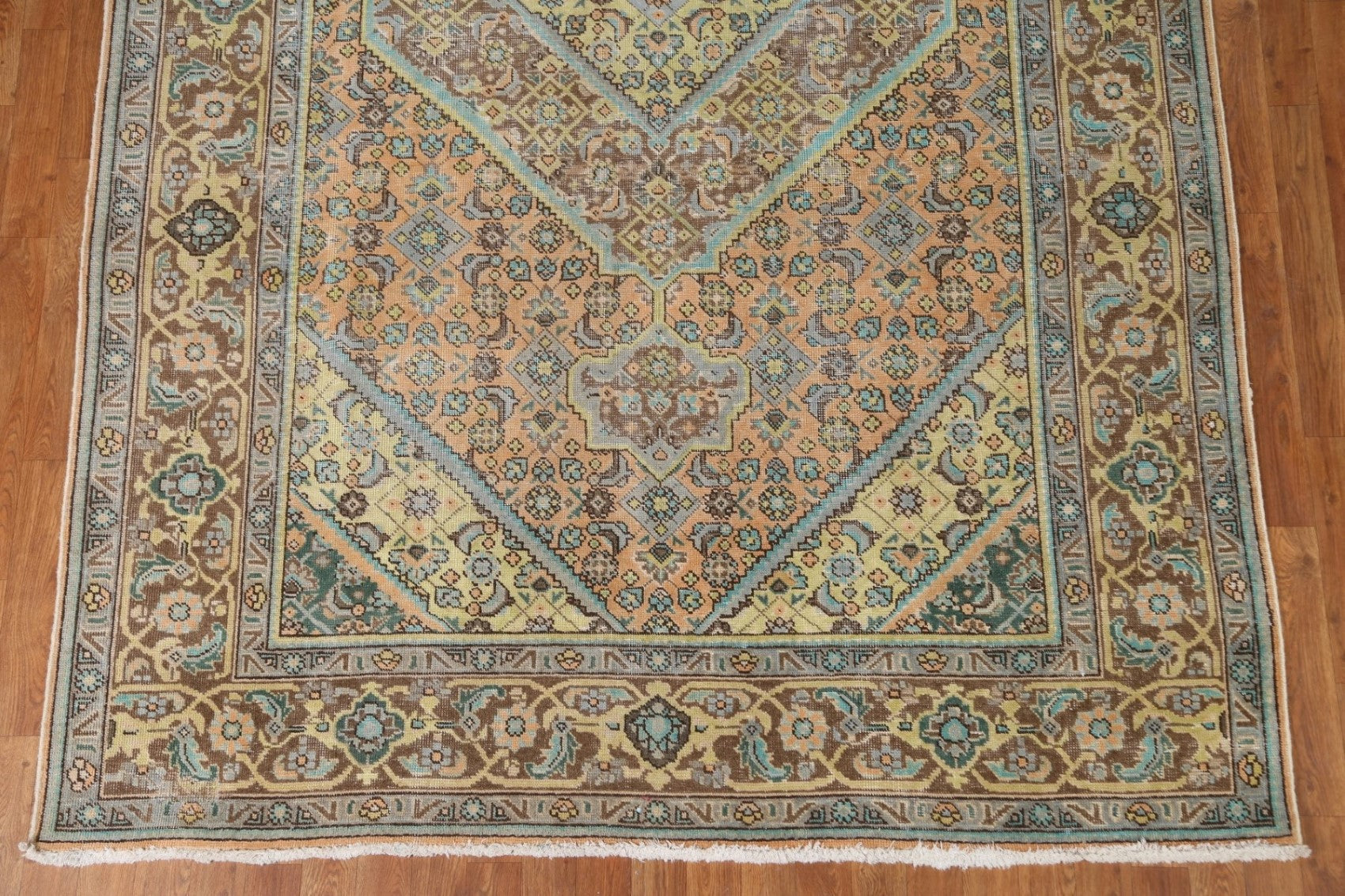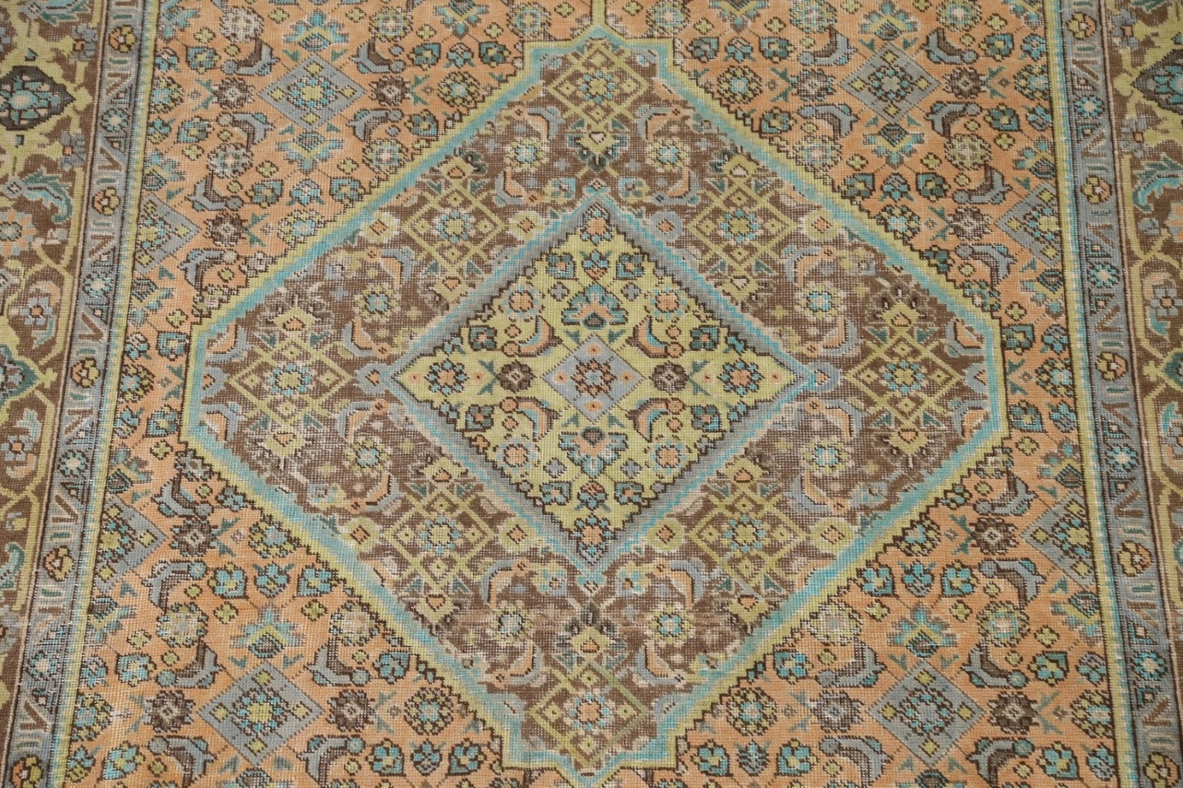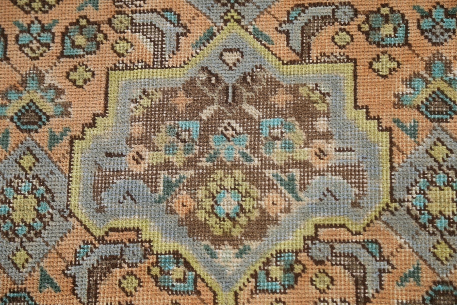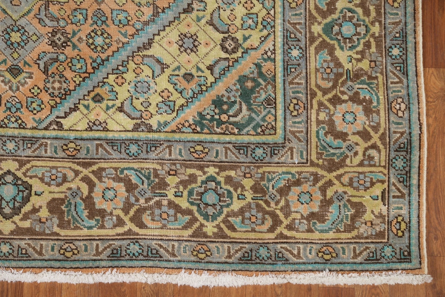 A Beautiful Genuine Persia ( Persia ) Tabriz rug is Hand Knotted by skillful weavers in Persia ( Persia ) with 100% Wool Material. This rug is in Very Good (Evenly Low Pile) condition. dimensions are 9' 11'' X 6' 5'' in foot and 302 X 196 in centimeter. the primary color is Peach.
