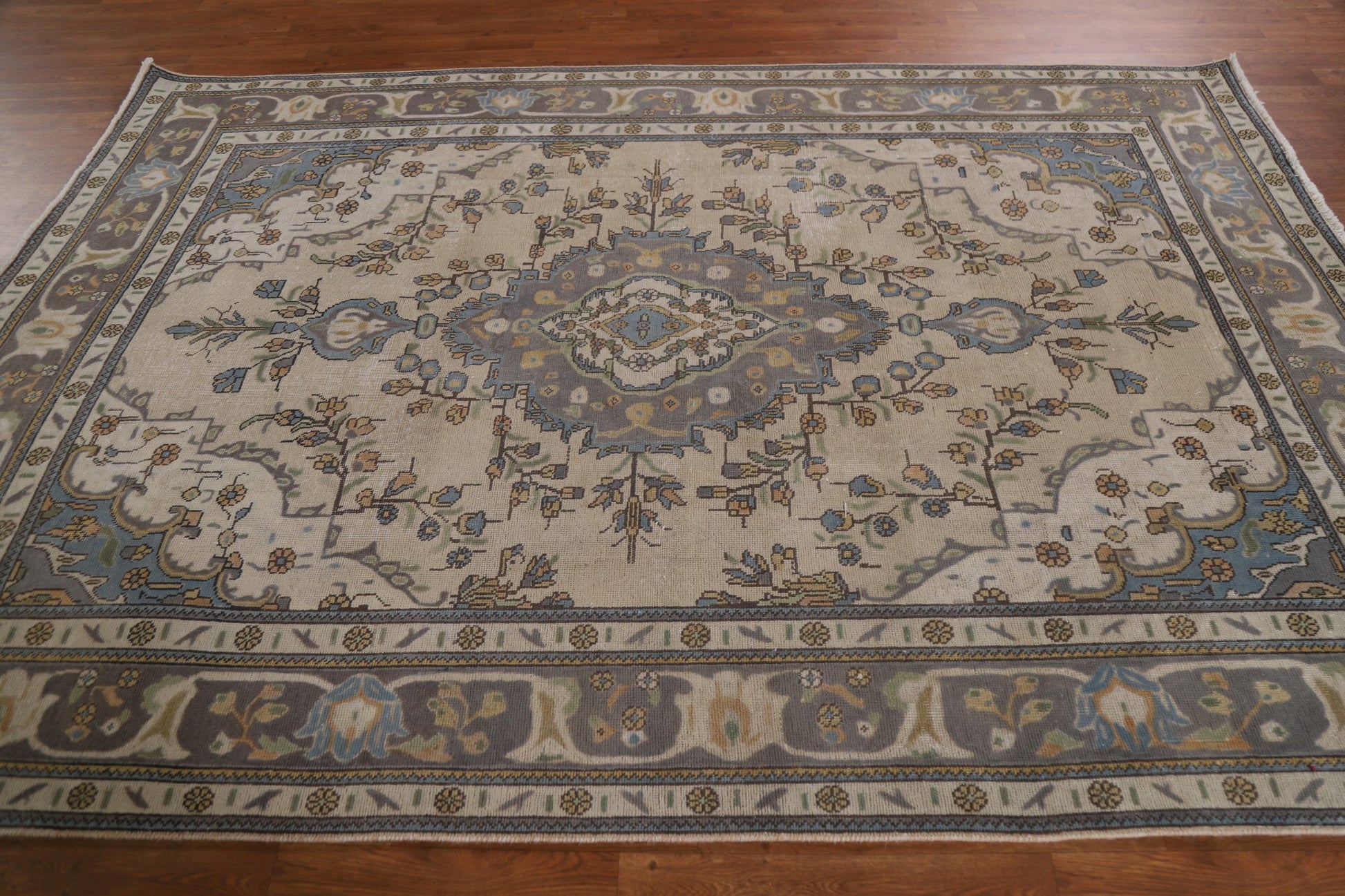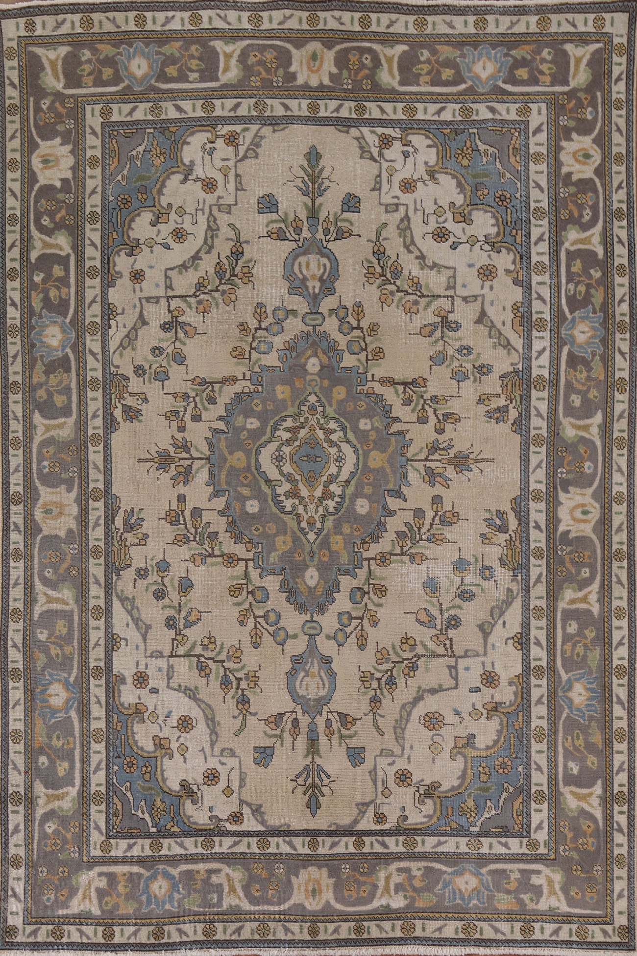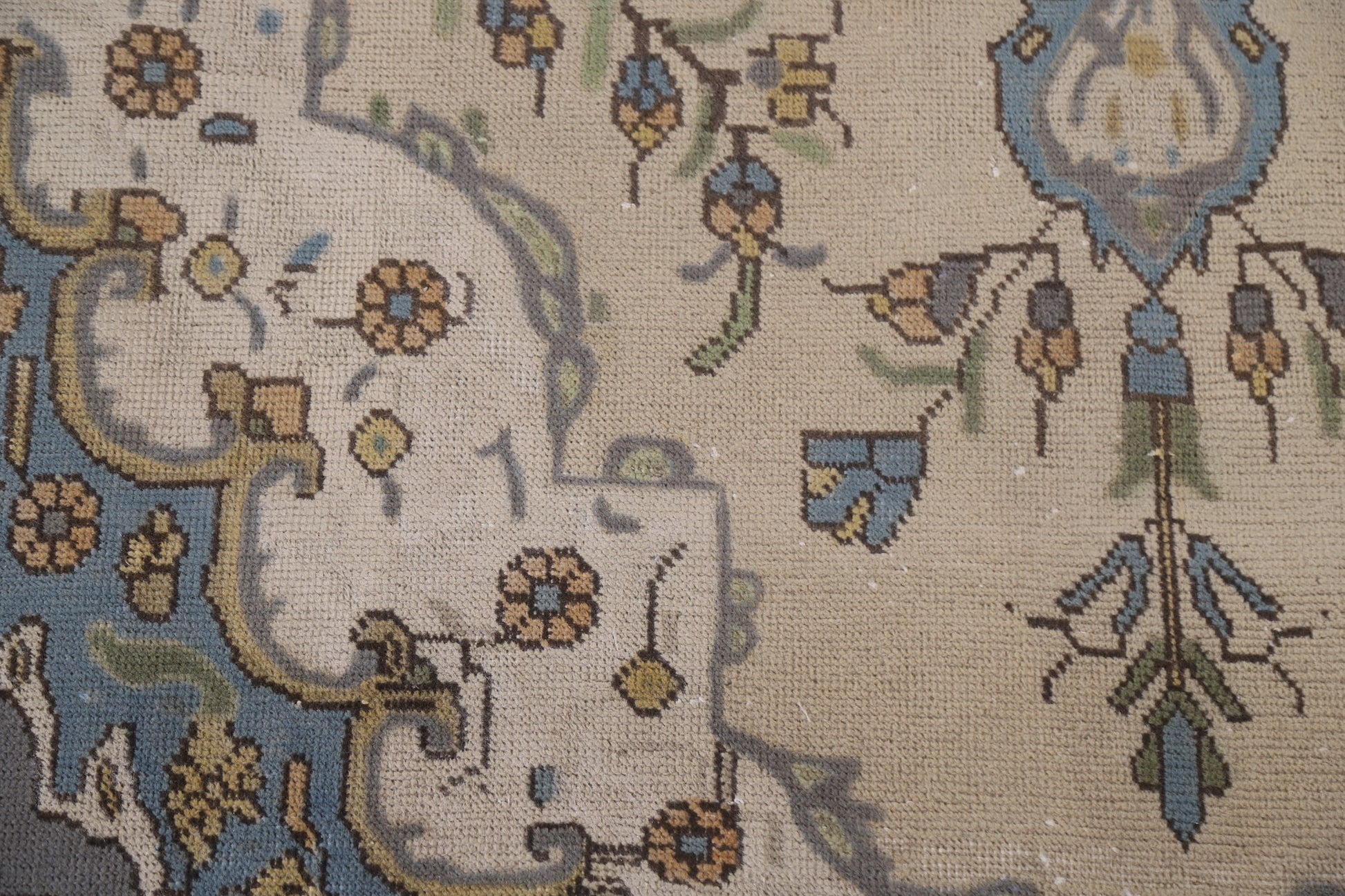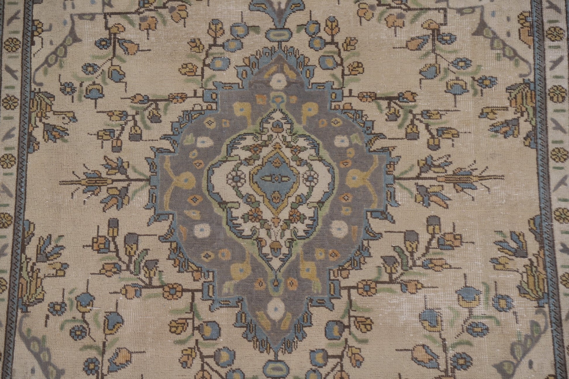 A Beautiful Genuine Persia ( Persia ) Tabriz rug is Hand Knotted by skillful weavers in Persia ( Persia ) with 100% Wool Material. This rug is in Very Good (Evenly Low Pile) condition. dimensions are 9' 6'' X 6' 5'' in foot and 290 X 196 in centimeter. the primary color is Beige & Ivories.