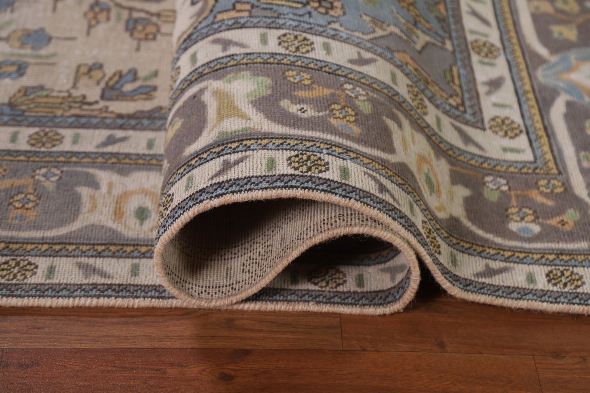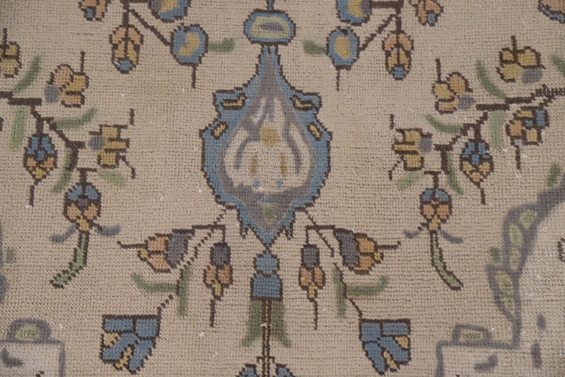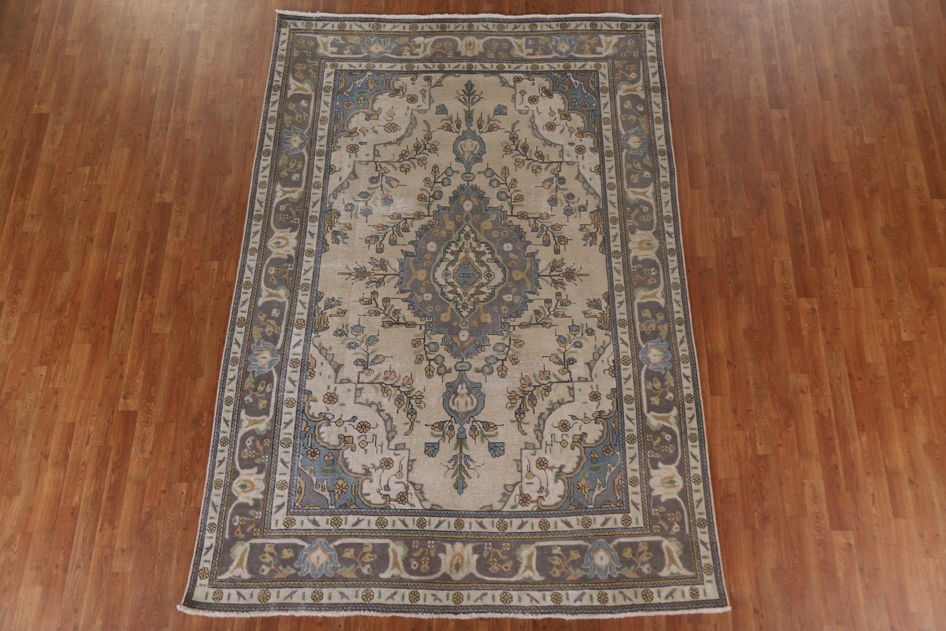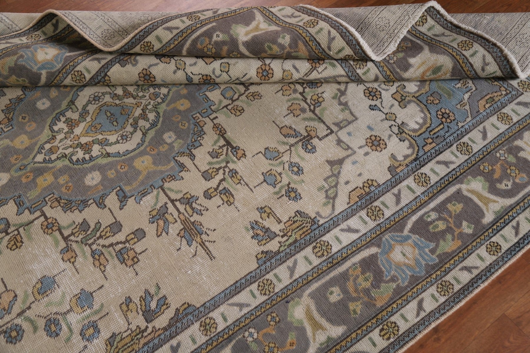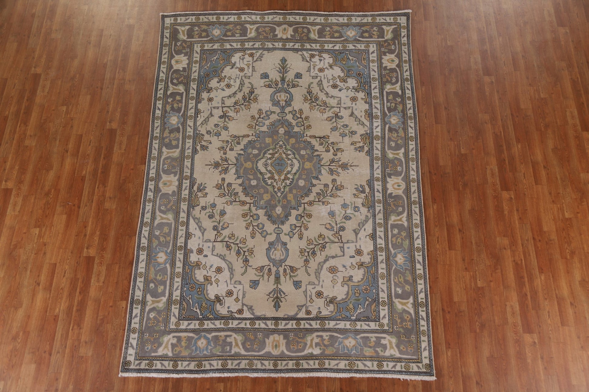 A Beautiful Genuine Persia ( Persia ) Tabriz rug is Hand Knotted by skillful weavers in Persia ( Persia ) with 100% Wool Material. This rug is in Very Good (Evenly Low Pile) condition. dimensions are 9' 6'' X 6' 5'' in foot and 290 X 196 in centimeter. the primary color is Beige & Ivories.
