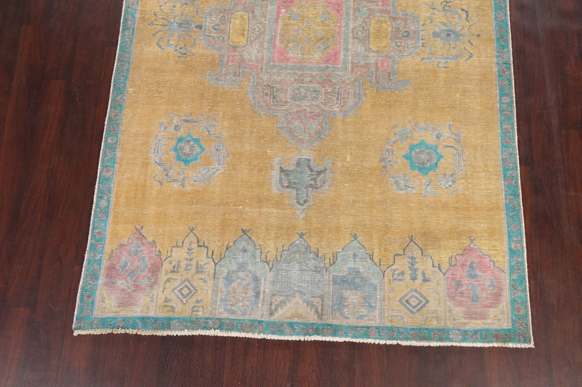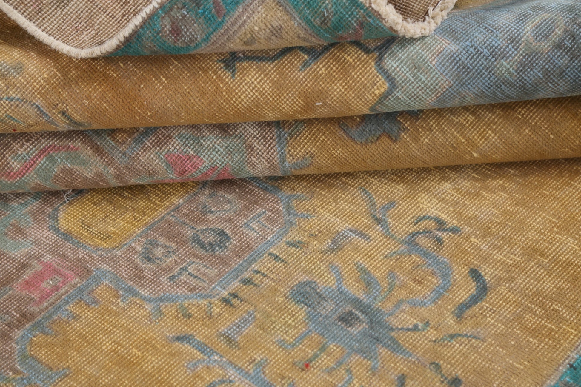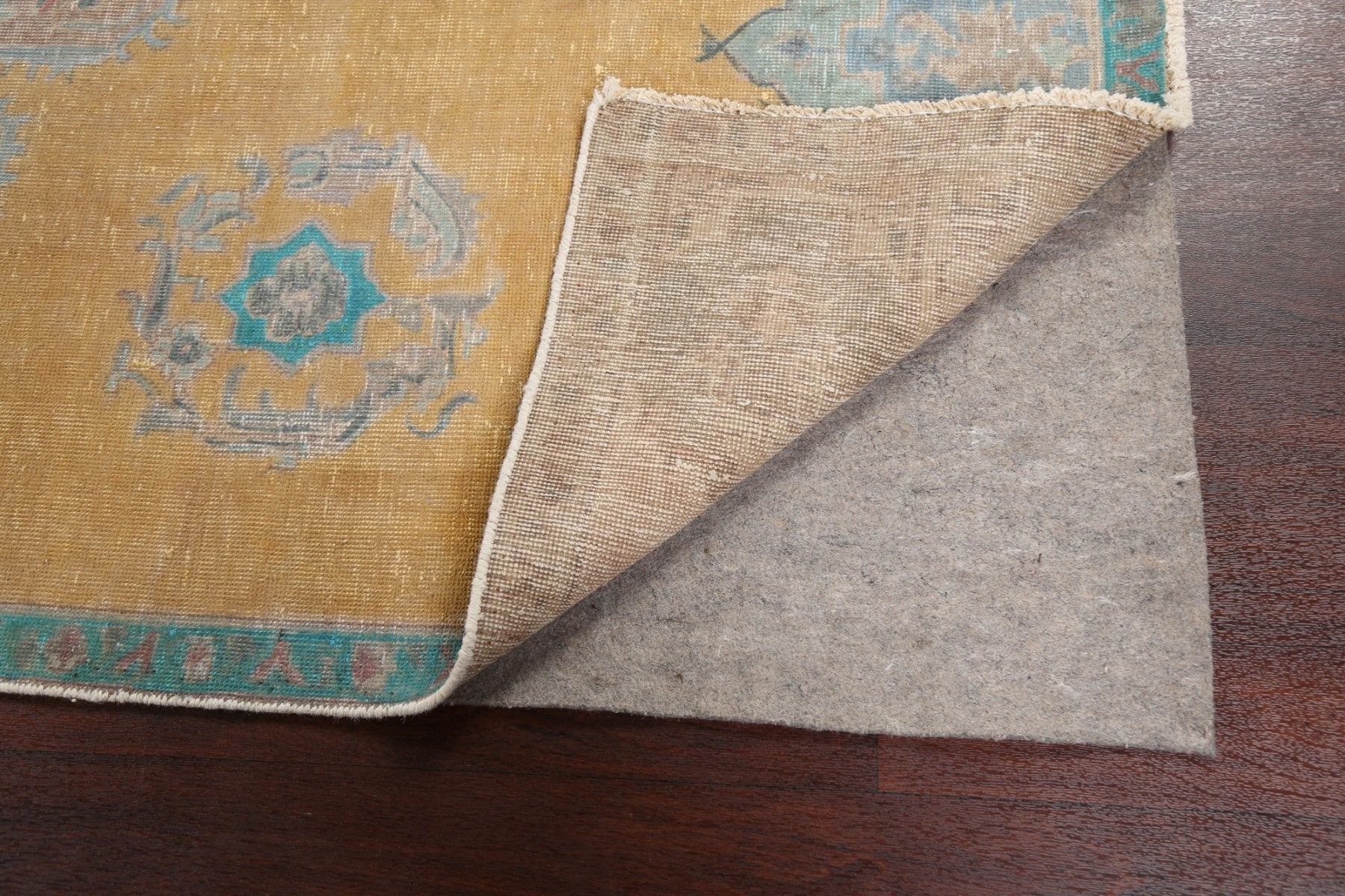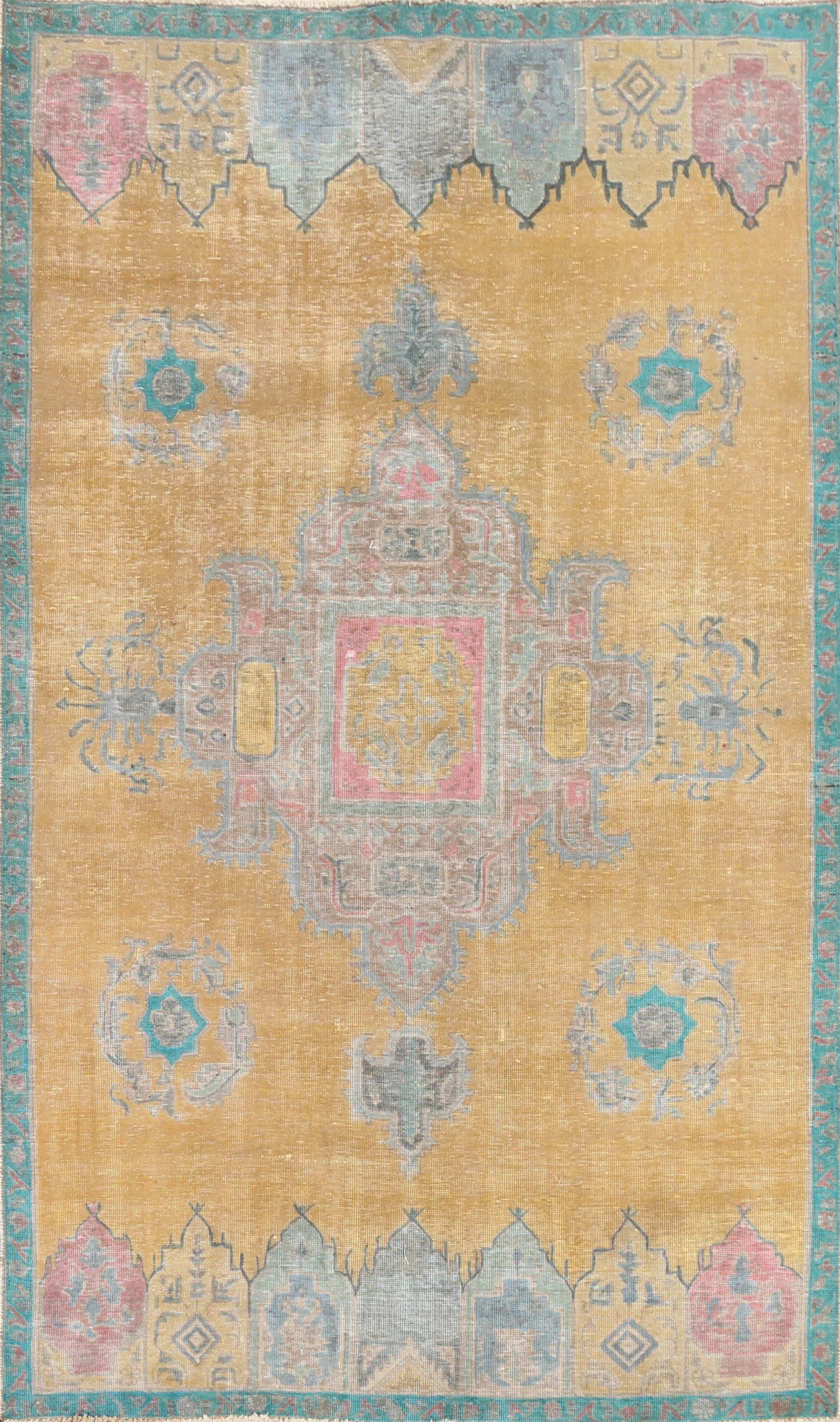 A Beautiful Genuine Persia ( Persia ) Tabriz rug is Hand Knotted by skillful weavers in Persia ( Persia ) with 100% Wool Material. This rug is in Very Good (Evenly Low Pile) condition. dimensions are 8' 10'' X 5' 9'' in foot and 269 X 175 in centimeter. the primary color is Yellow & Gold.