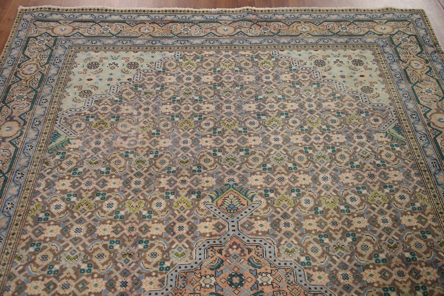 A Beautiful Genuine Persia ( Persia ) Tabriz rug is Hand Knotted by skillful weavers in Persia ( Persia ) with 100% Wool Material. This rug is in Very Good (Evenly Low Pile-Repair) condition. dimensions are 9' 5'' X 6' 2'' in foot and 287 X 188 in centimeter. the primary color is Brown.