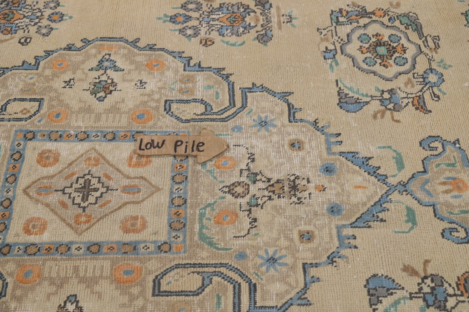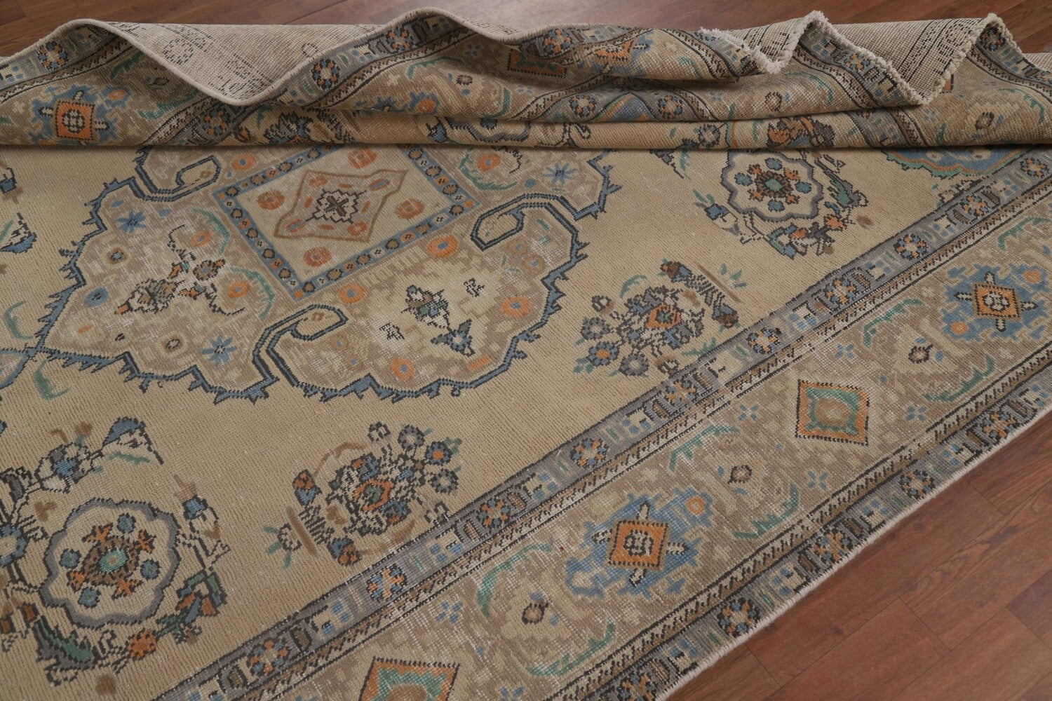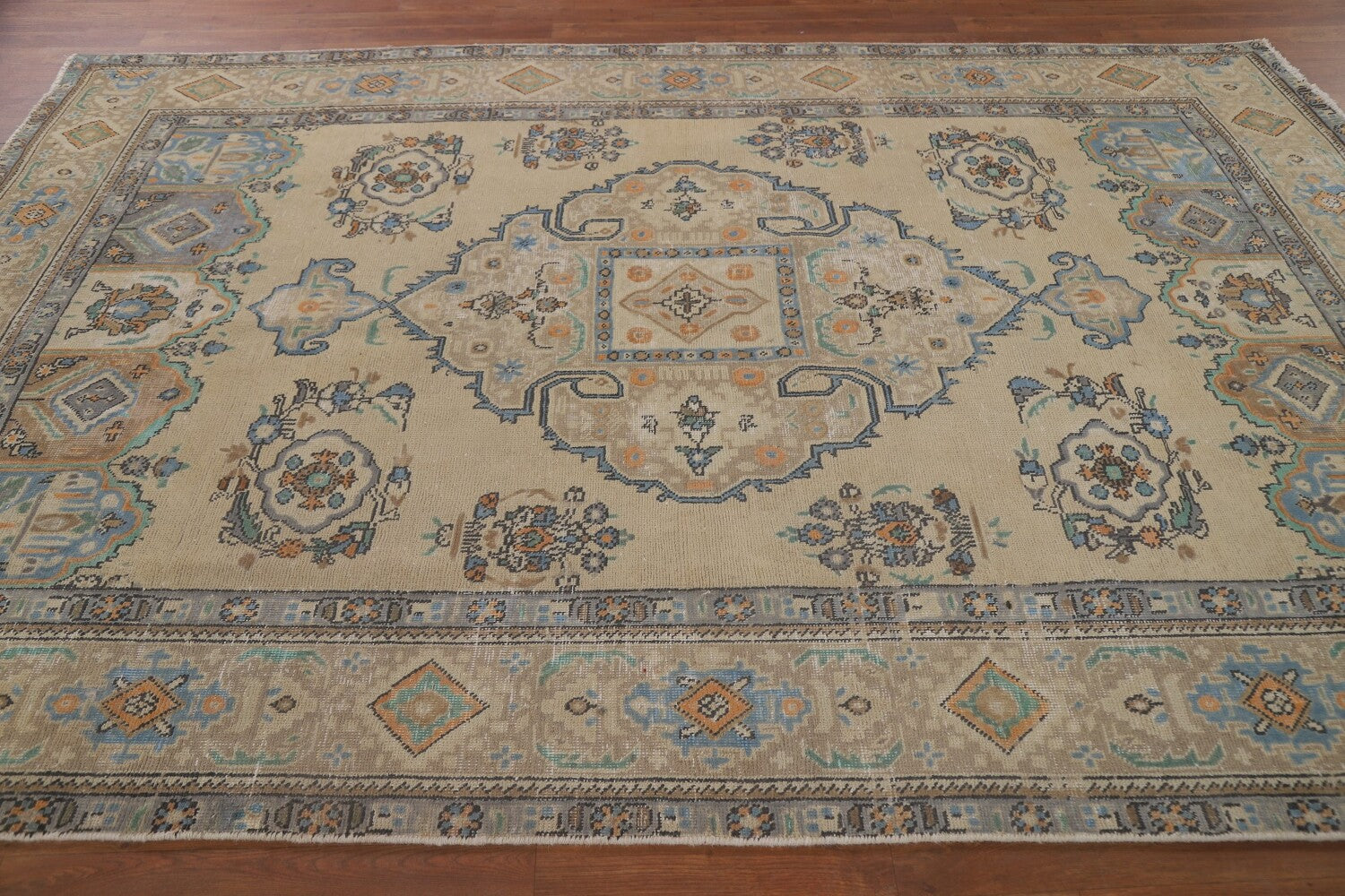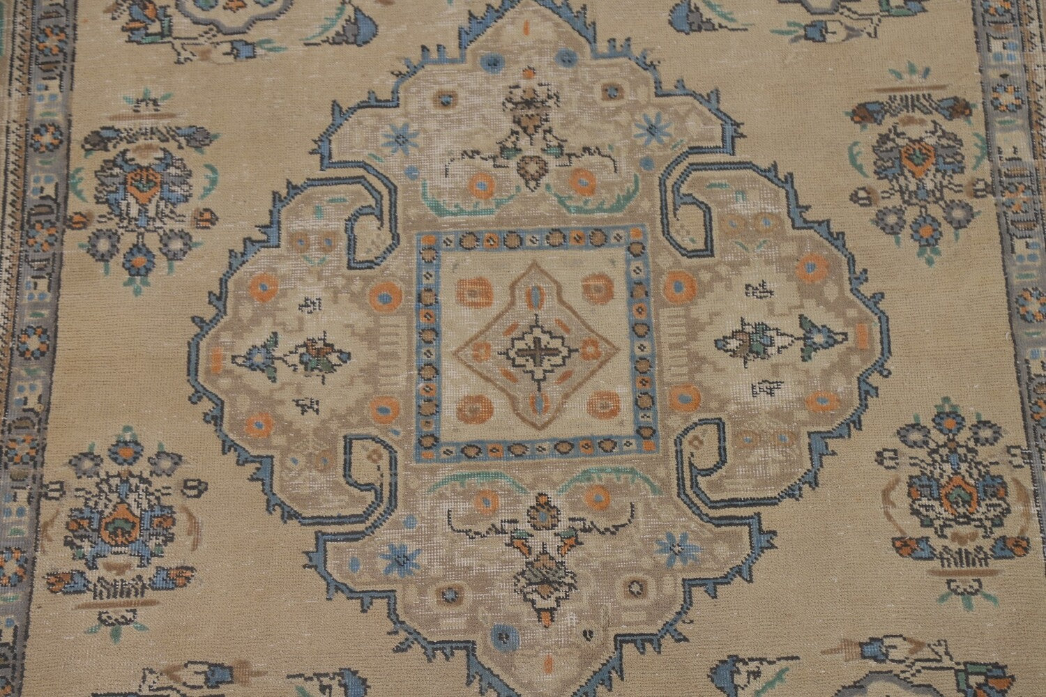 A Beautiful Genuine Persia ( Persia ) Tabriz rug is Hand Knotted by skillful weavers in Persia ( Persia ) with 100% Wool Material. This rug is in Very Good (Low Pile-Repair) condition. dimensions are 9' 5'' X 6' 5'' in foot and 287 X 196 in centimeter. the primary color is Beige & Ivories.