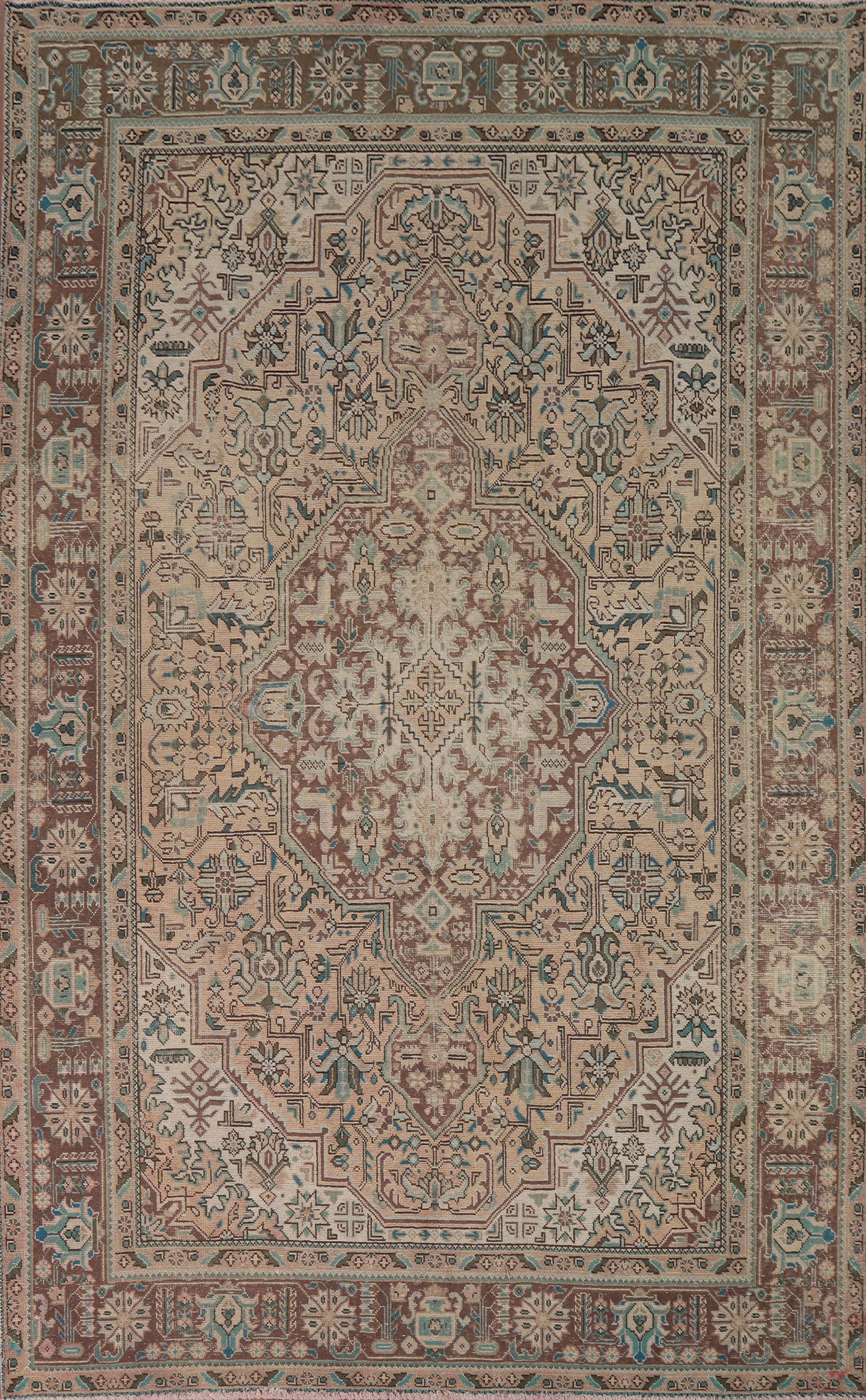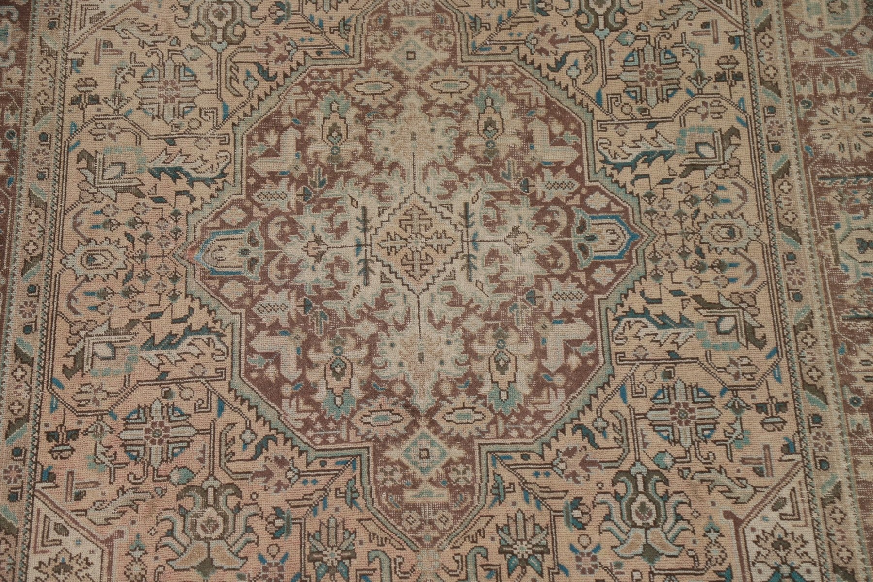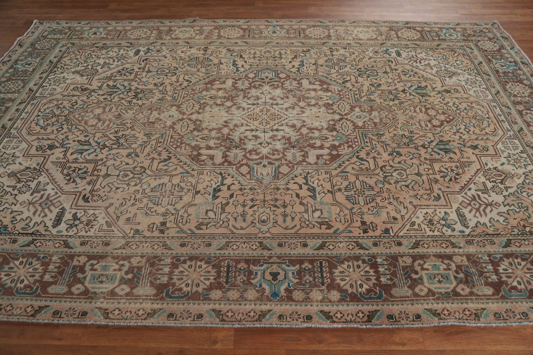 A Beautiful Genuine Persia ( Persia ) Tabriz rug is Hand Knotted by skillful weavers in Persia ( Persia ) with 100% Wool Material. This rug is in Very Good (Evenly Low Pile) condition. dimensions are 9' 7'' X 6' 6'' in foot and 292 X 198 in centimeter. the primary color is Peach.