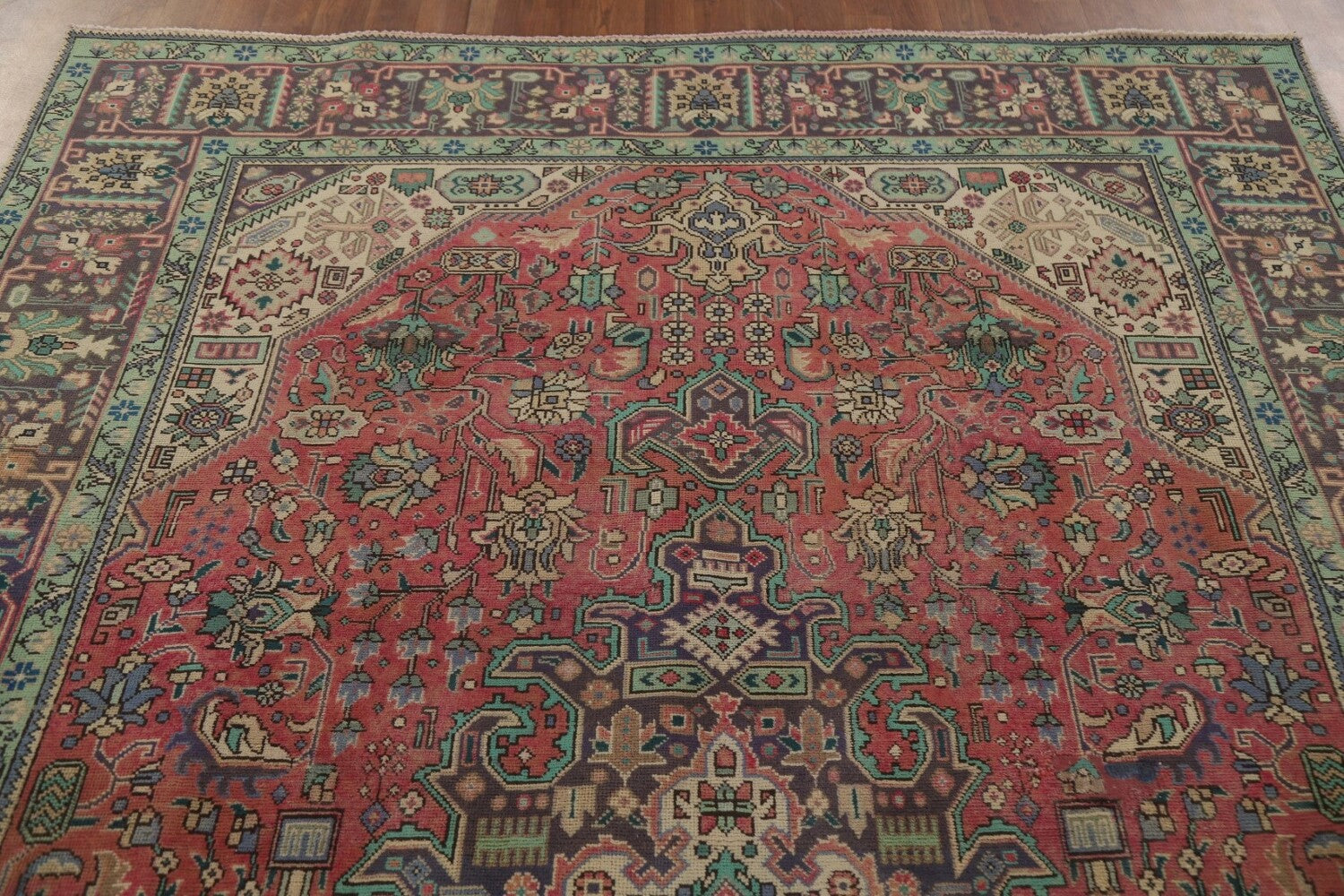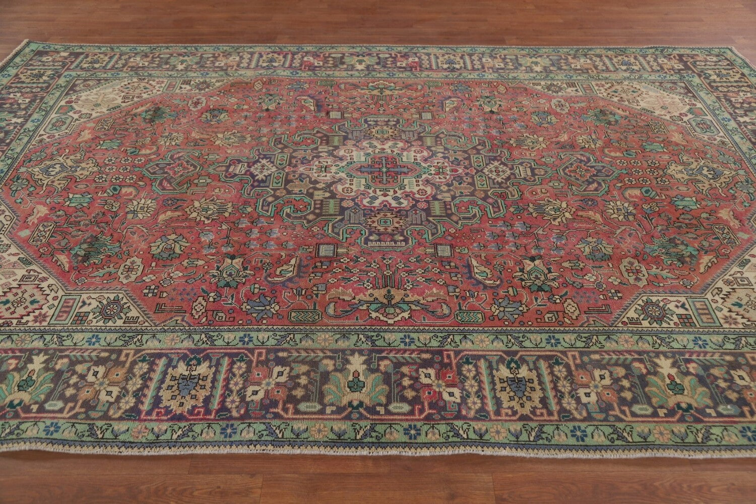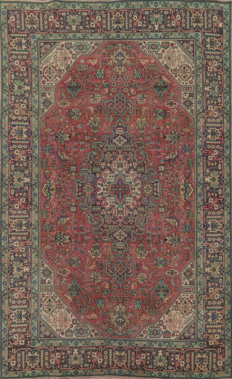 A Beautiful Genuine Persia ( Persia ) Tabriz rug is Hand Knotted by skillful weavers in Persia ( Persia ) with 100% Wool Material. This rug is in Very Good (Repair) condition. dimensions are 9' 10'' X 6' 6'' in foot and 300 X 198 in centimeter. the primary color is Pink.