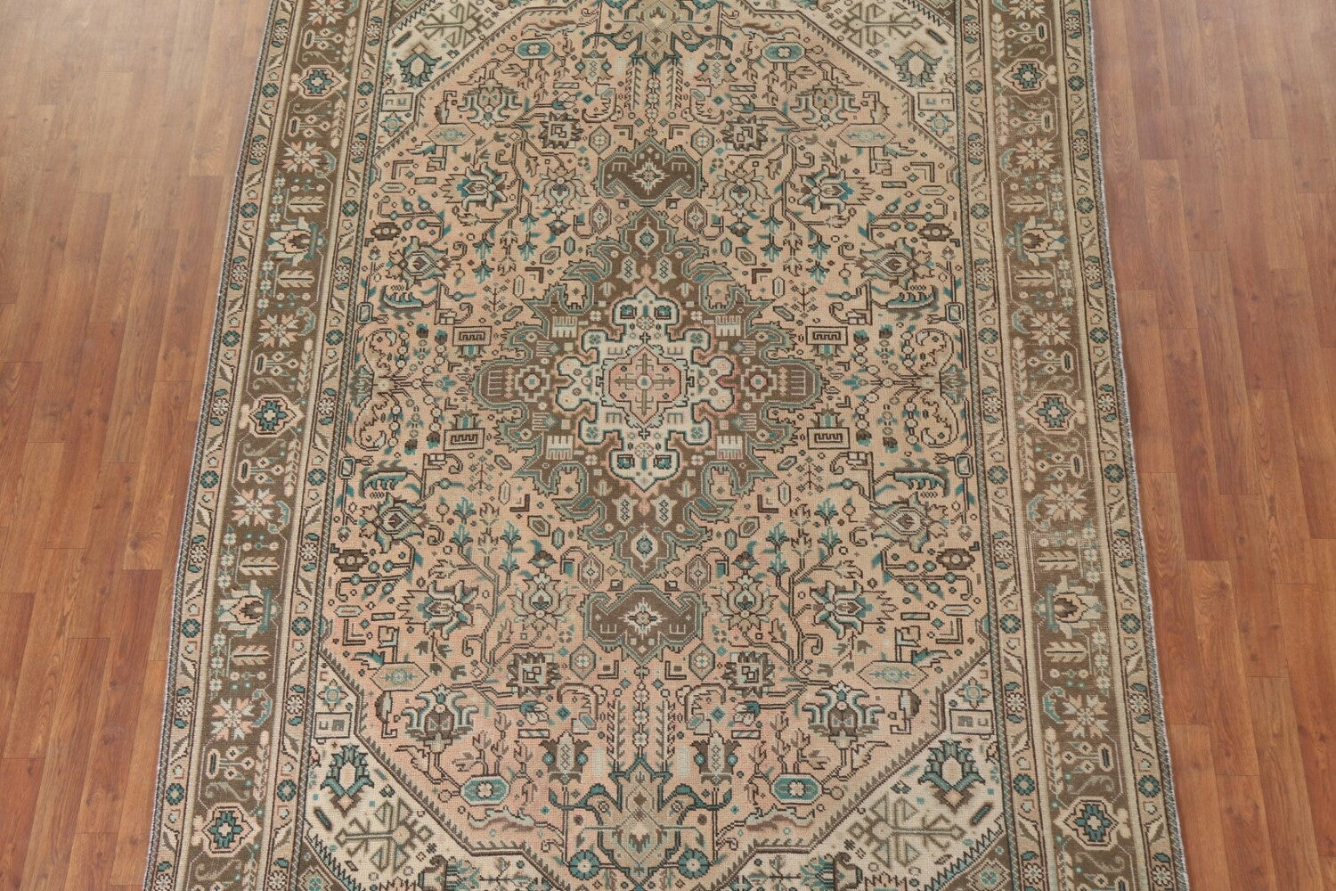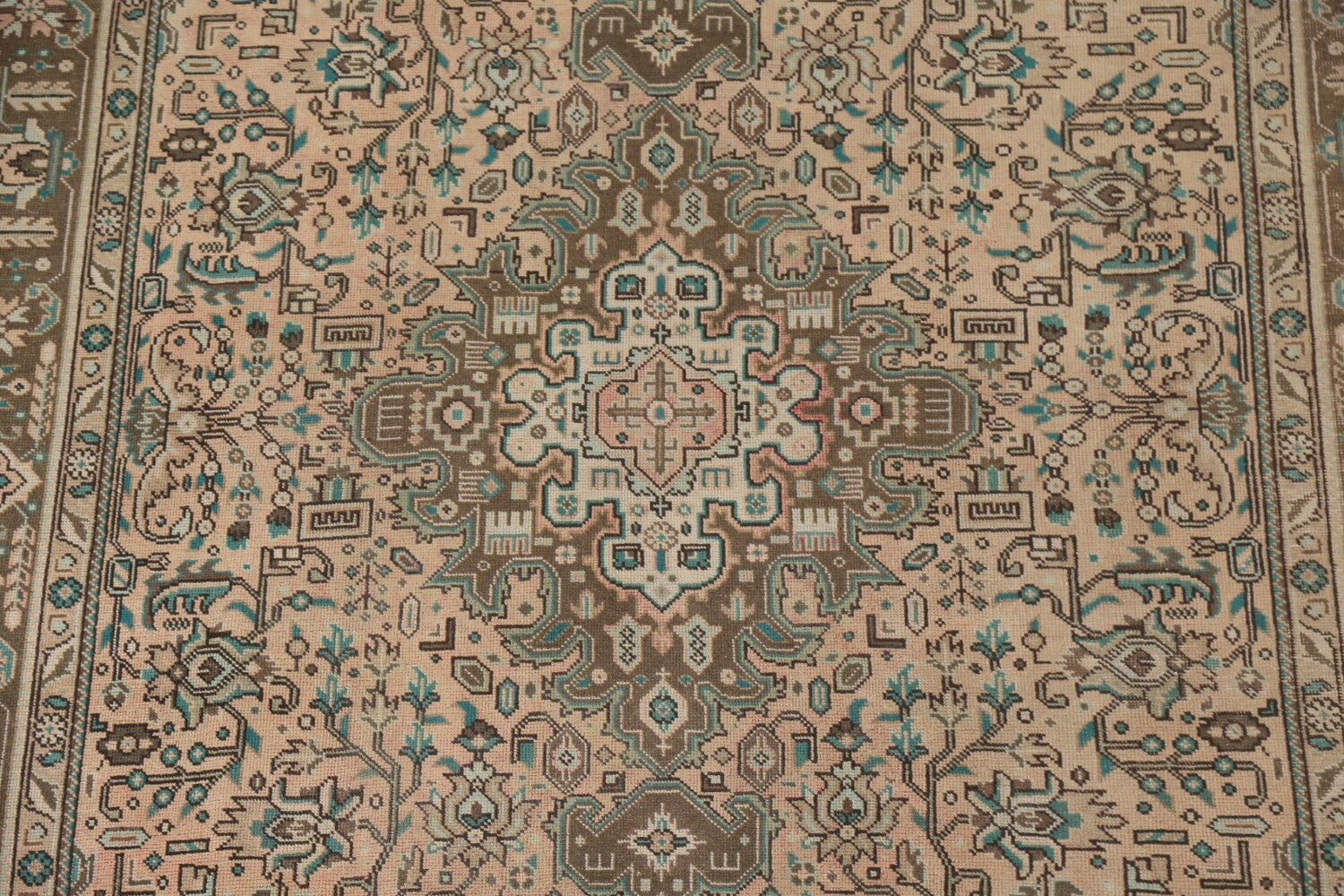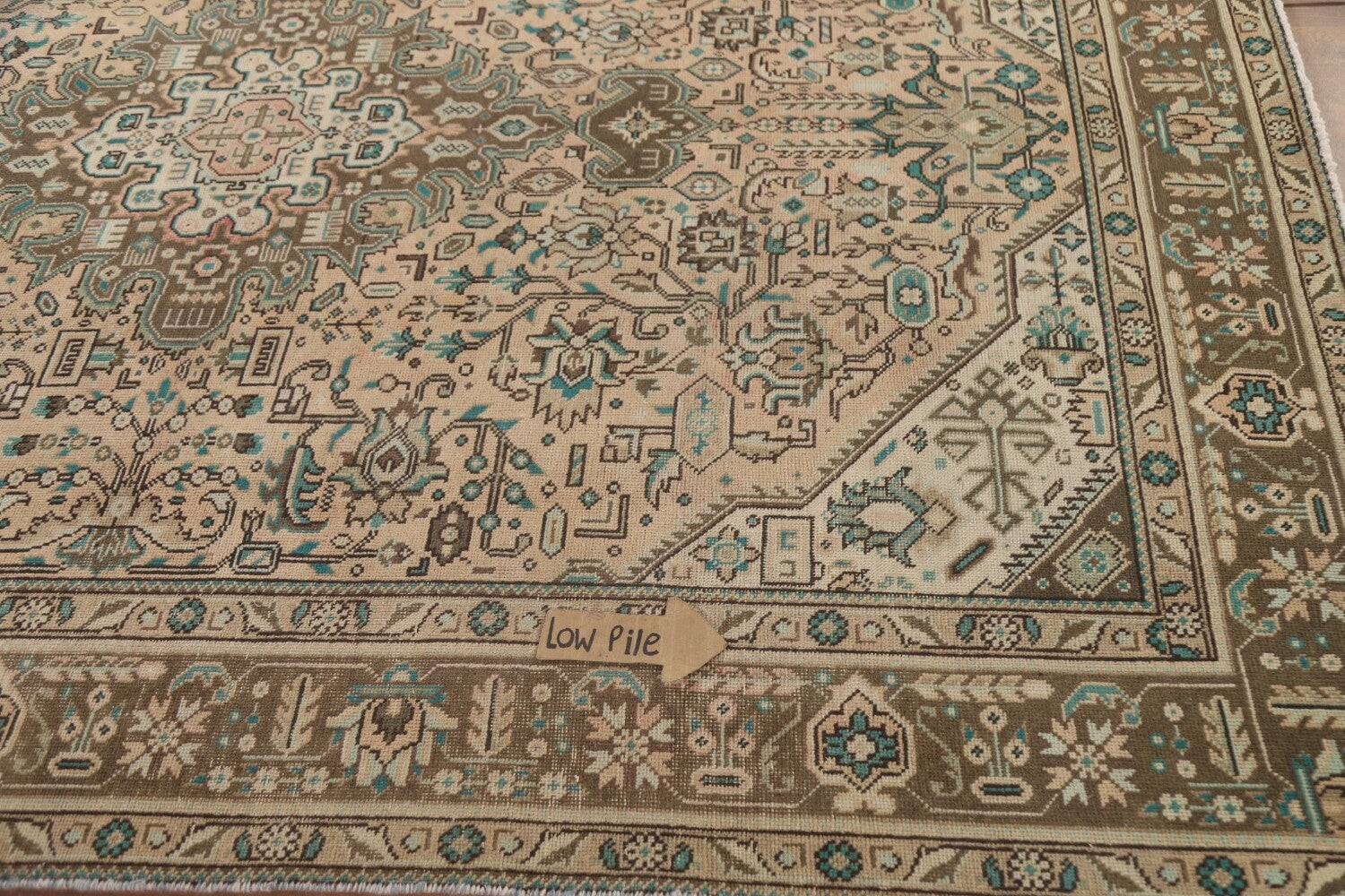 A Beautiful Genuine Persia ( Persia ) Tabriz rug is Hand Knotted by skillful weavers in Persia ( Persia ) with 100% Wool Material. This rug is in Very Good (Low Pile) condition. dimensions are 9' 5'' X 6' 7'' in foot and 287 X 201 in centimeter. the primary color is Peach.
