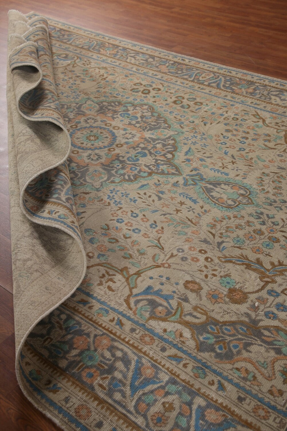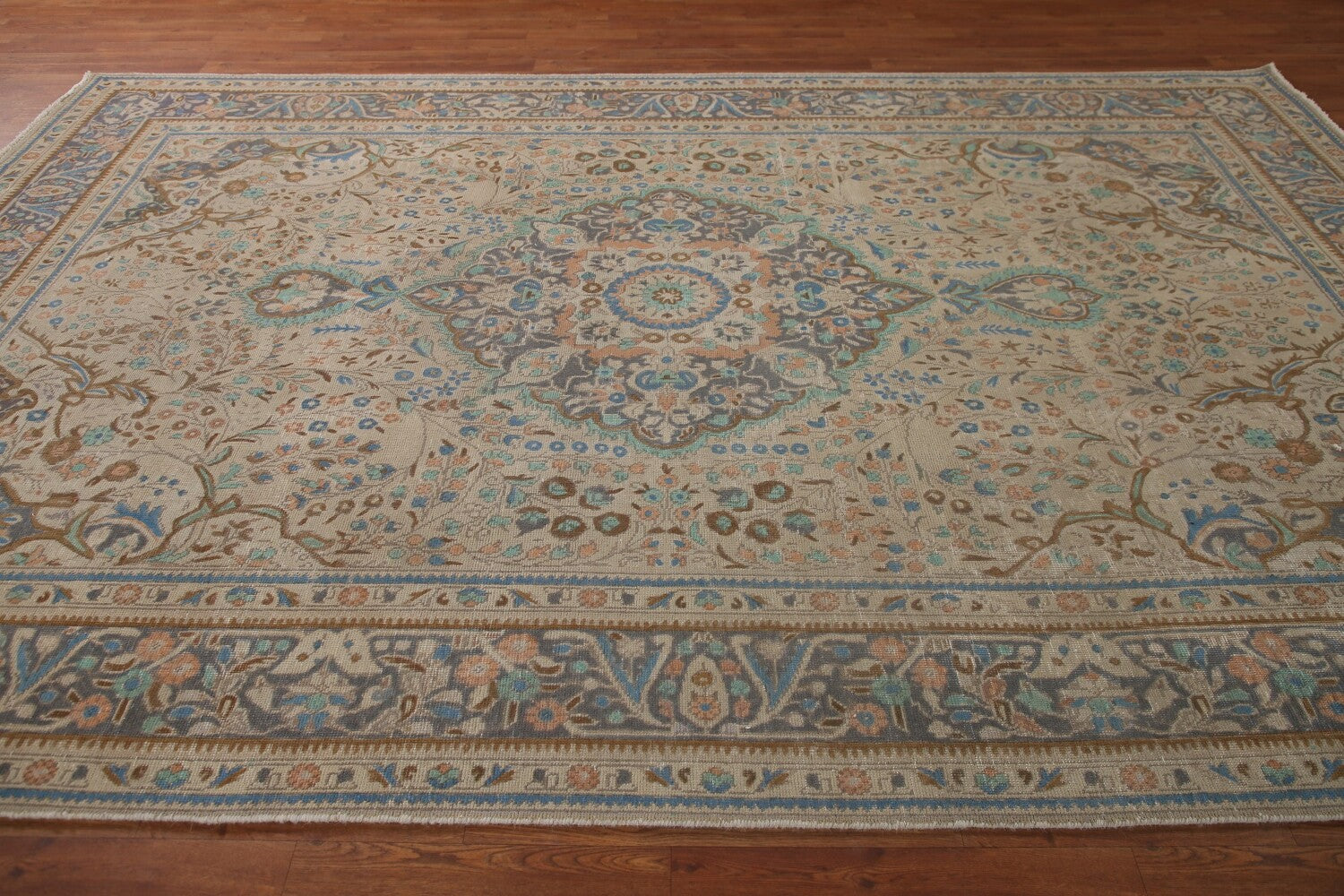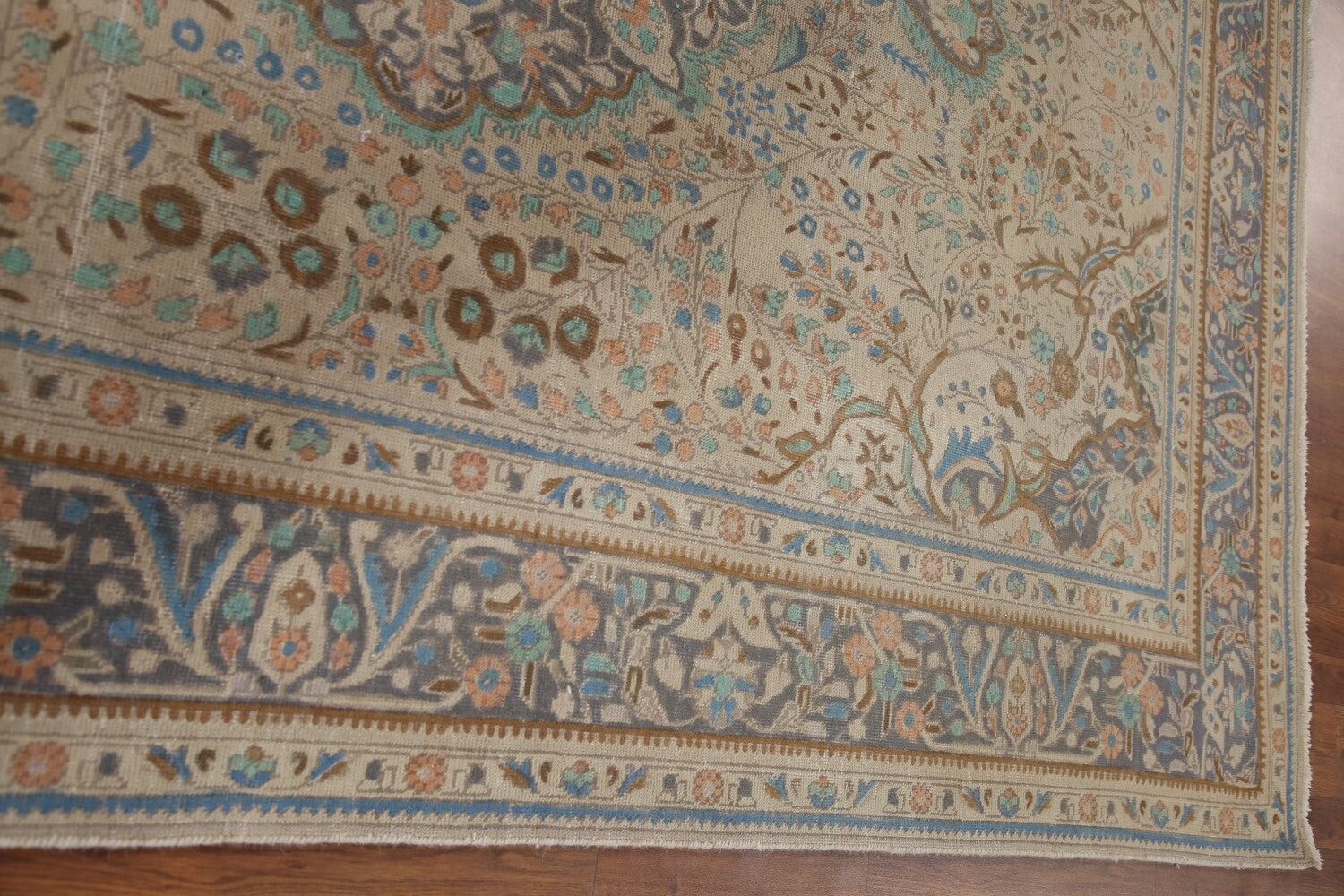 A Beautiful Genuine Persia ( Persia ) Tabriz rug is Hand Knotted by skillful weavers in Persia ( Persia ) with 100% Wool Material. This rug is in Very Good (Evenly Low Pile) condition. dimensions are 11' 3'' X 7' 6'' in foot and 343 X 229 in centimeter. the primary color is Beige & Ivories.