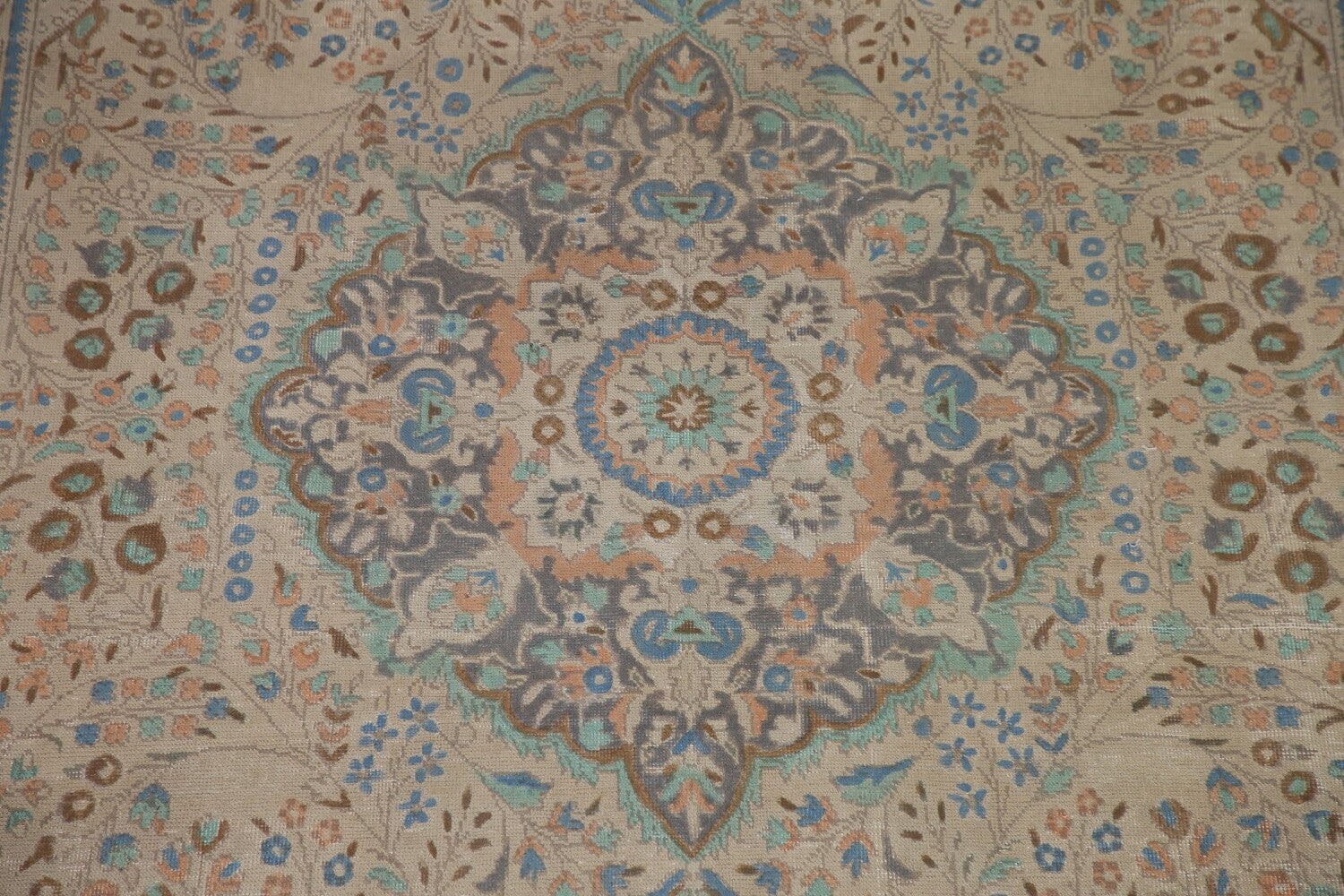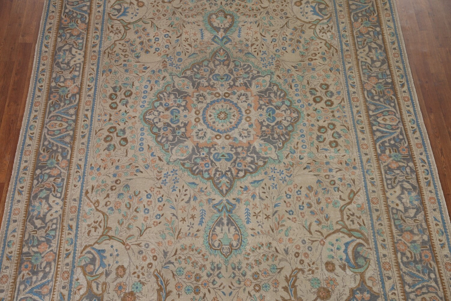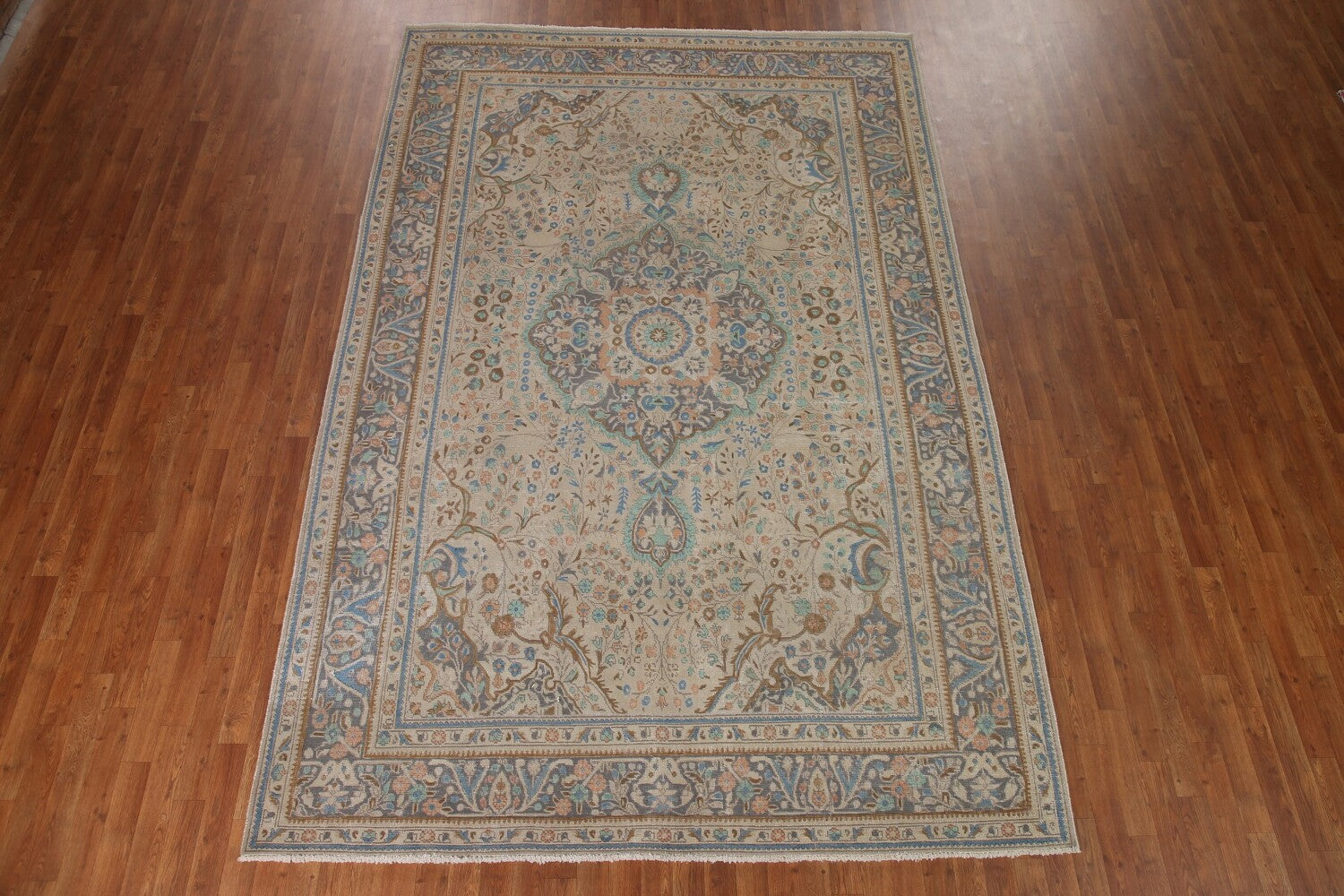 A Beautiful Genuine Persia ( Persia ) Tabriz rug is Hand Knotted by skillful weavers in Persia ( Persia ) with 100% Wool Material. This rug is in Very Good (Evenly Low Pile) condition. dimensions are 11' 3'' X 7' 6'' in foot and 343 X 229 in centimeter. the primary color is Beige & Ivories.