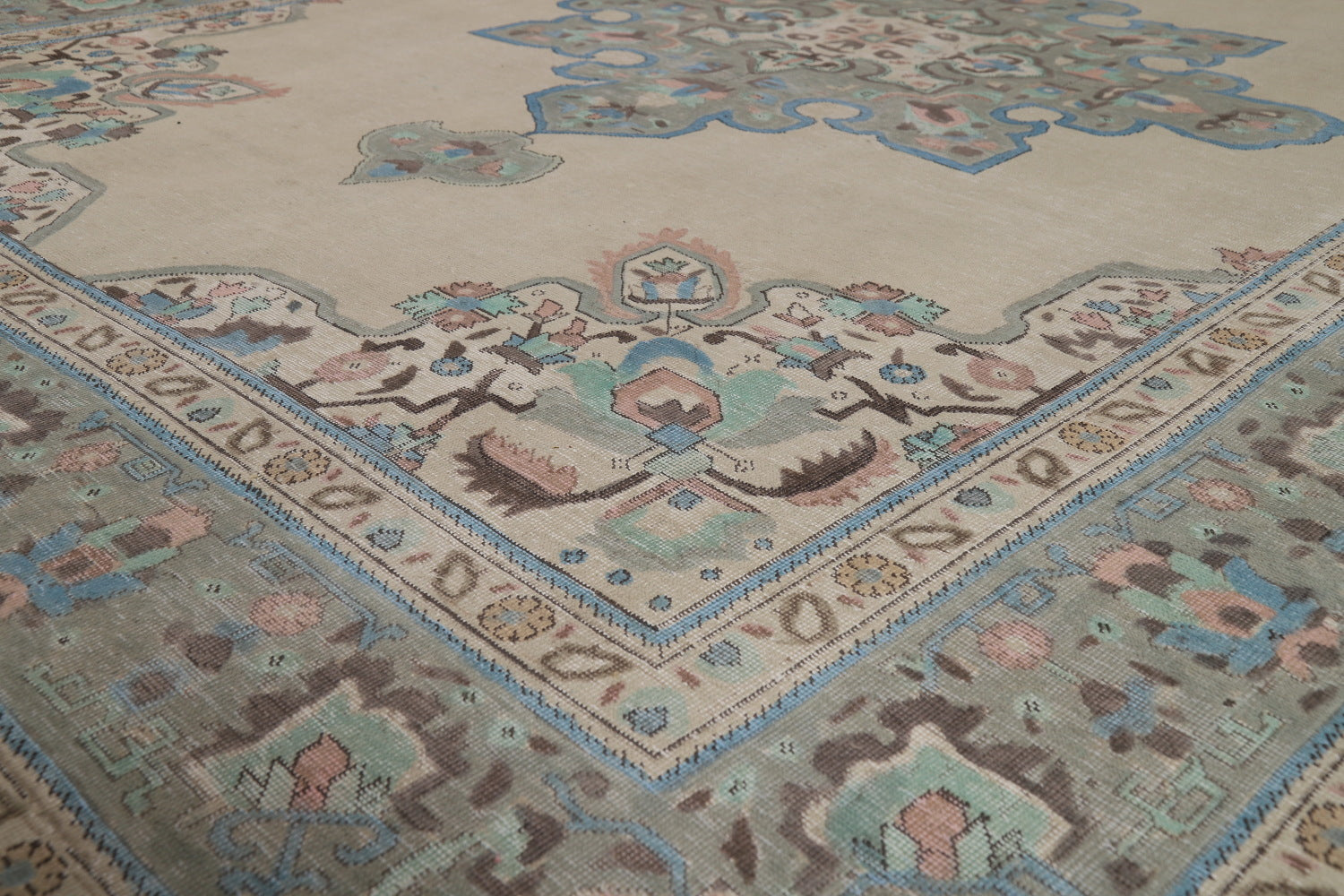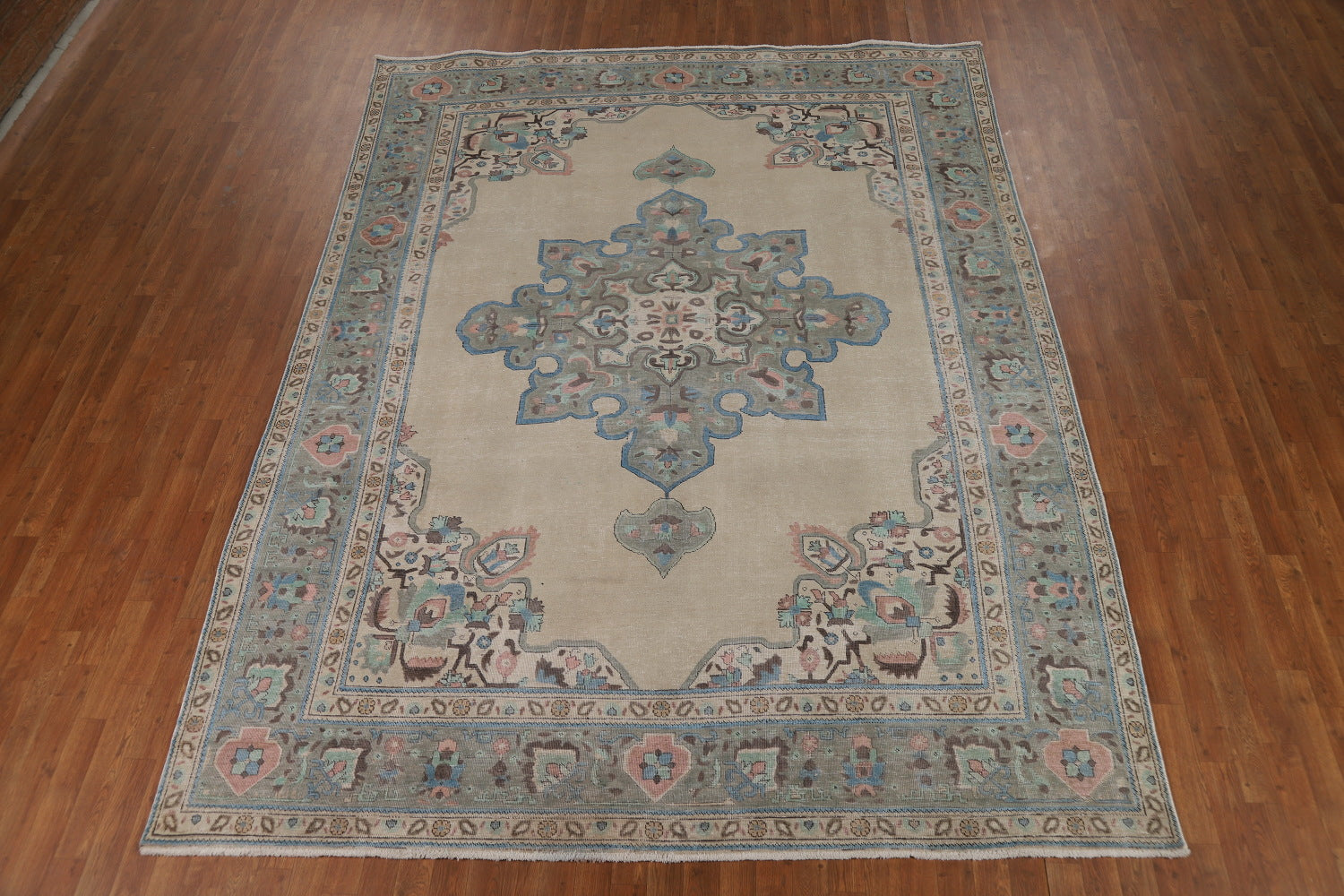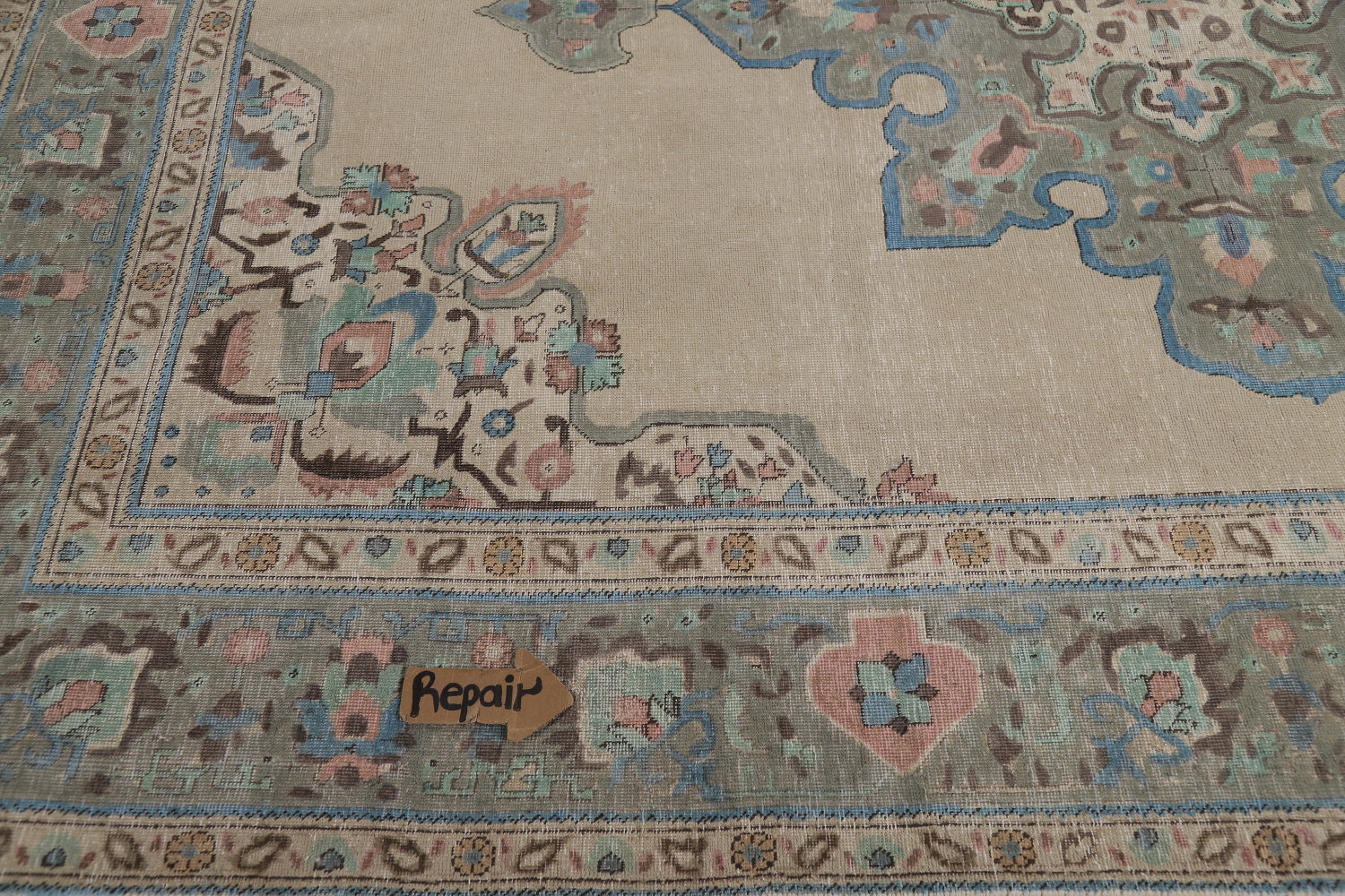 A Beautiful Genuine Persia ( Persia ) Tabriz rug is Hand Knotted by skillful weavers in Persia ( Persia ) with 100% Wool Material. This rug is in Very Good(Evenly Low Pile-Small Repair) condition. dimensions are 11' 0'' X 8' 3'' in foot and 335 X 251 in centimeter. the primary color is Beige & Ivories.