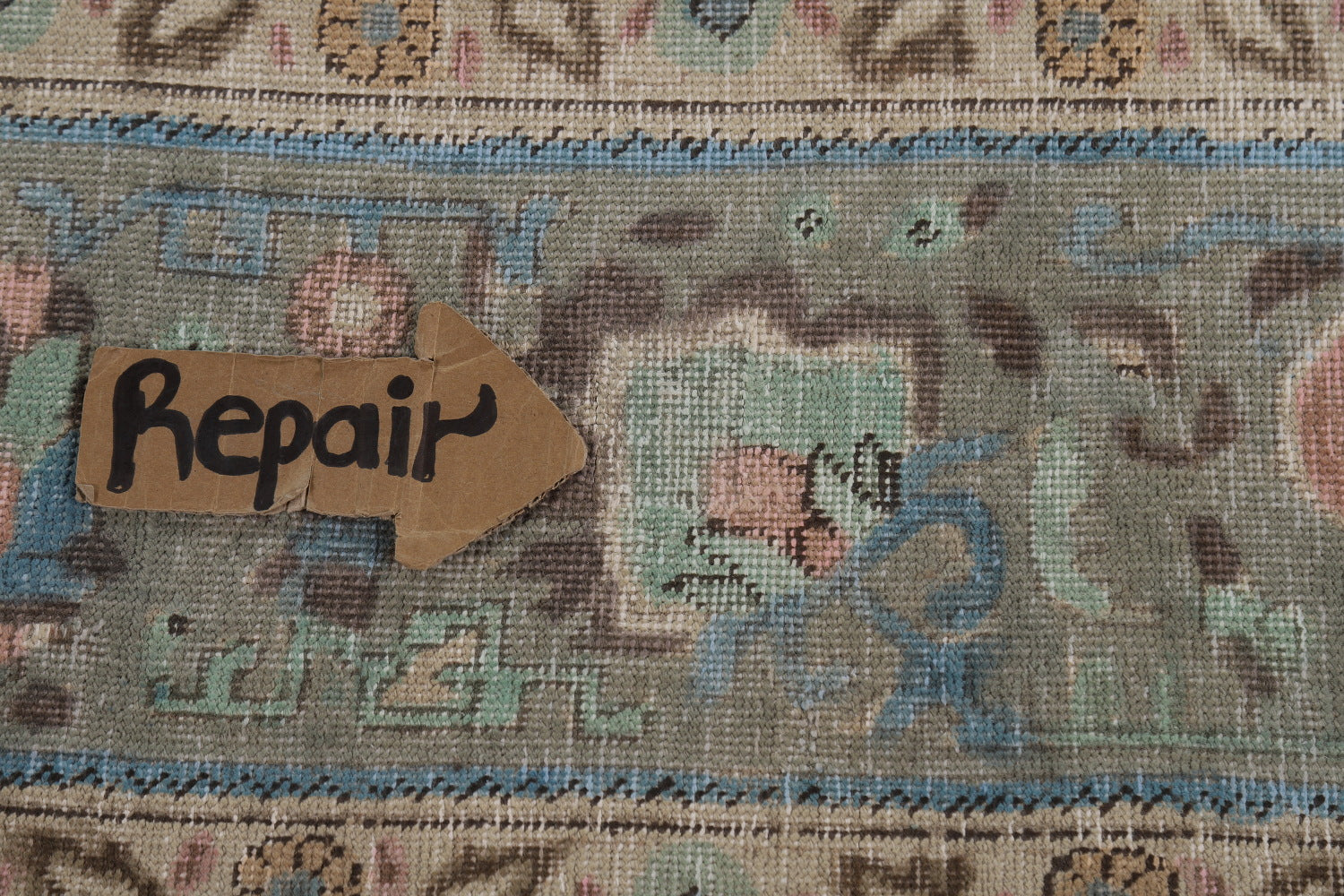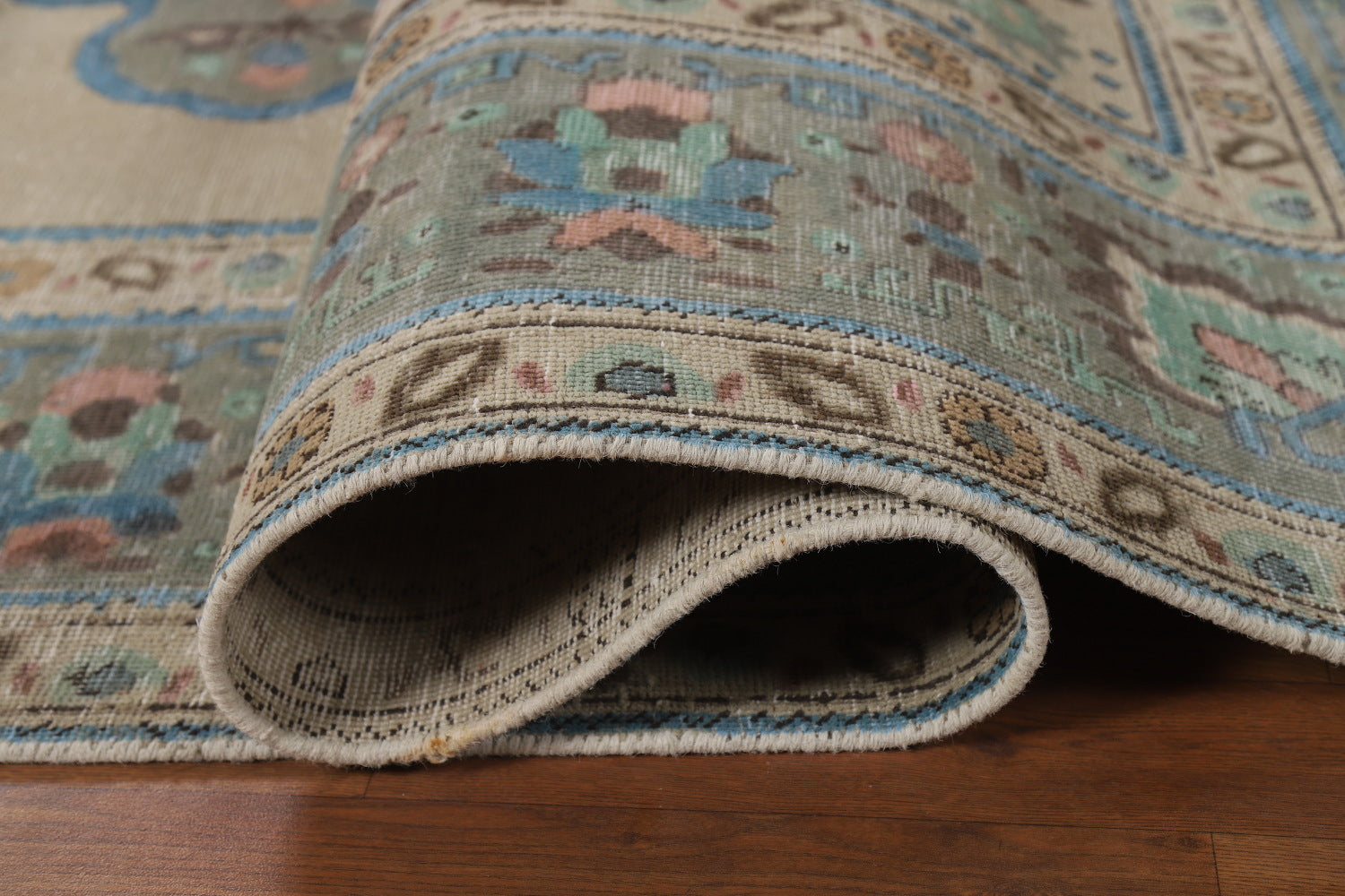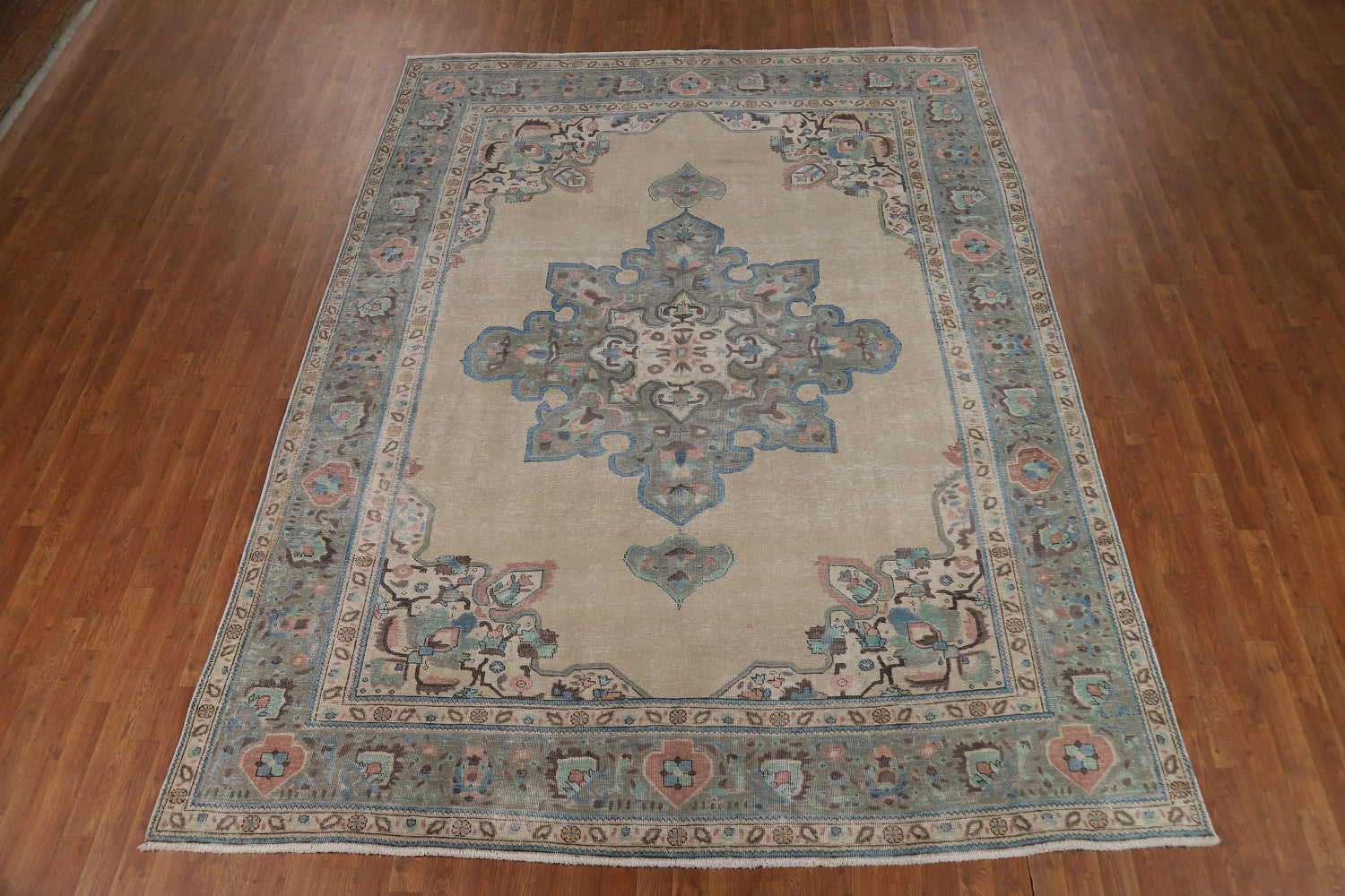 A Beautiful Genuine Persia ( Persia ) Tabriz rug is Hand Knotted by skillful weavers in Persia ( Persia ) with 100% Wool Material. This rug is in Very Good(Evenly Low Pile-Small Repair) condition. dimensions are 11' 0'' X 8' 3'' in foot and 335 X 251 in centimeter. the primary color is Beige & Ivories.