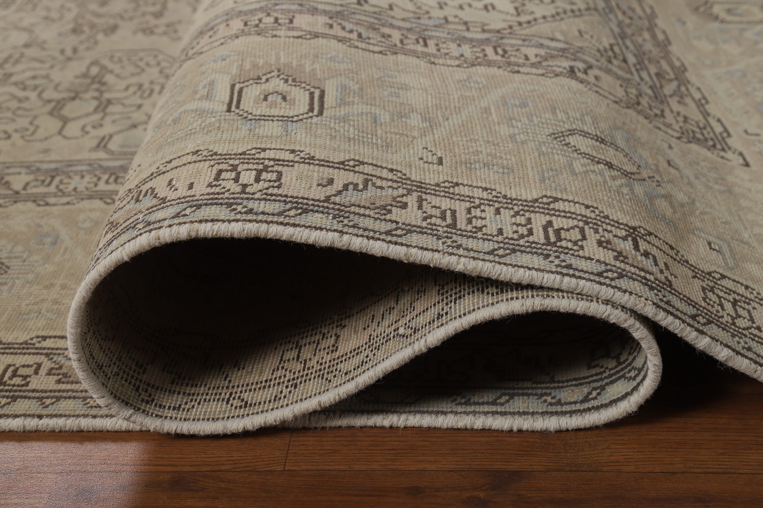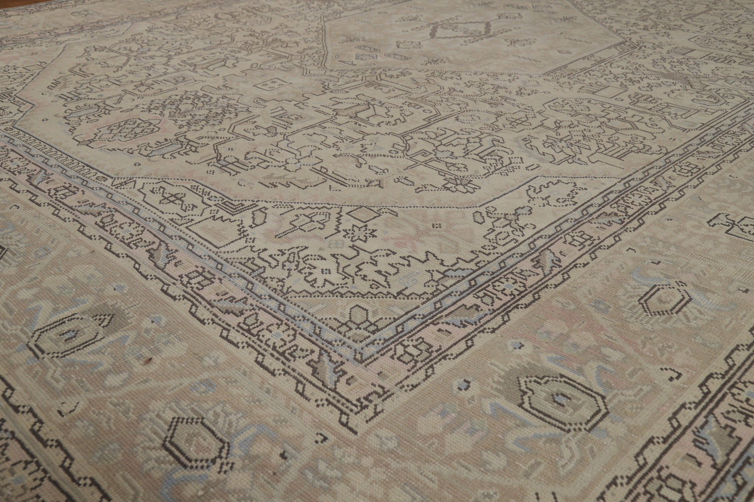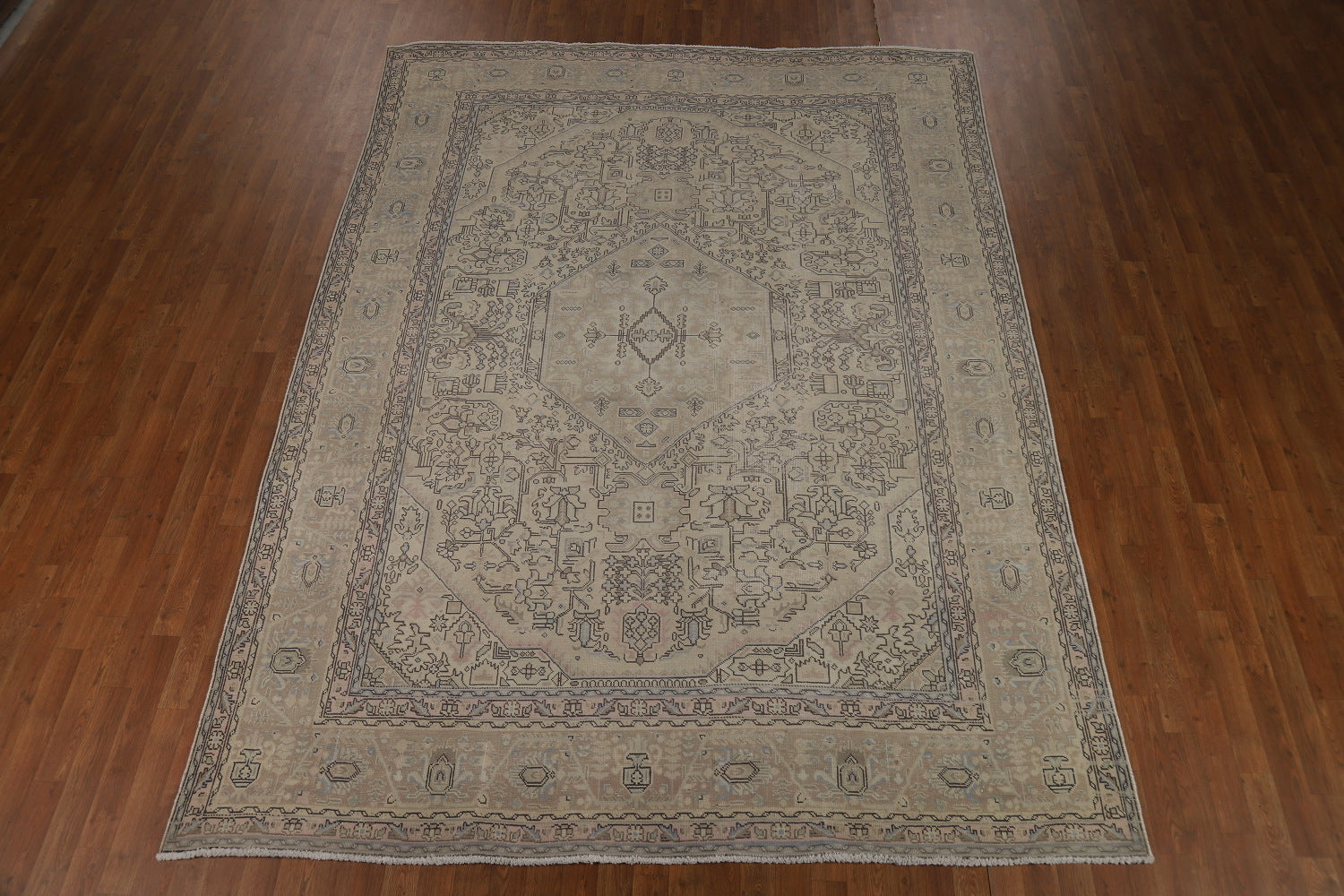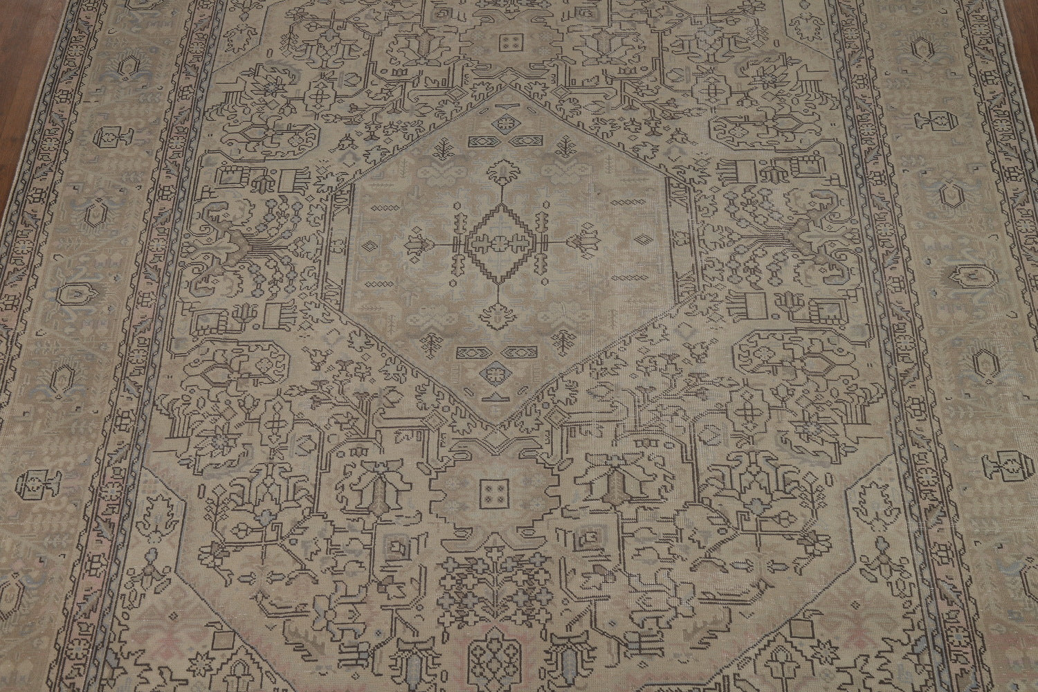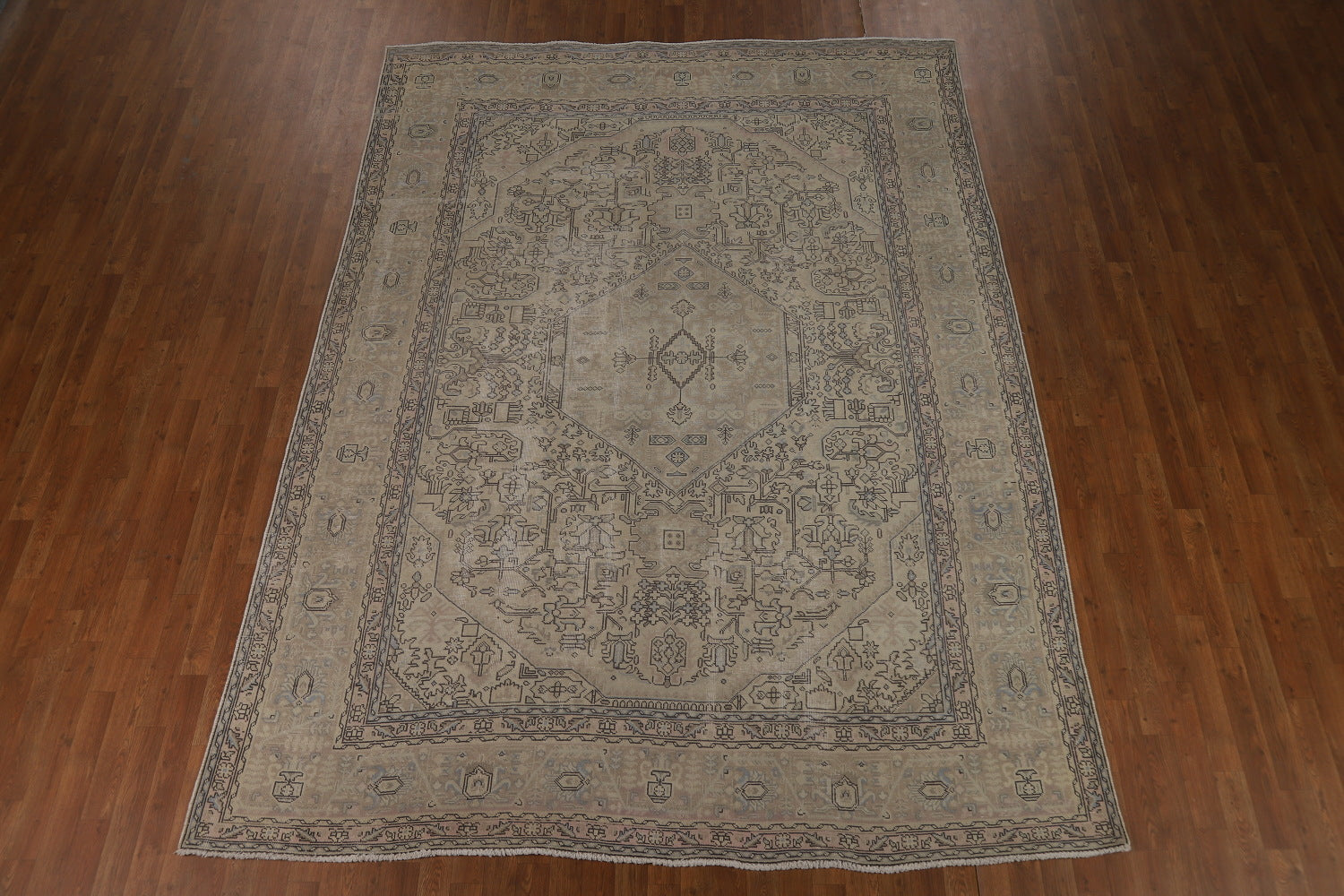 A Beautiful Genuine Persia ( Persia ) Tabriz rug is Hand Knotted by skillful weavers in Persia ( Persia ) with 100% Wool Material. This rug is in Very Good (Evenly Low Pile) condition. dimensions are 10' 6'' X 7' 11'' in foot and 320 X 241 in centimeter. the primary color is Beige & Ivories.