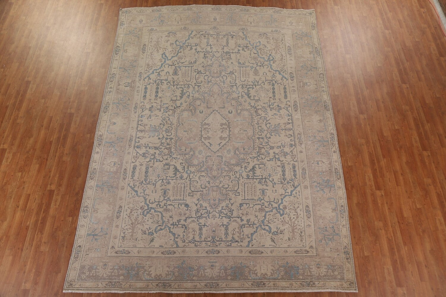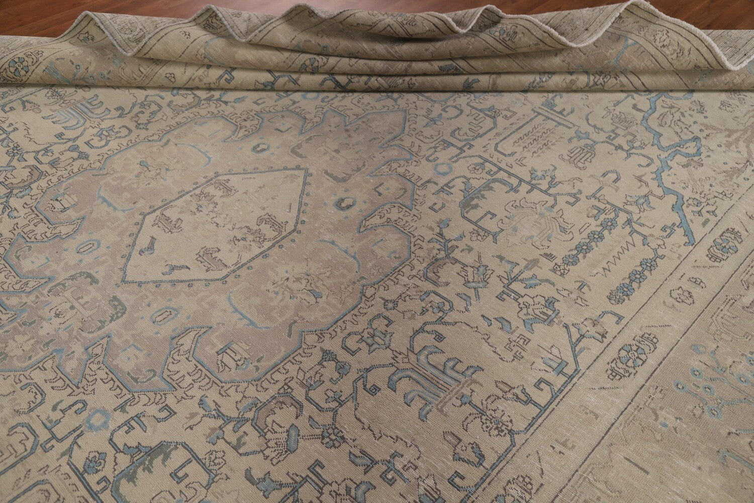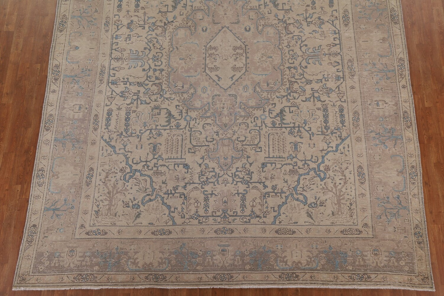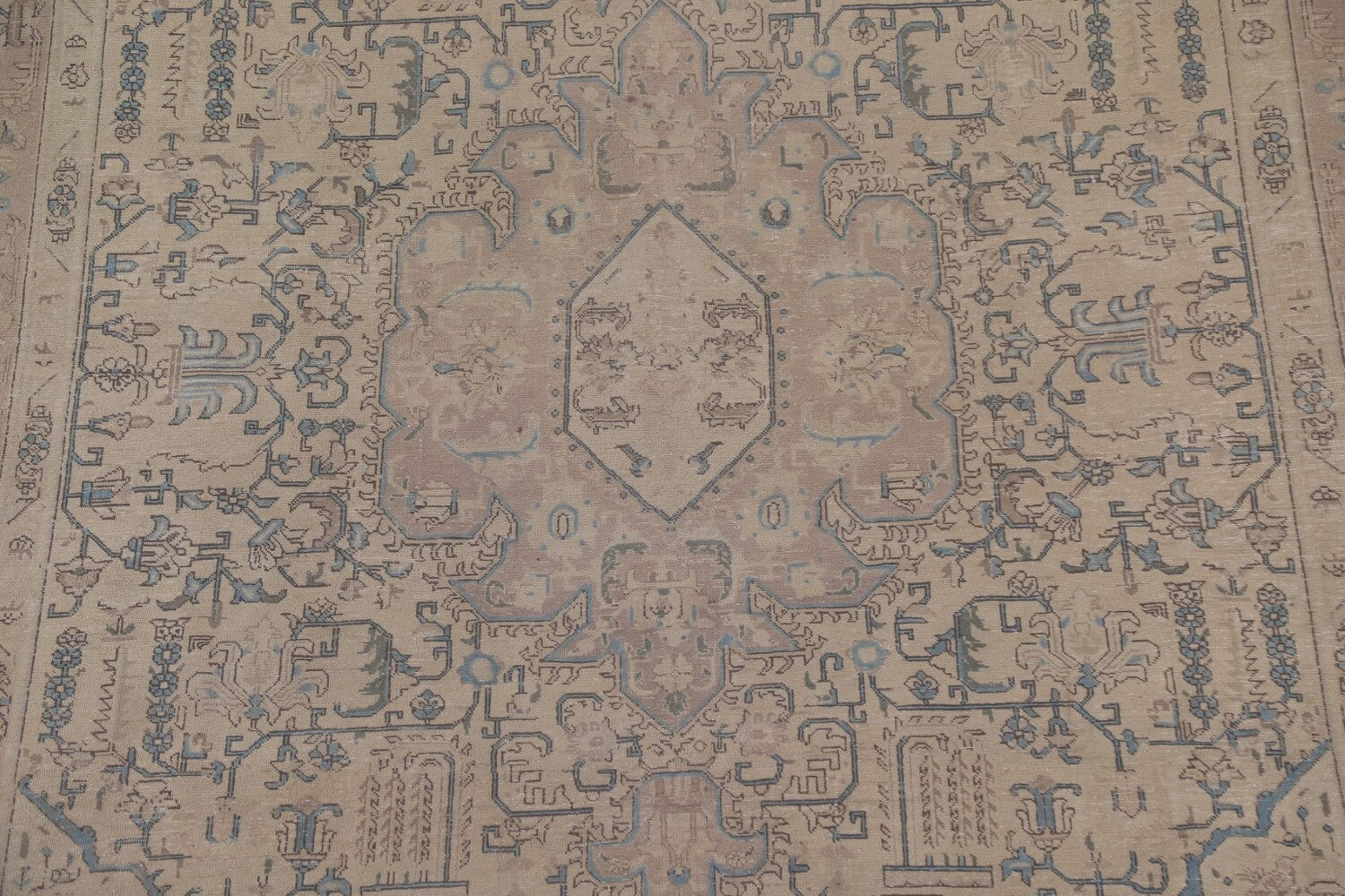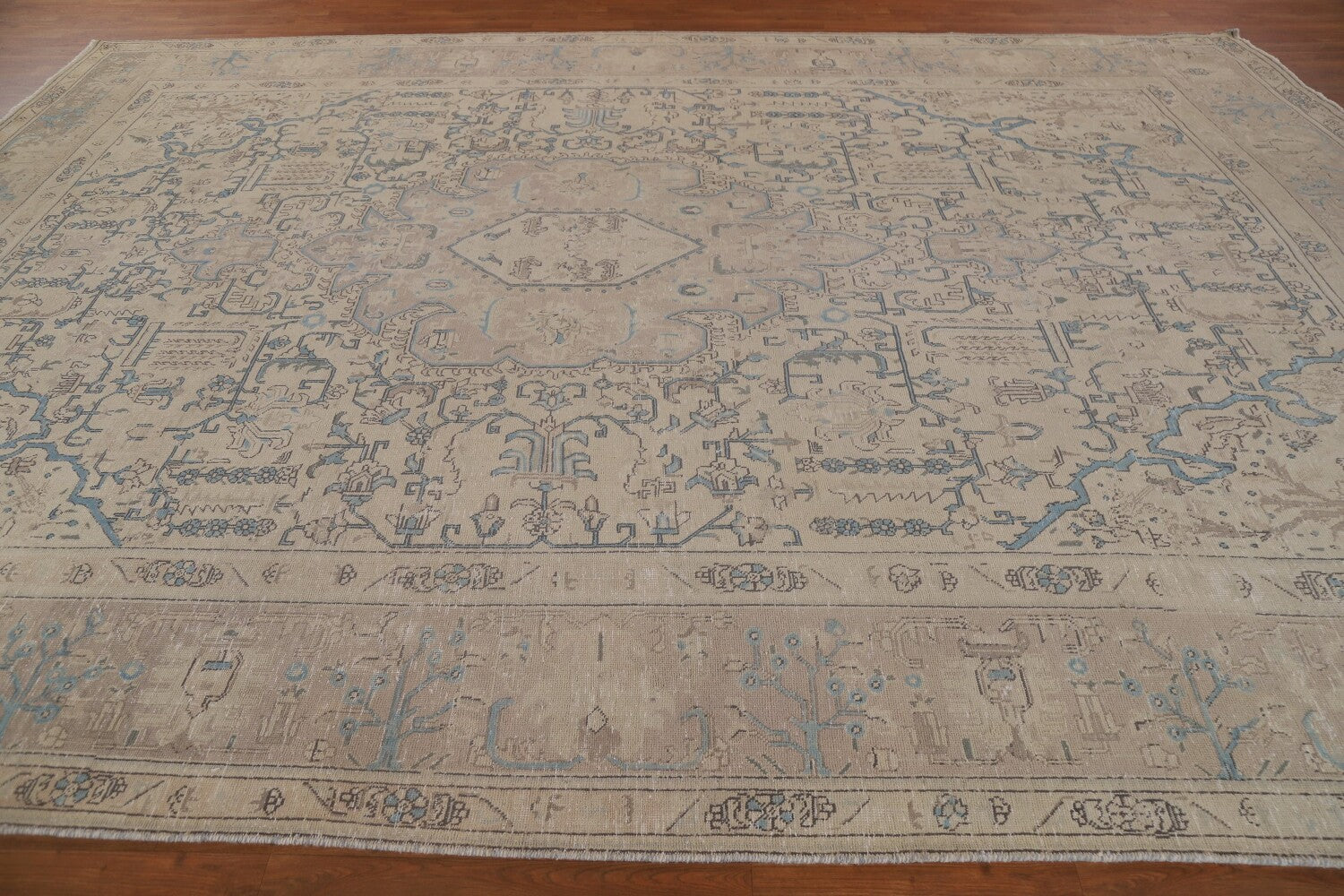 A Beautiful Genuine Persia ( Persia ) Tabriz rug is Hand Knotted by skillful weavers in Persia ( Persia ) with 100% Wool Material. This rug is in Very Good (Low Pile-Repair) condition. dimensions are 13' 3'' X 9' 3'' in foot and 404 X 282 in centimeter. the primary color is Beige & Ivories.