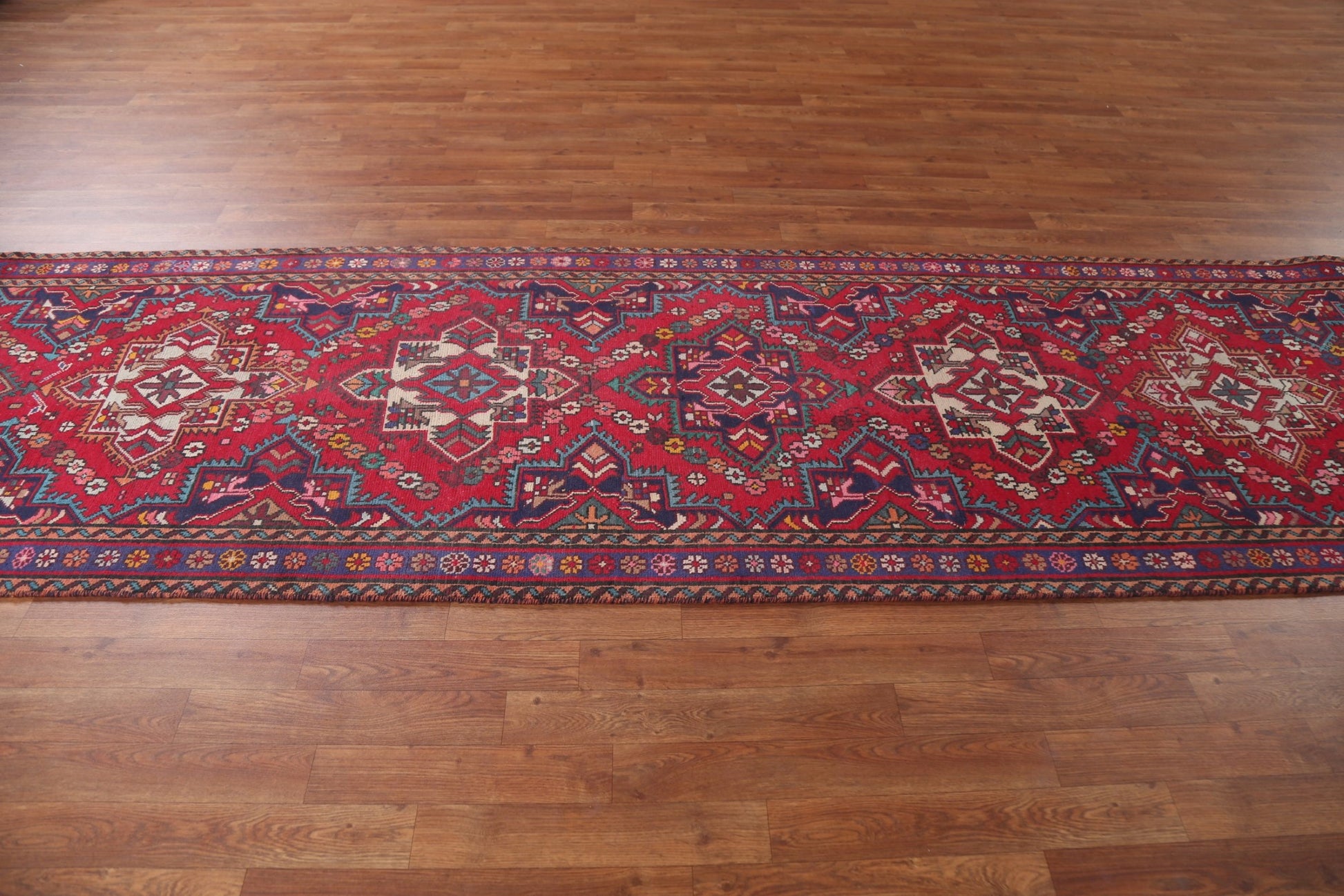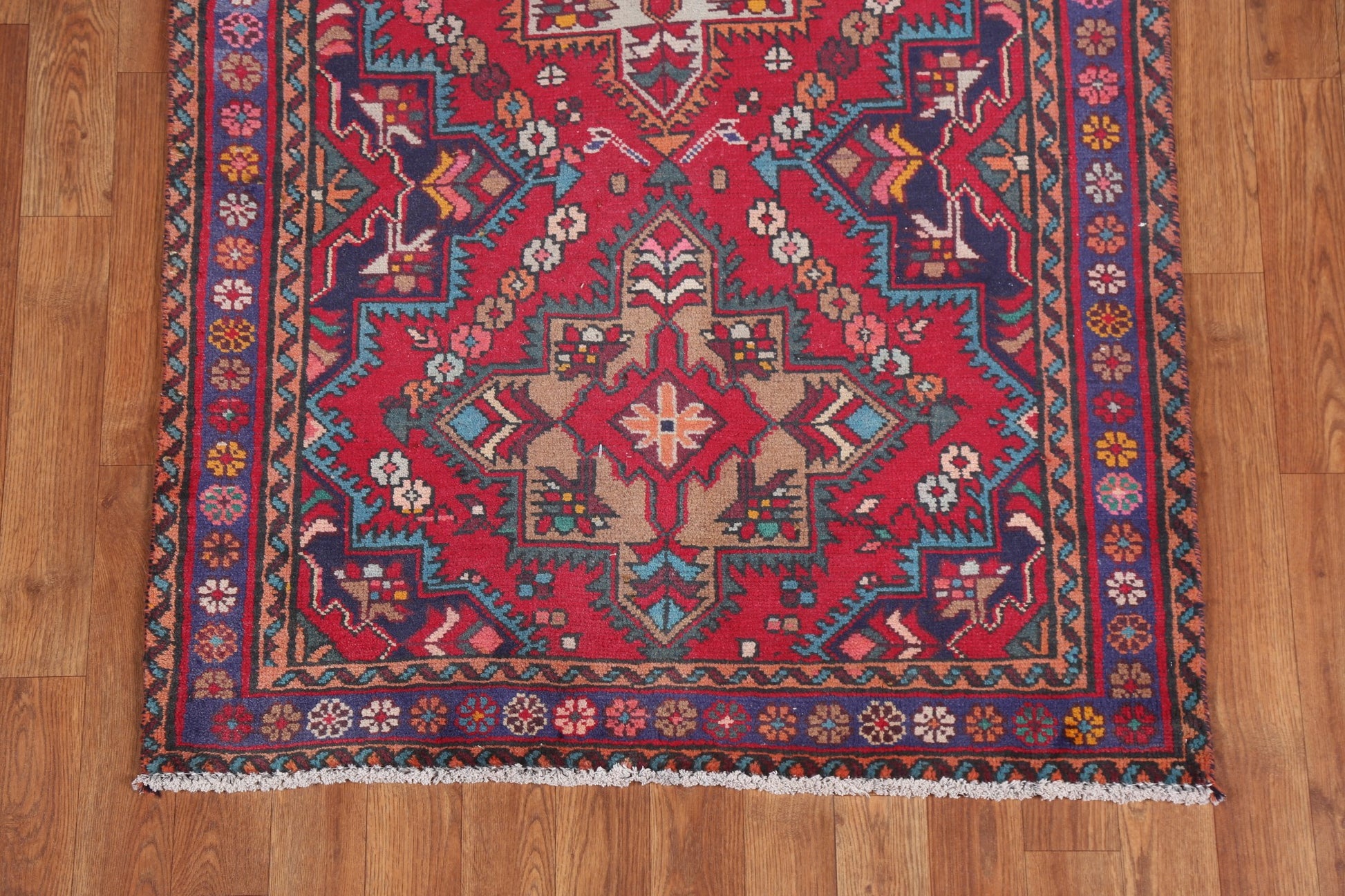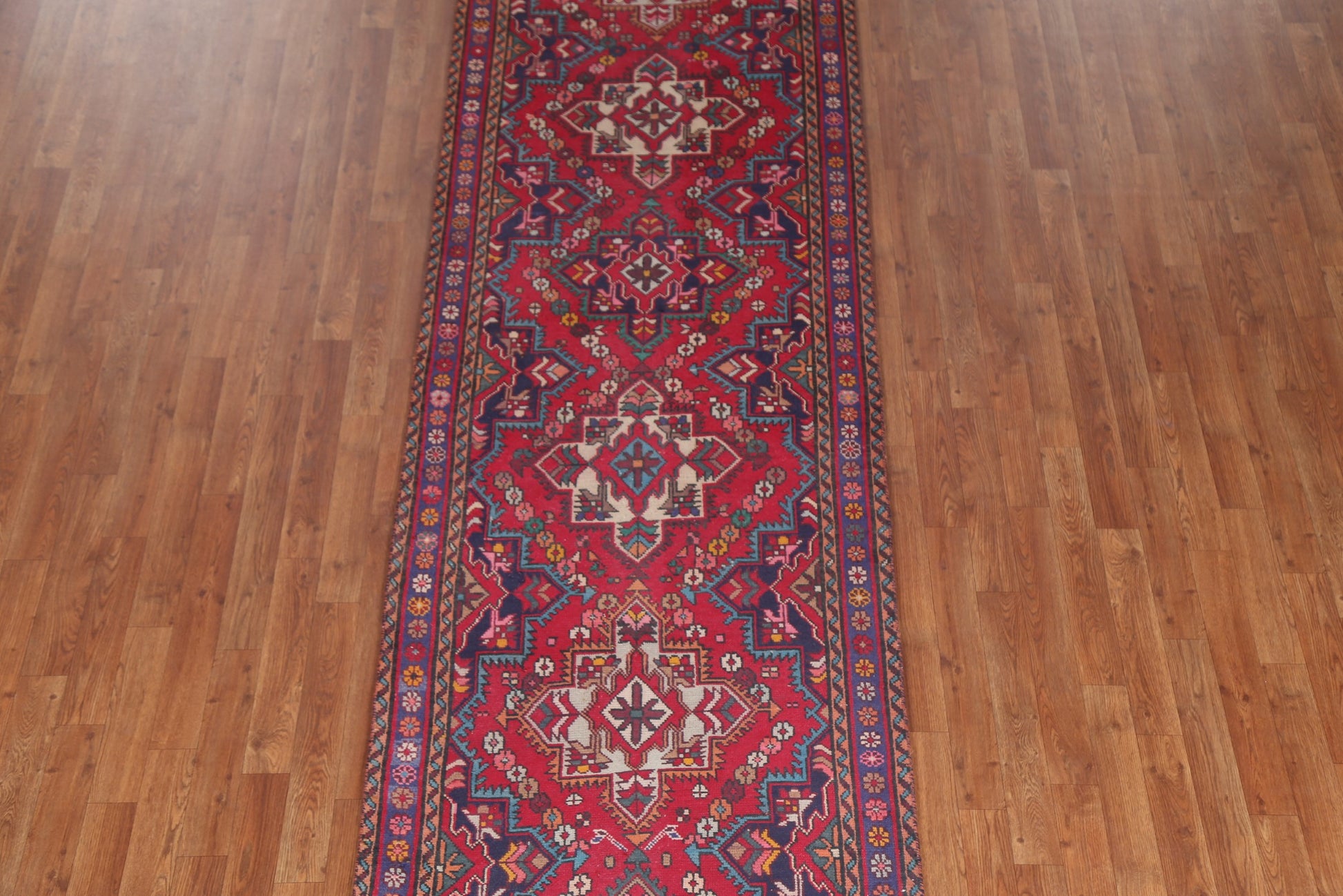 A Beautiful Genuine Persia ( Persia ) Tabriz rug is Hand Knotted by skillful weavers in Persia ( Persia ) with 100% Wool Material. This rug is in Very Good ( Low Pile ) condition. dimensions are 12' 8'' X 3' 2'' in foot and 386 X 97 in centimeter. the primary color is Red.