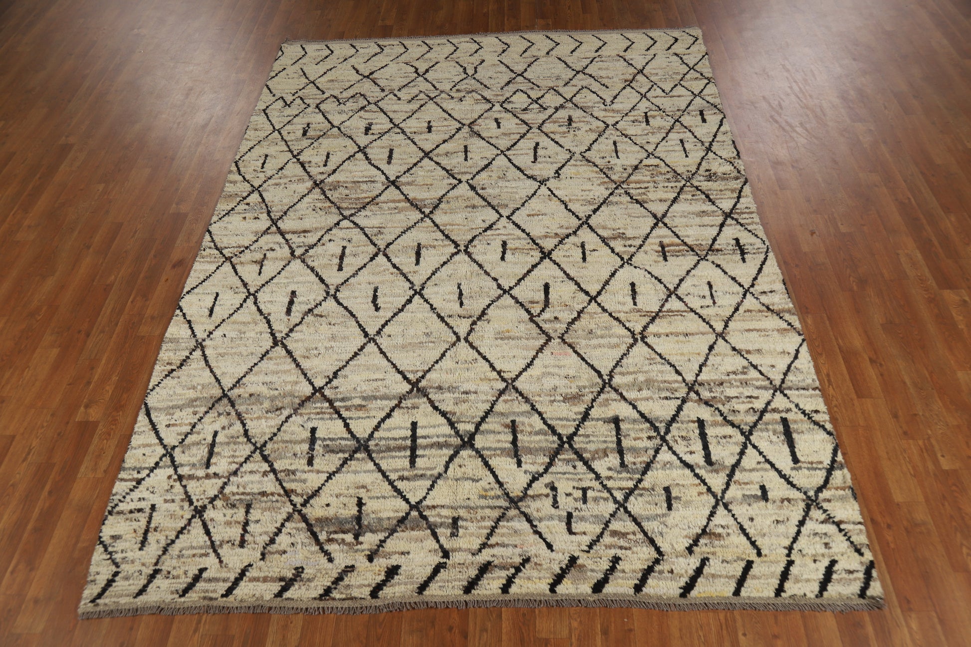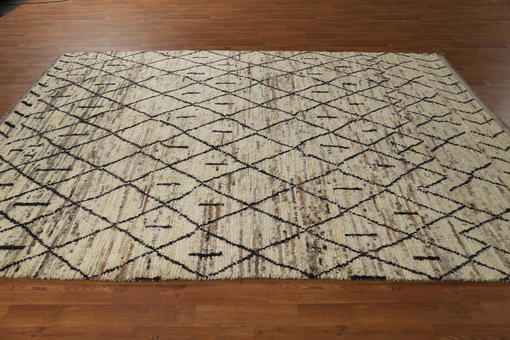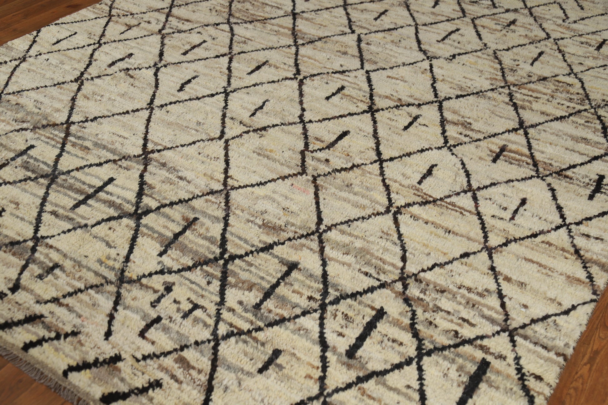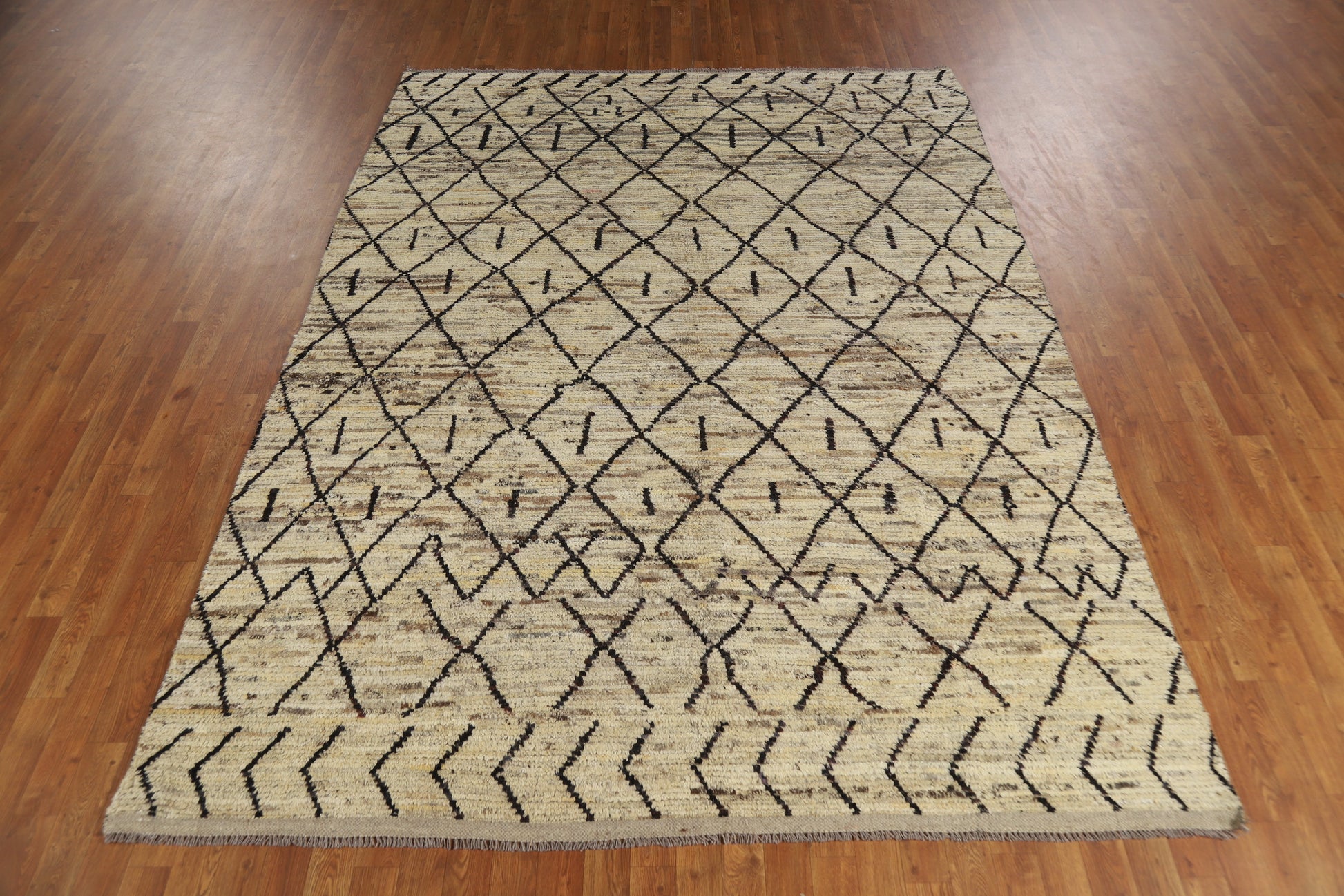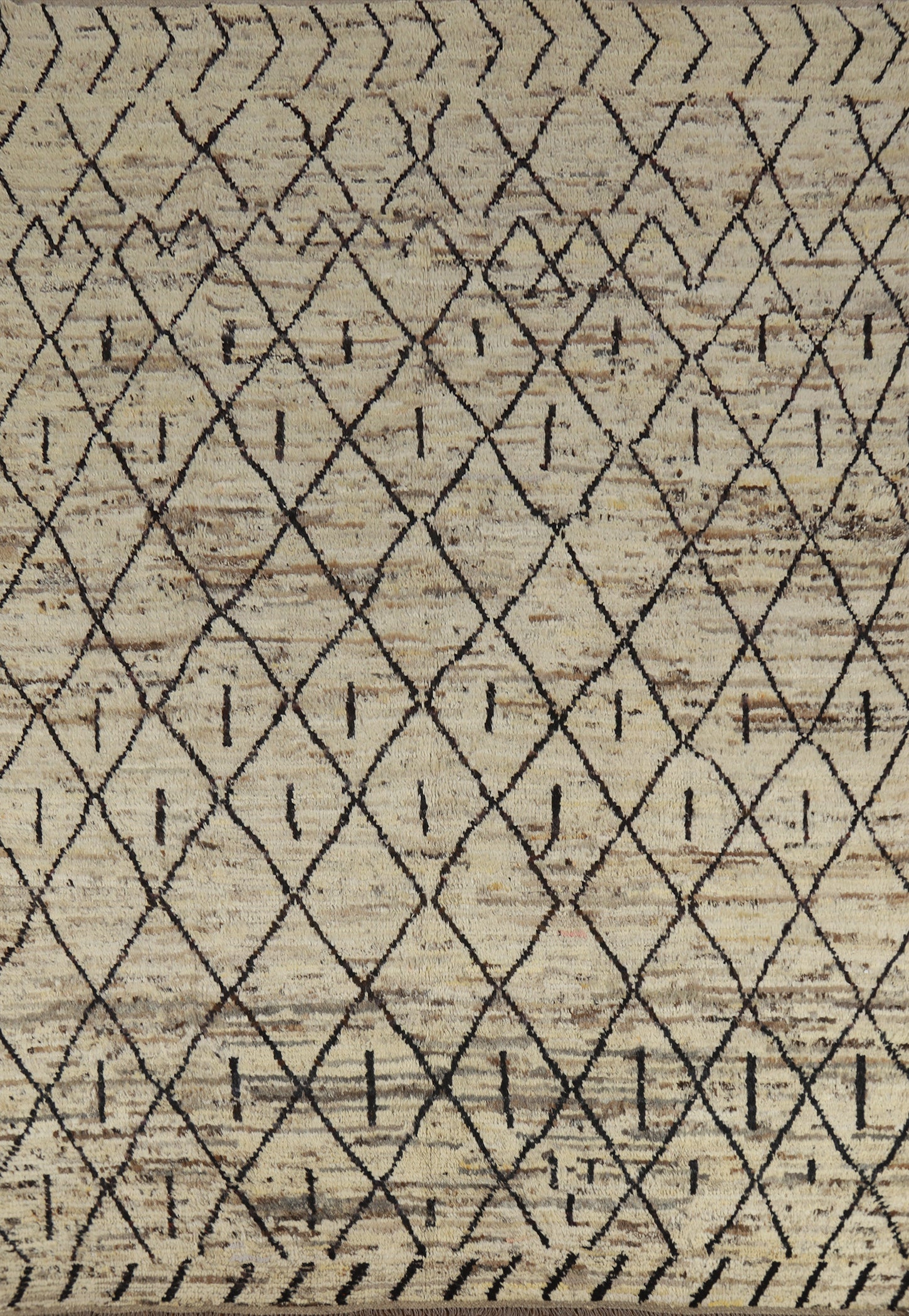 A Beautiful Genuine Pakistan Moroccan rug is Hand Knotted by skillful weavers in Pakistan with 100% Wool Material. This rug is in New, First Quality condition. dimensions are 9' 5'' X 6' 11'' in foot and 287 X 211 in centimeter. the primary color is Beige & Ivories.