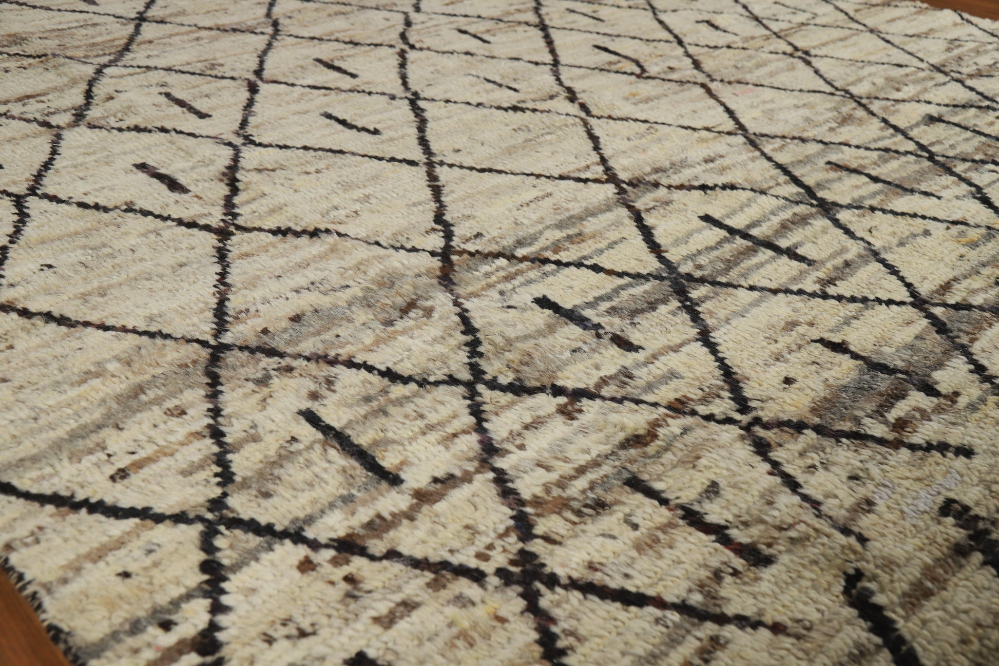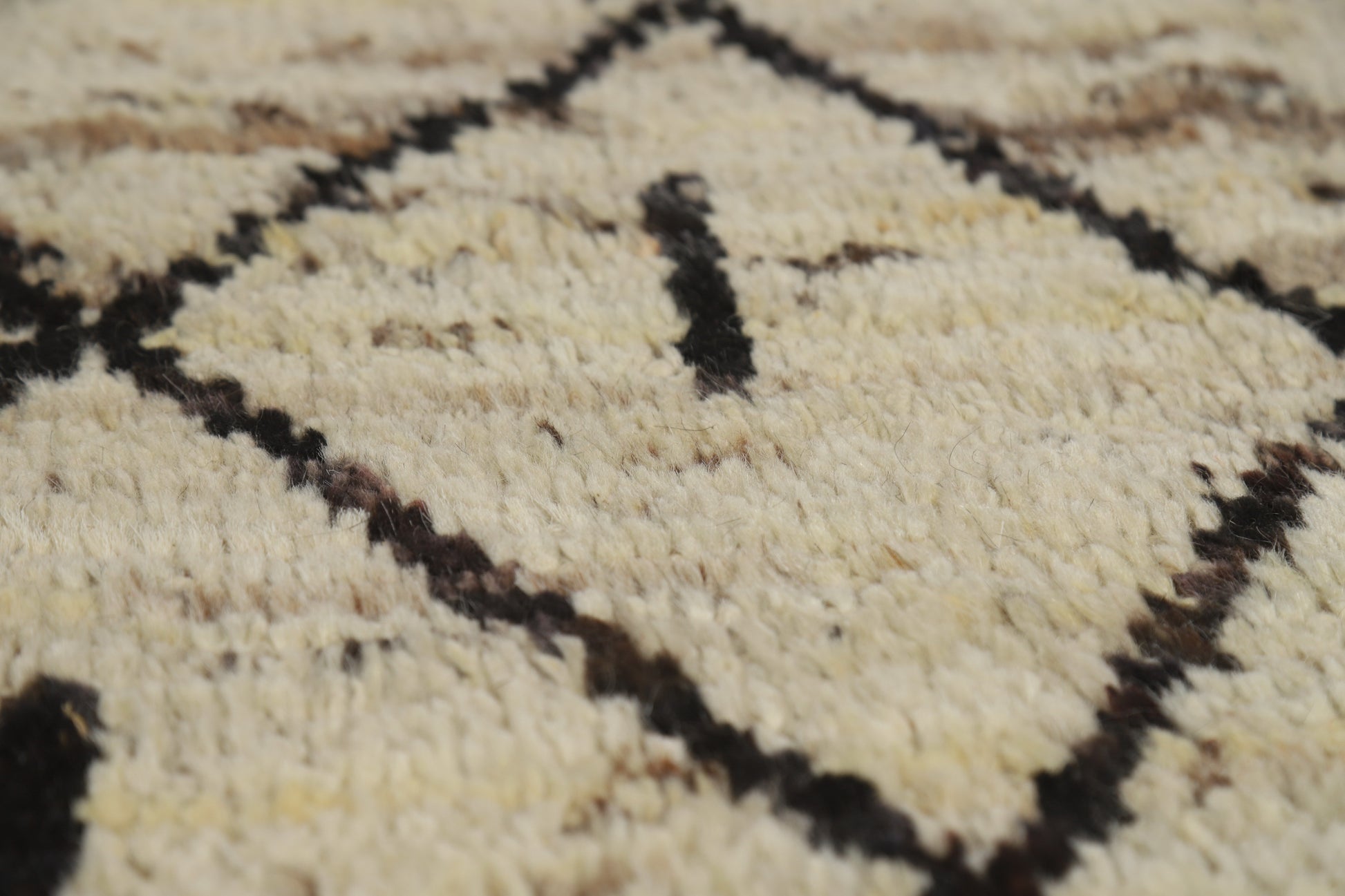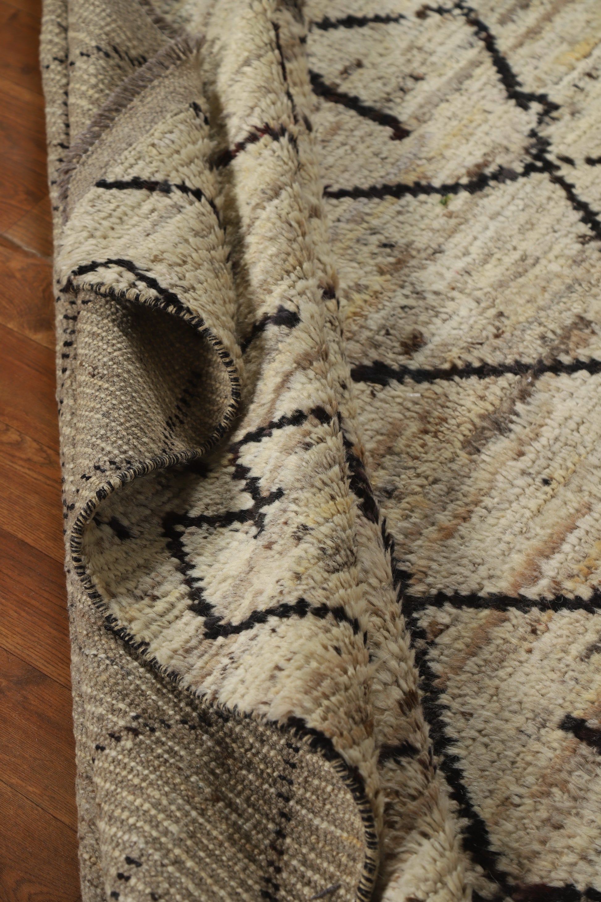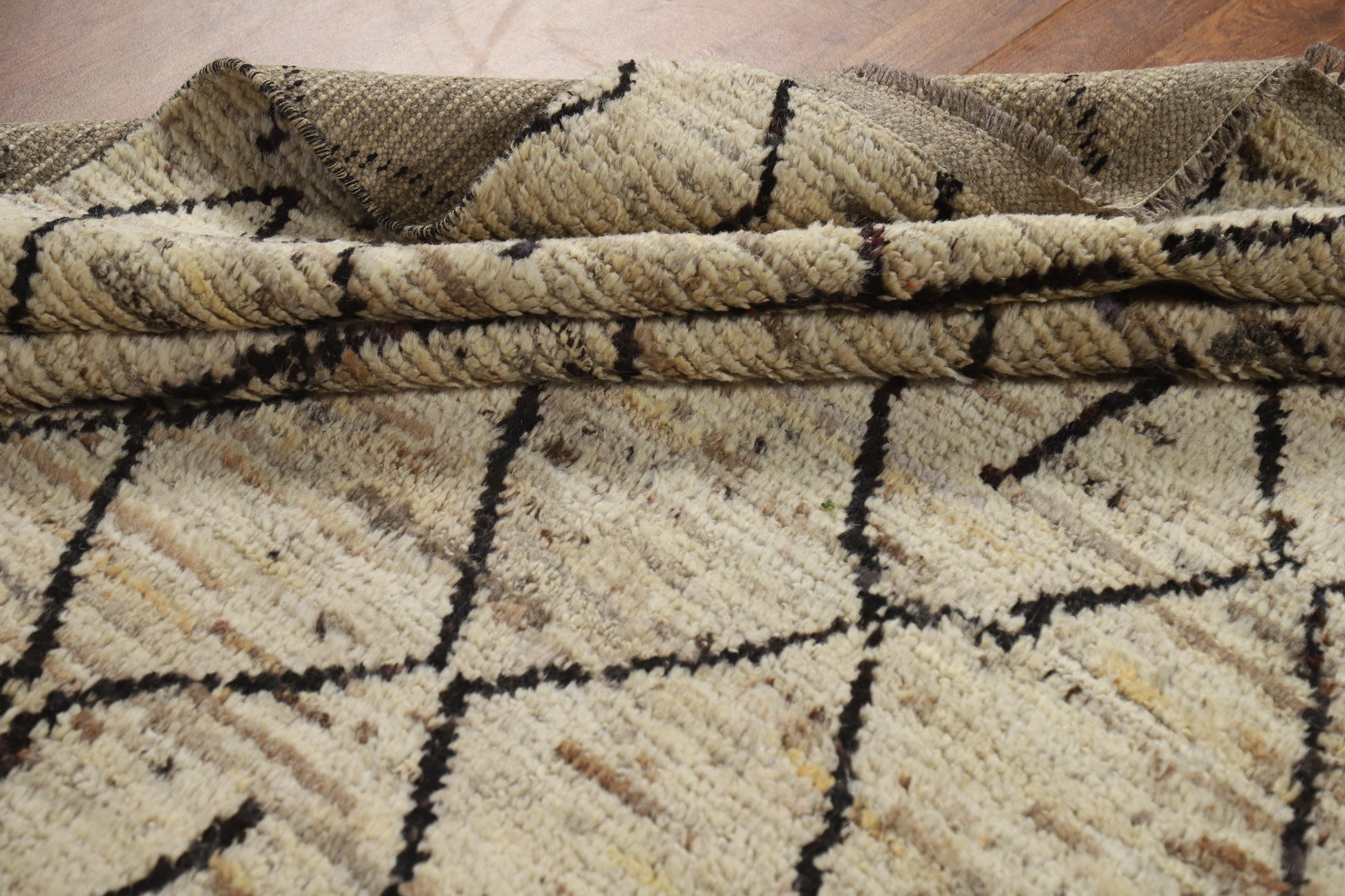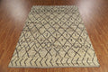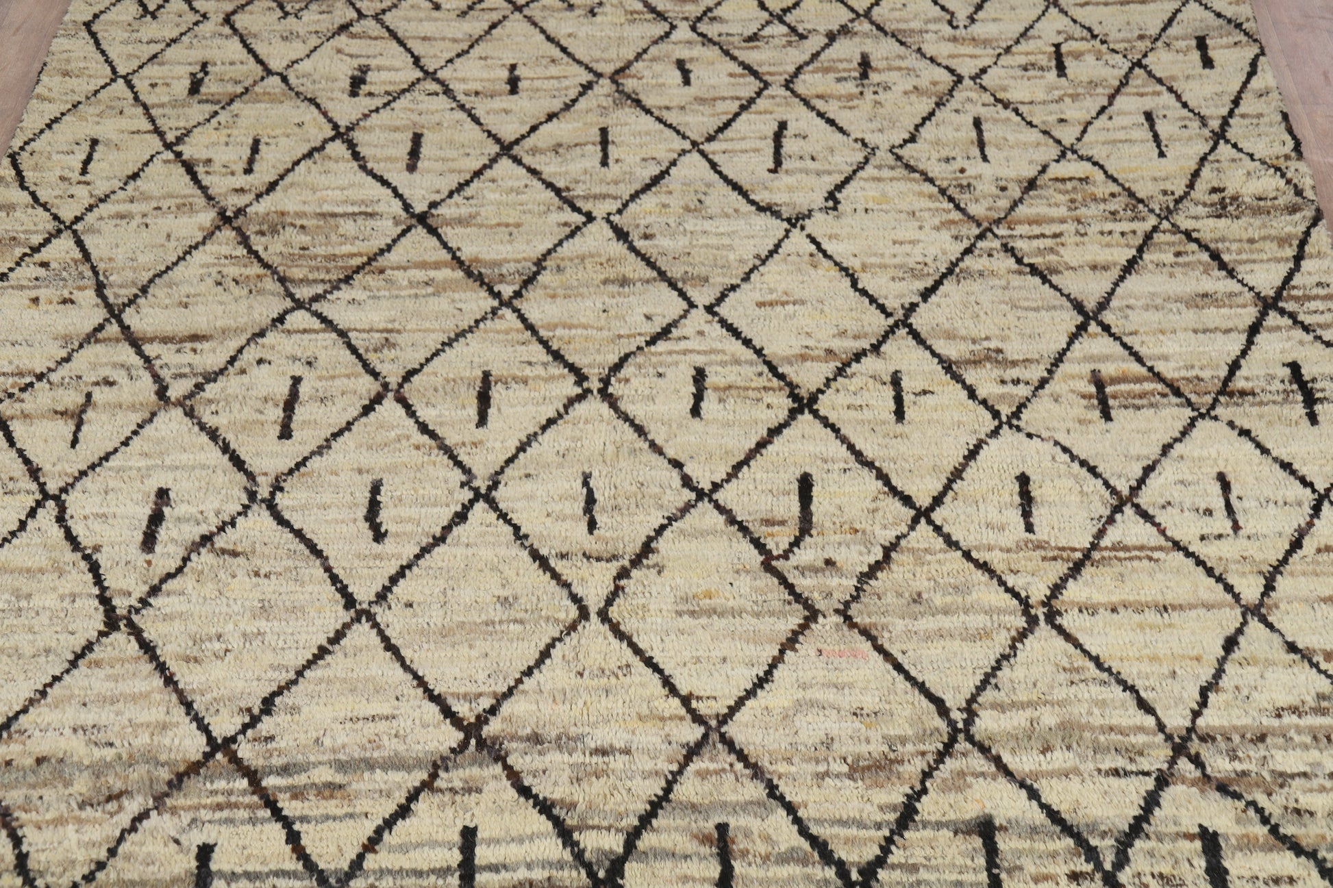 A Beautiful Genuine Pakistan Moroccan rug is Hand Knotted by skillful weavers in Pakistan with 100% Wool Material. This rug is in New, First Quality condition. dimensions are 9' 5'' X 6' 11'' in foot and 287 X 211 in centimeter. the primary color is Beige & Ivories.