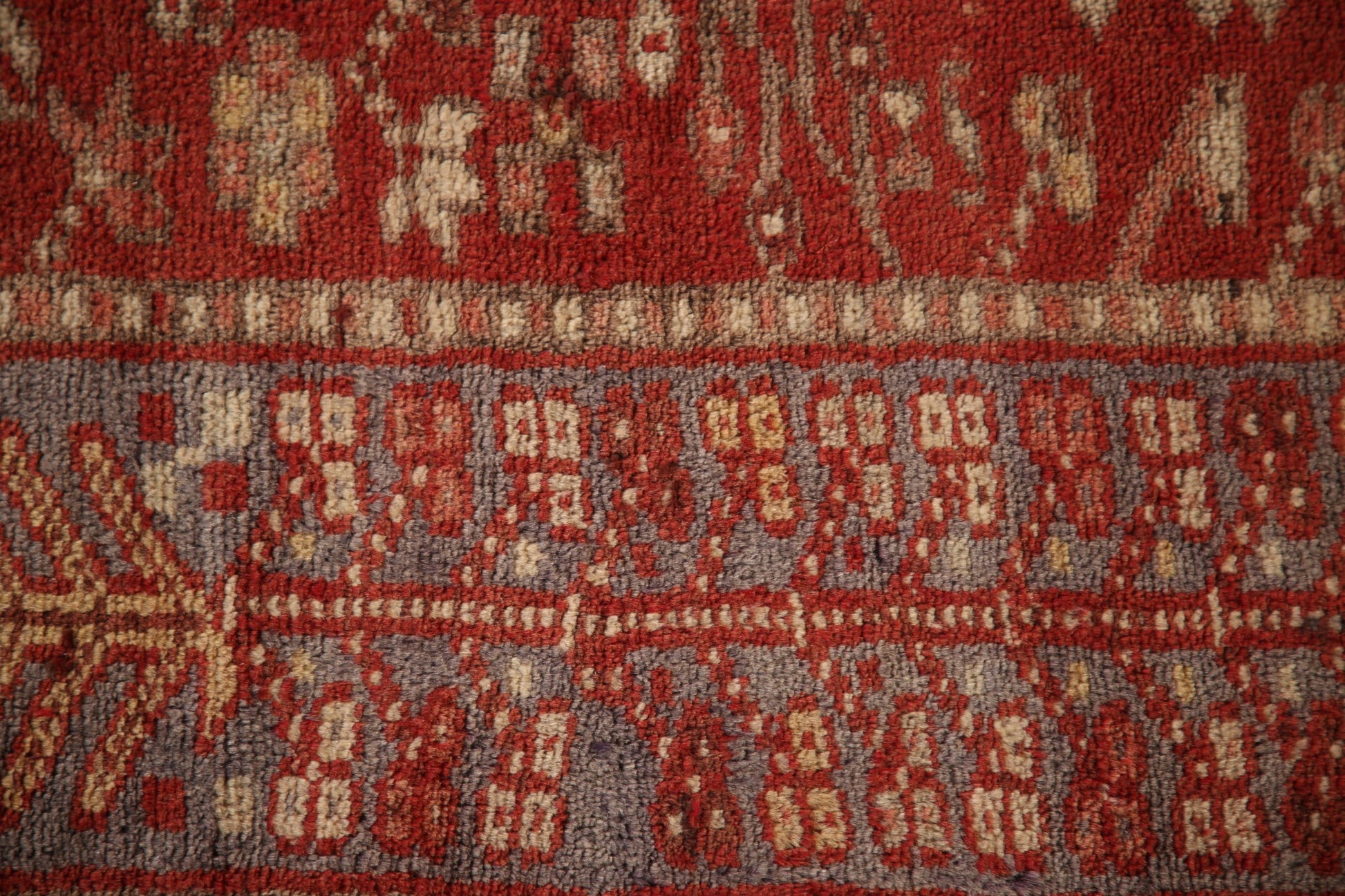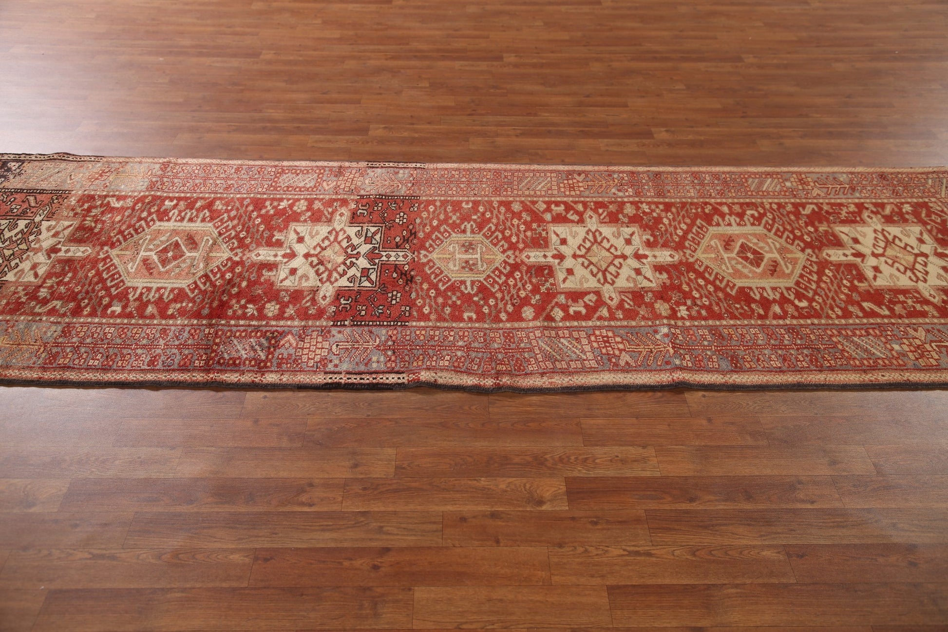 A Beautiful Genuine Persia ( Persia ) Gharajeh rug is Hand Knotted by skillful weavers in Persia ( Persia ) with 100% Wool Material. This rug is in Very Good (Abrash) condition. dimensions are 10' 6'' X 3' 6'' in foot and 320 X 107 in centimeter. the primary color is Red.
