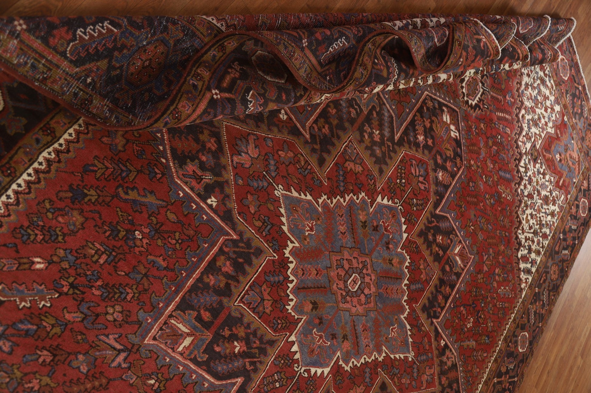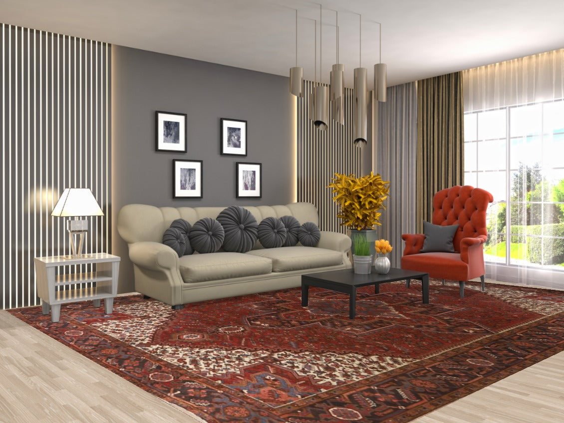 A Beautiful Genuine Persia ( Persia ) Heriz rug is Hand Knotted by skillful weavers in Persia ( Persia ) with 100% Wool Material. This rug is in Excellent condition. dimensions are 12' 8'' X 9' 10'' in foot and 386 X 300 in centimeter. the primary color is Red.