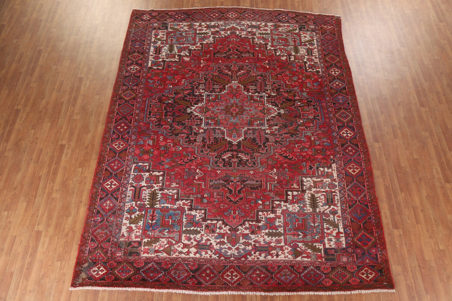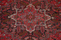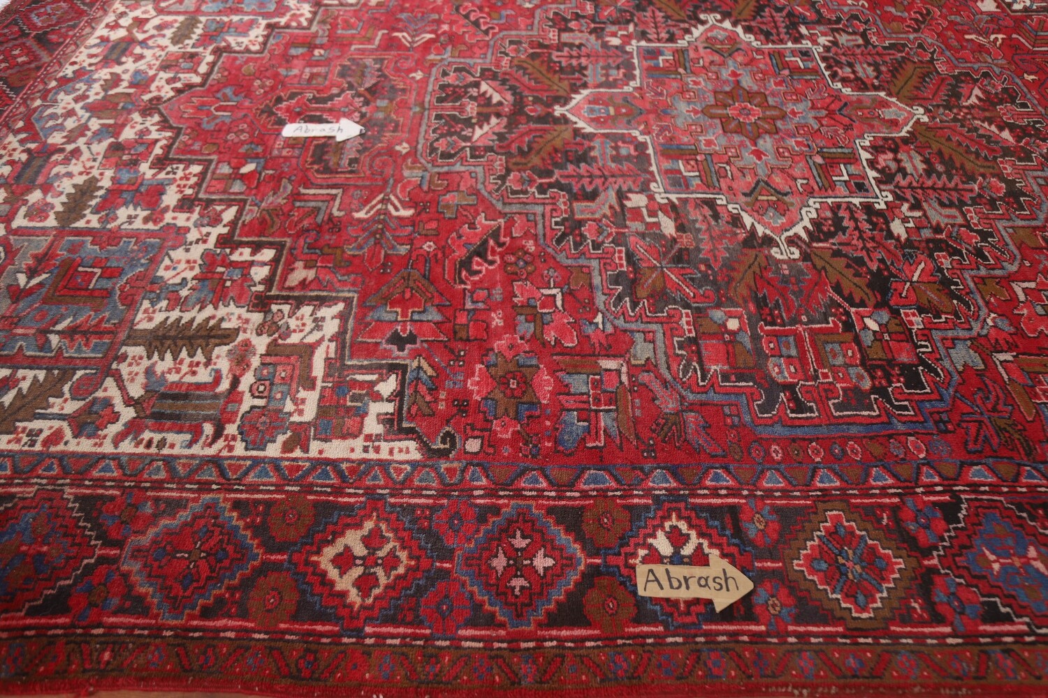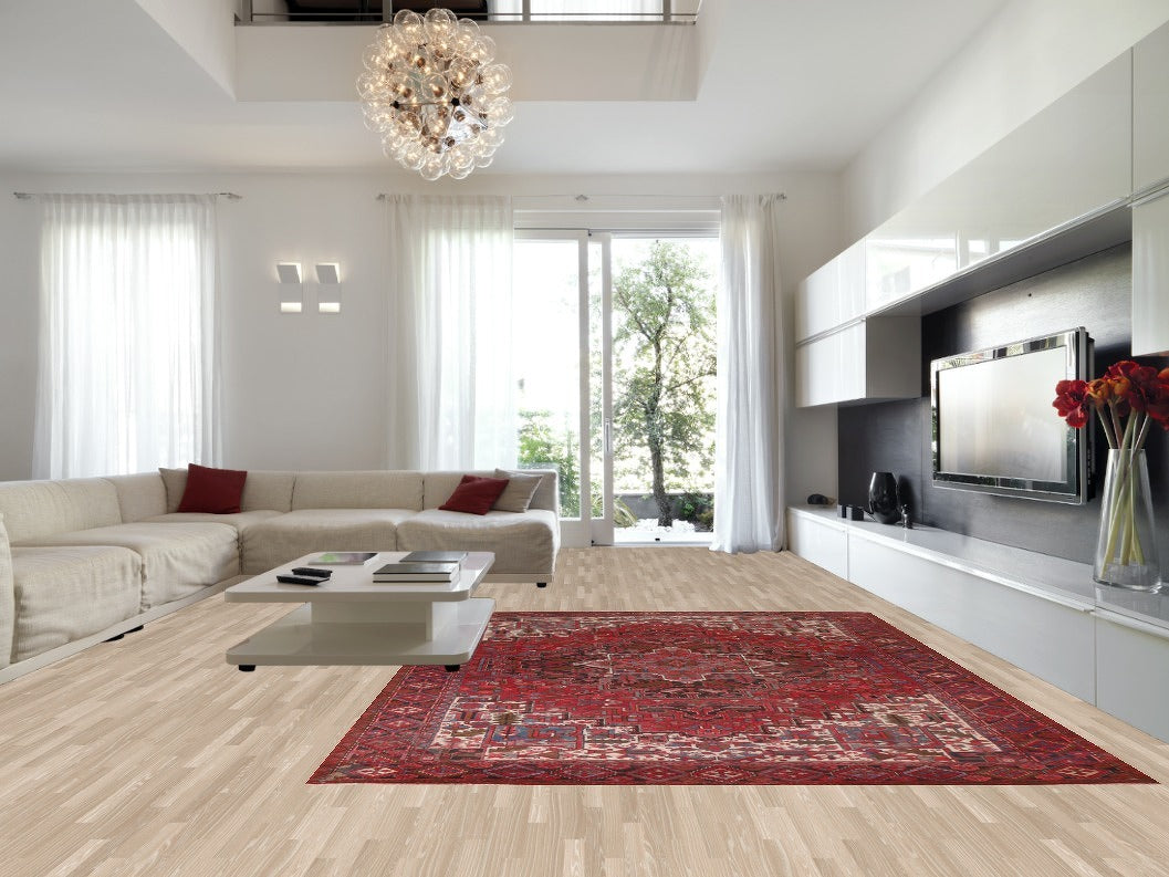A Beautiful Genuine Persia ( Persia ) Heriz rug is Hand Knotted by skillful weavers in Persia ( Persia ) with 100% Wool Material. This rug is in Very Good (Low Pile-Abrash-Repair) condition. dimensions are 12' 8'' X 9' 10'' in foot and 386 X 300 in centimeter. the primary color is Red.