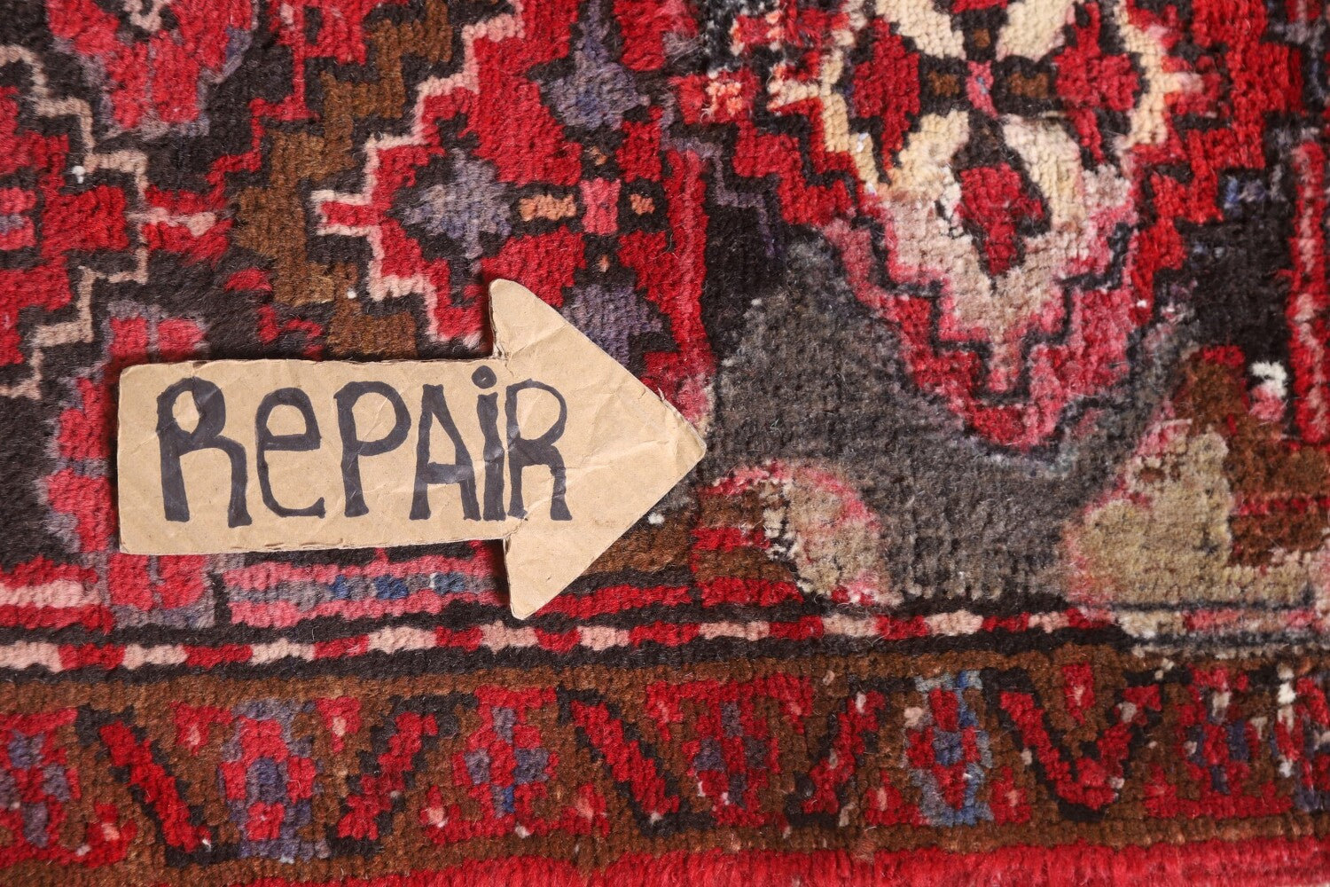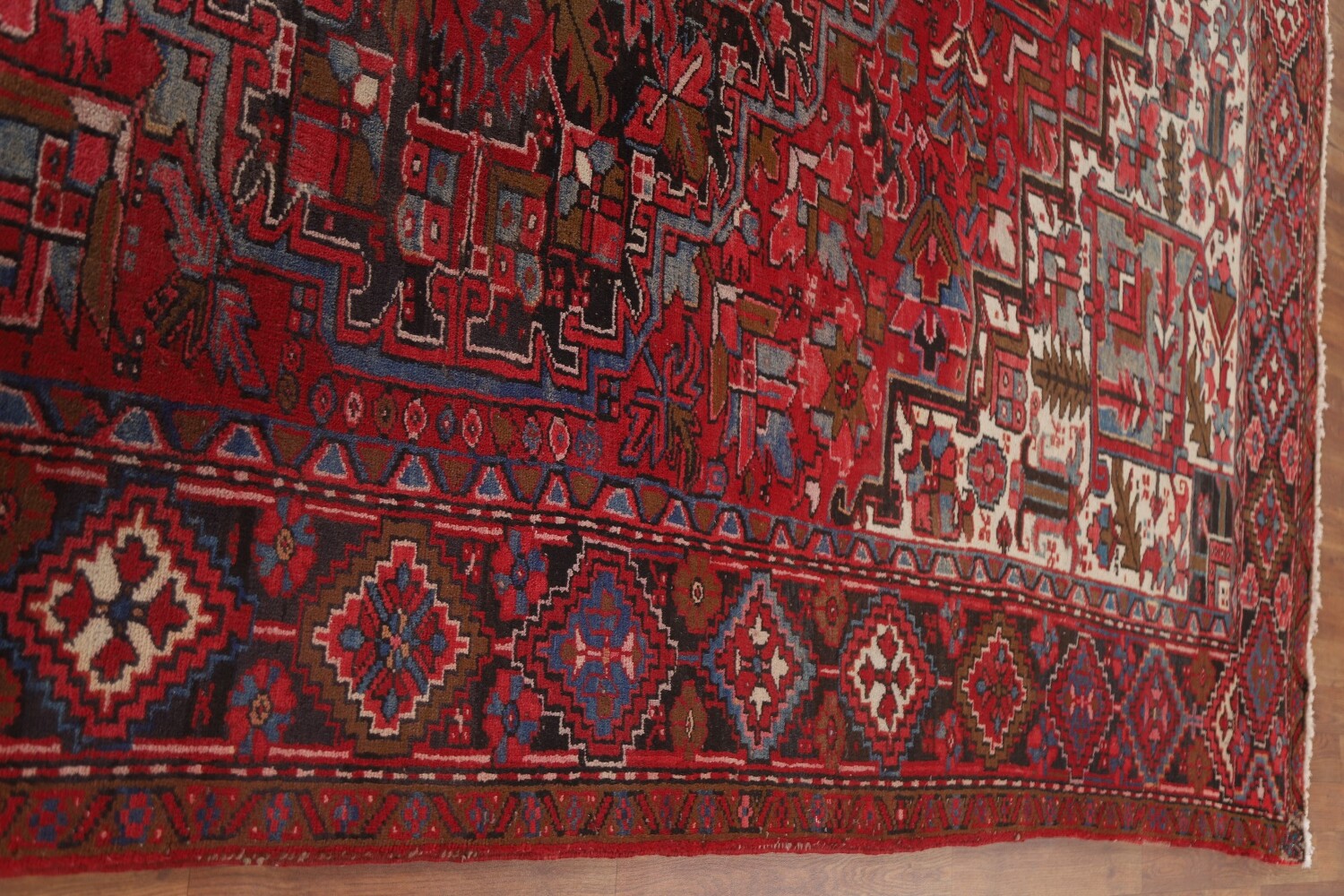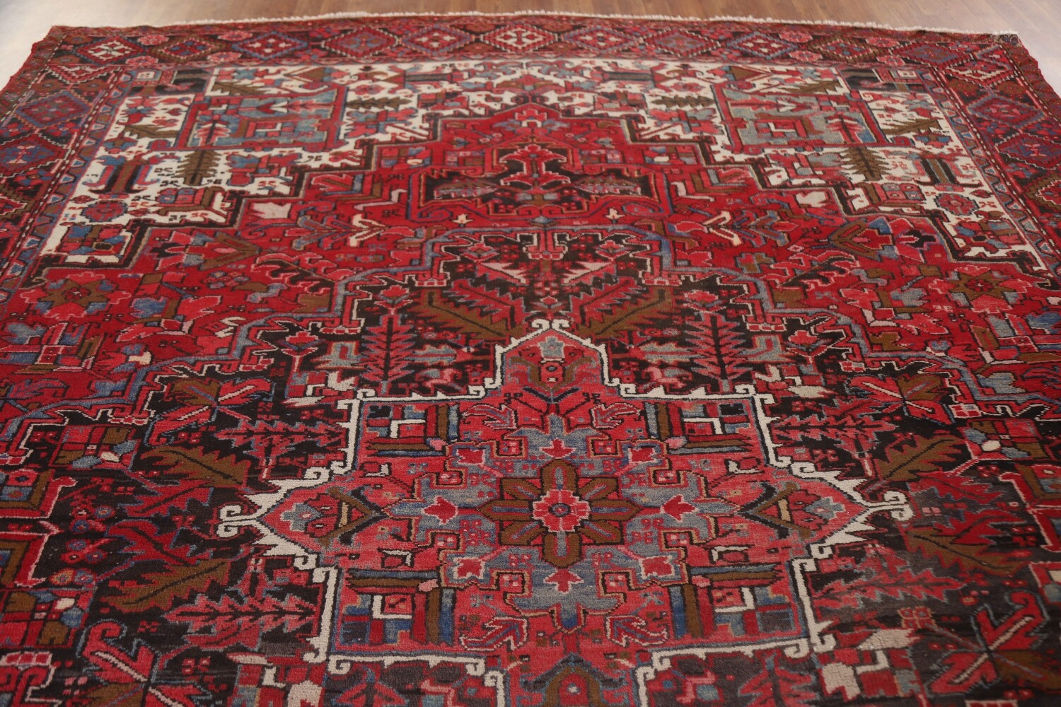 A Beautiful Genuine Persia ( Persia ) Heriz rug is Hand Knotted by skillful weavers in Persia ( Persia ) with 100% Wool Material. This rug is in Very Good (Low Pile-Abrash-Repair) condition. dimensions are 12' 8'' X 9' 10'' in foot and 386 X 300 in centimeter. the primary color is Red.