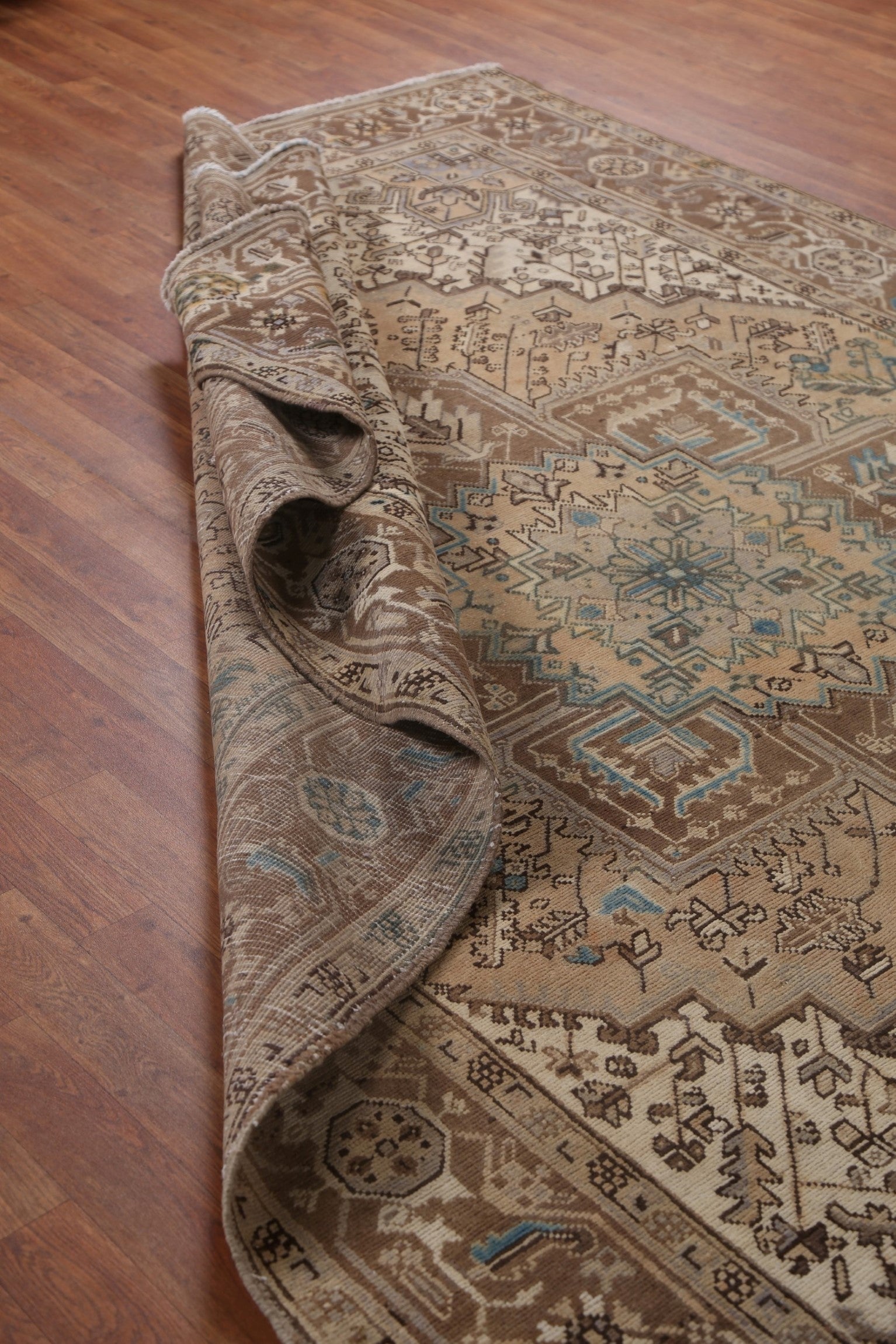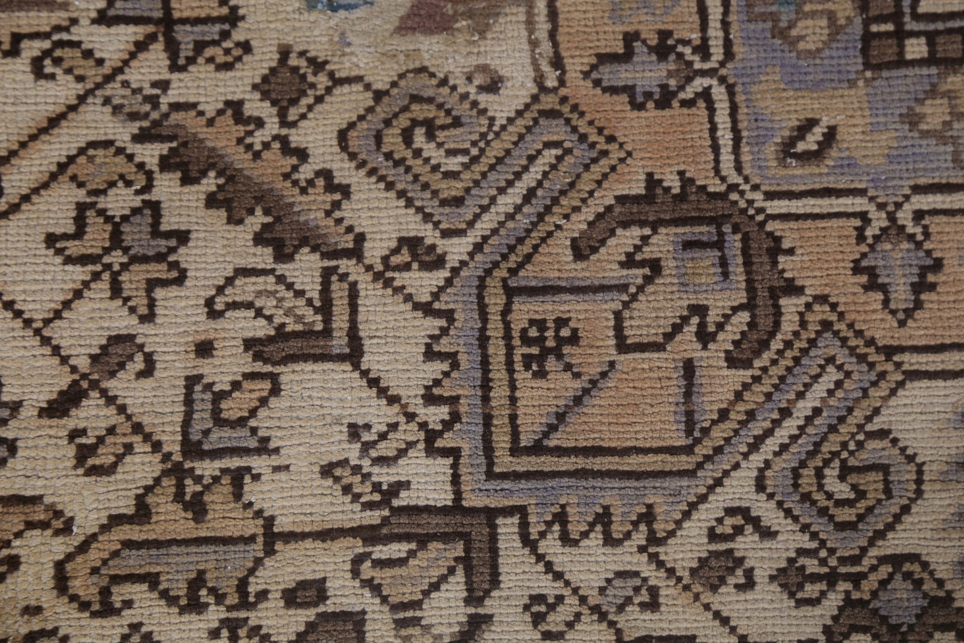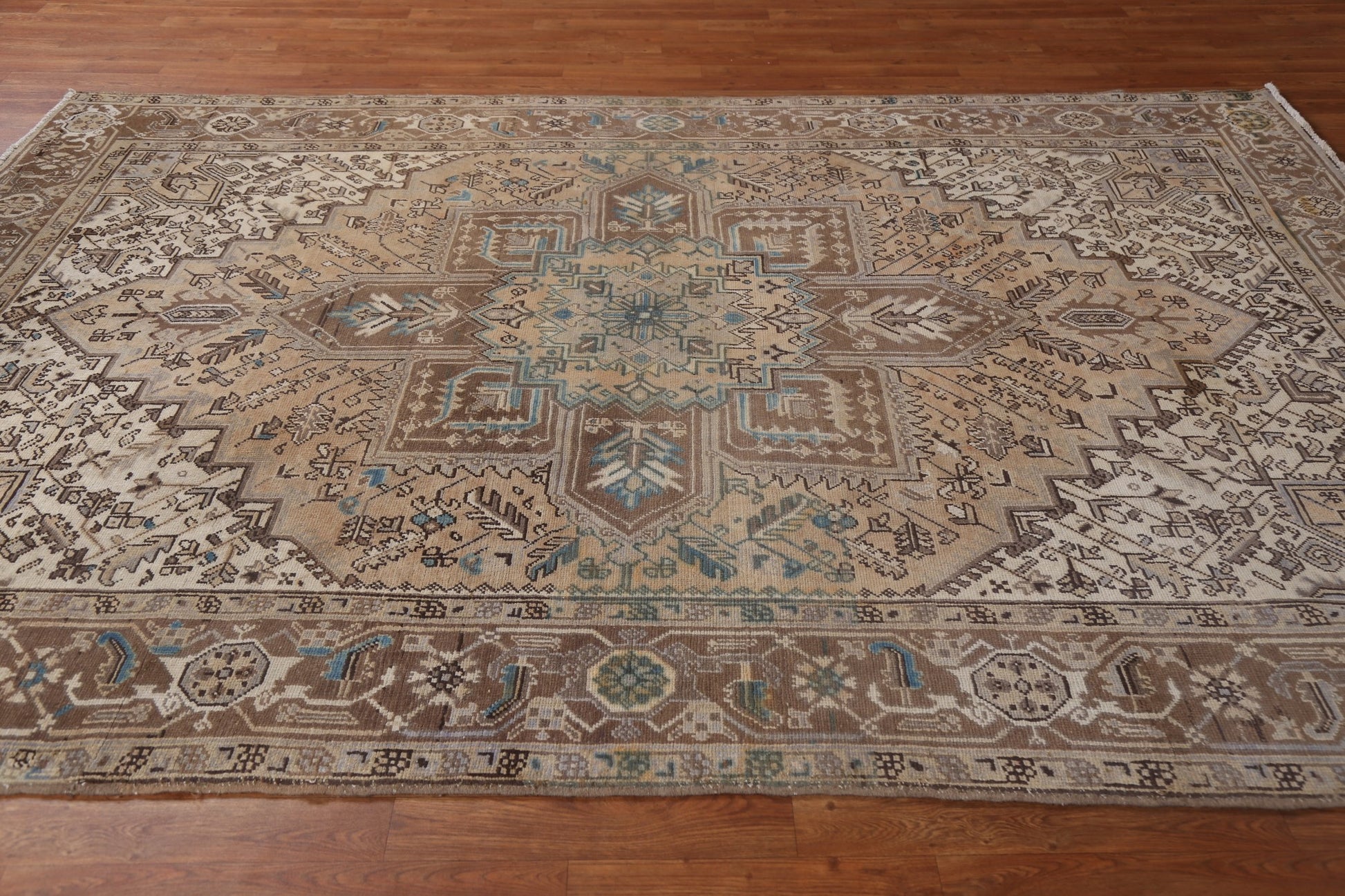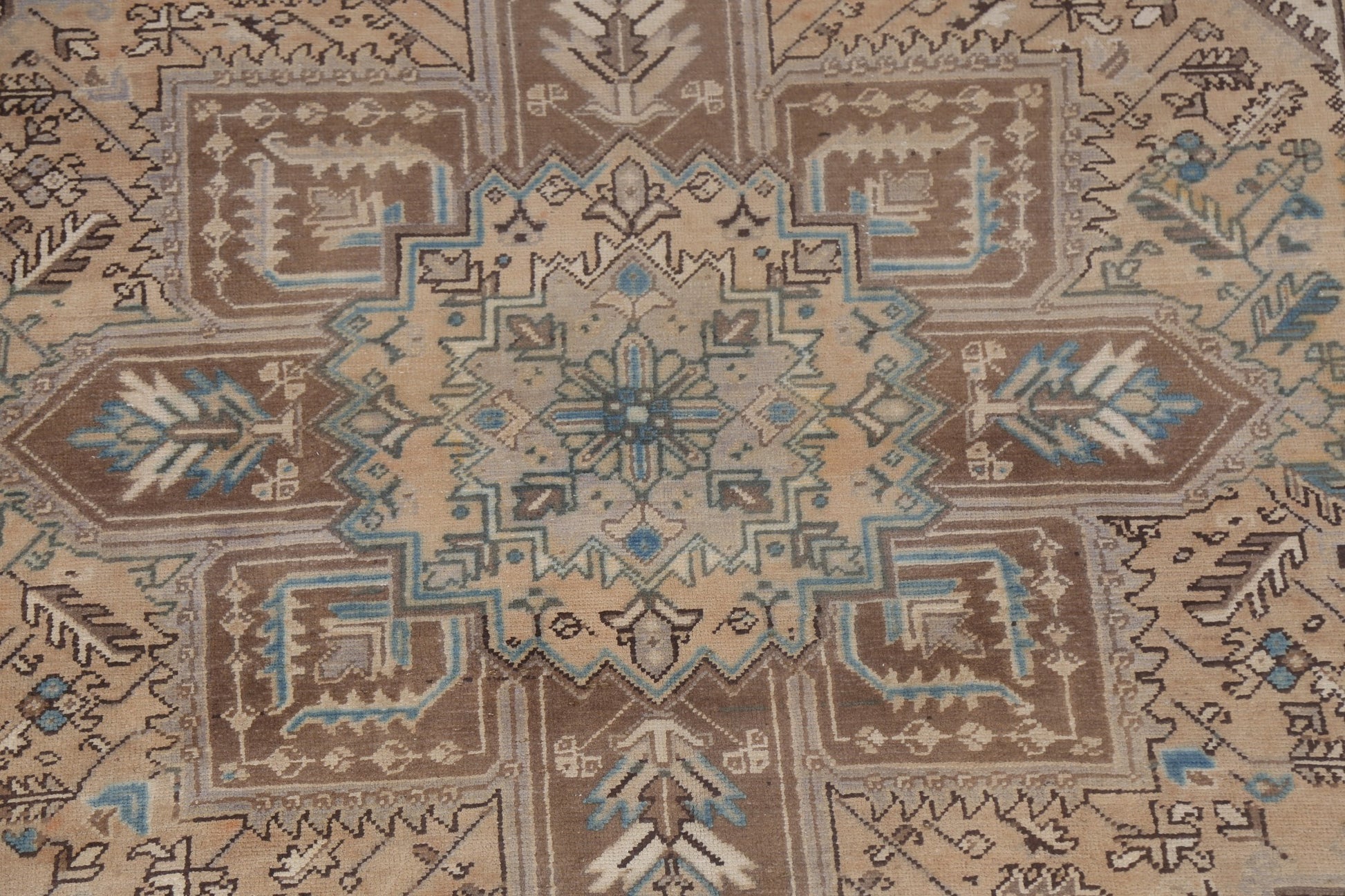 A Beautiful Genuine Persia ( Persia ) Heriz rug is Hand Knotted by skillful weavers in Persia ( Persia ) with 100% Wool Material. This rug is in Very Good (Low Pile-Repair) condition. dimensions are 9' 5'' X 6' 7'' in foot and 287 X 201 in centimeter. the primary color is Peach.