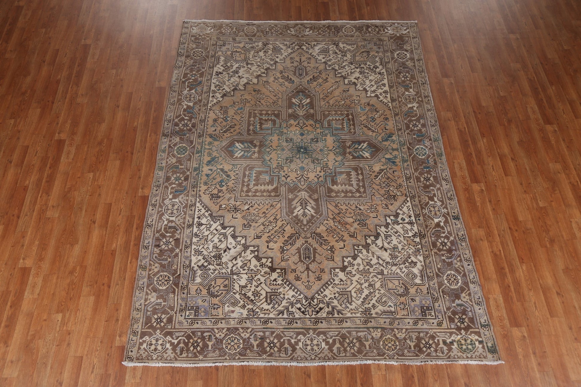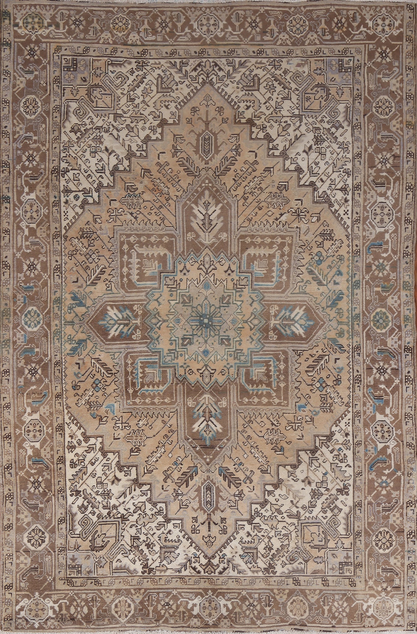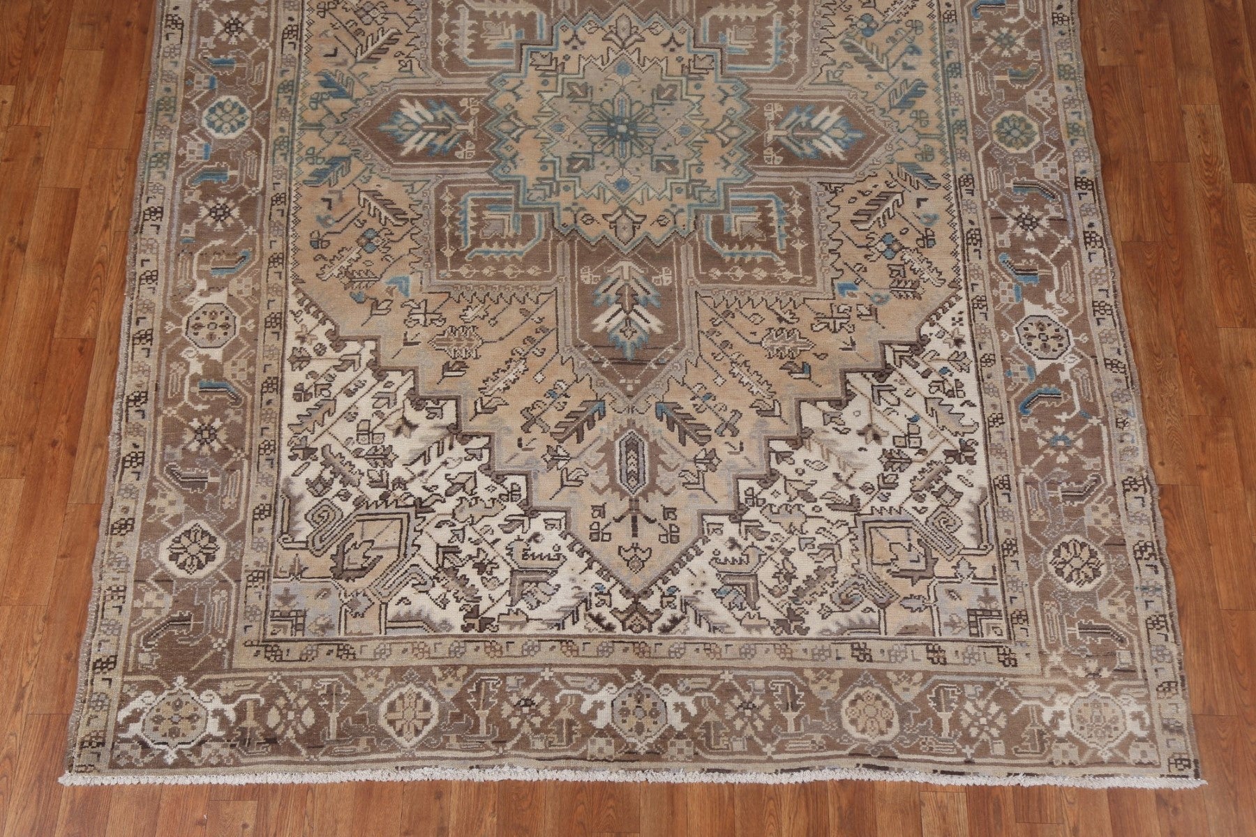 A Beautiful Genuine Persia ( Persia ) Heriz rug is Hand Knotted by skillful weavers in Persia ( Persia ) with 100% Wool Material. This rug is in Very Good (Low Pile-Repair) condition. dimensions are 9' 5'' X 6' 7'' in foot and 287 X 201 in centimeter. the primary color is Peach.