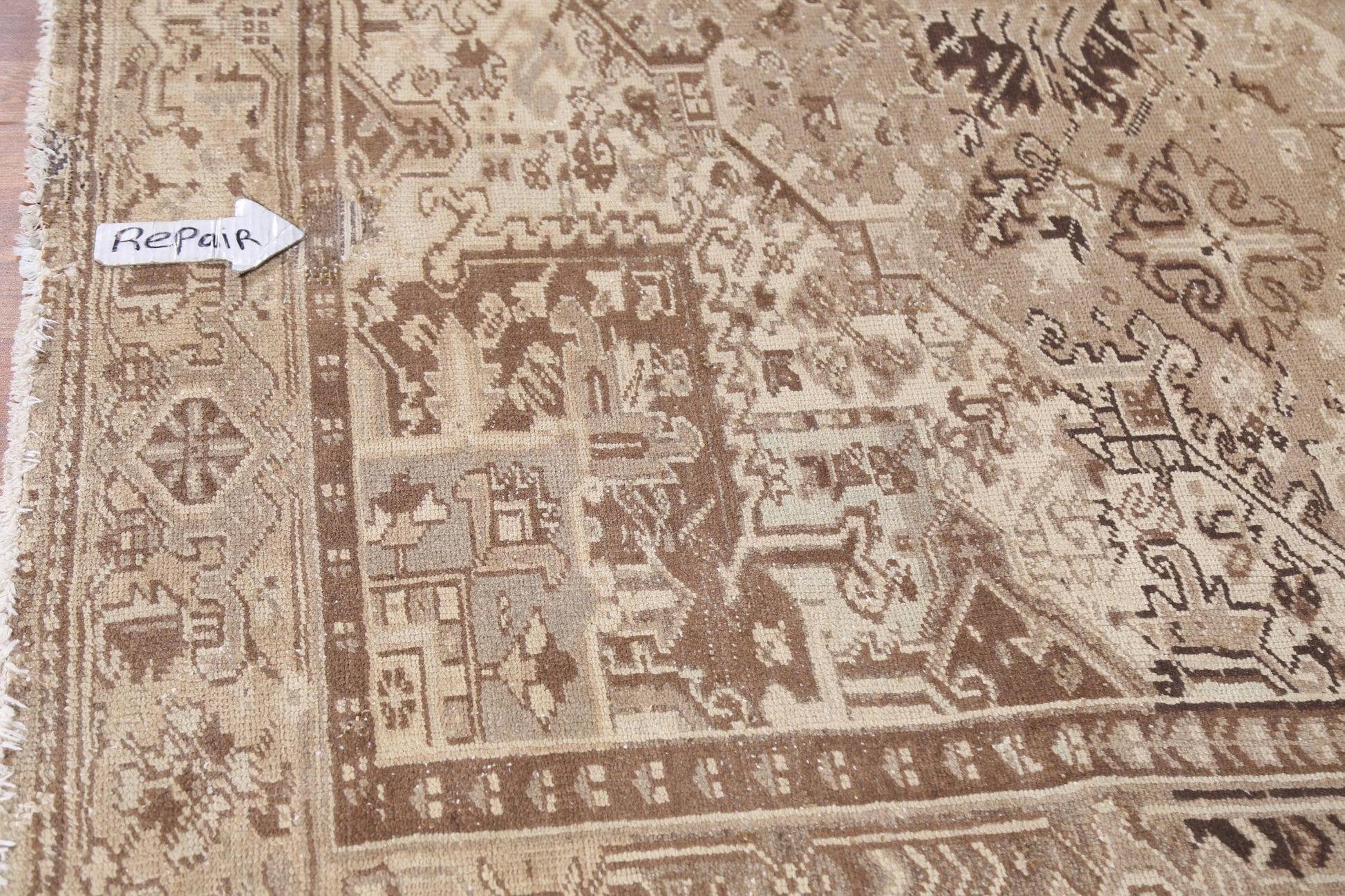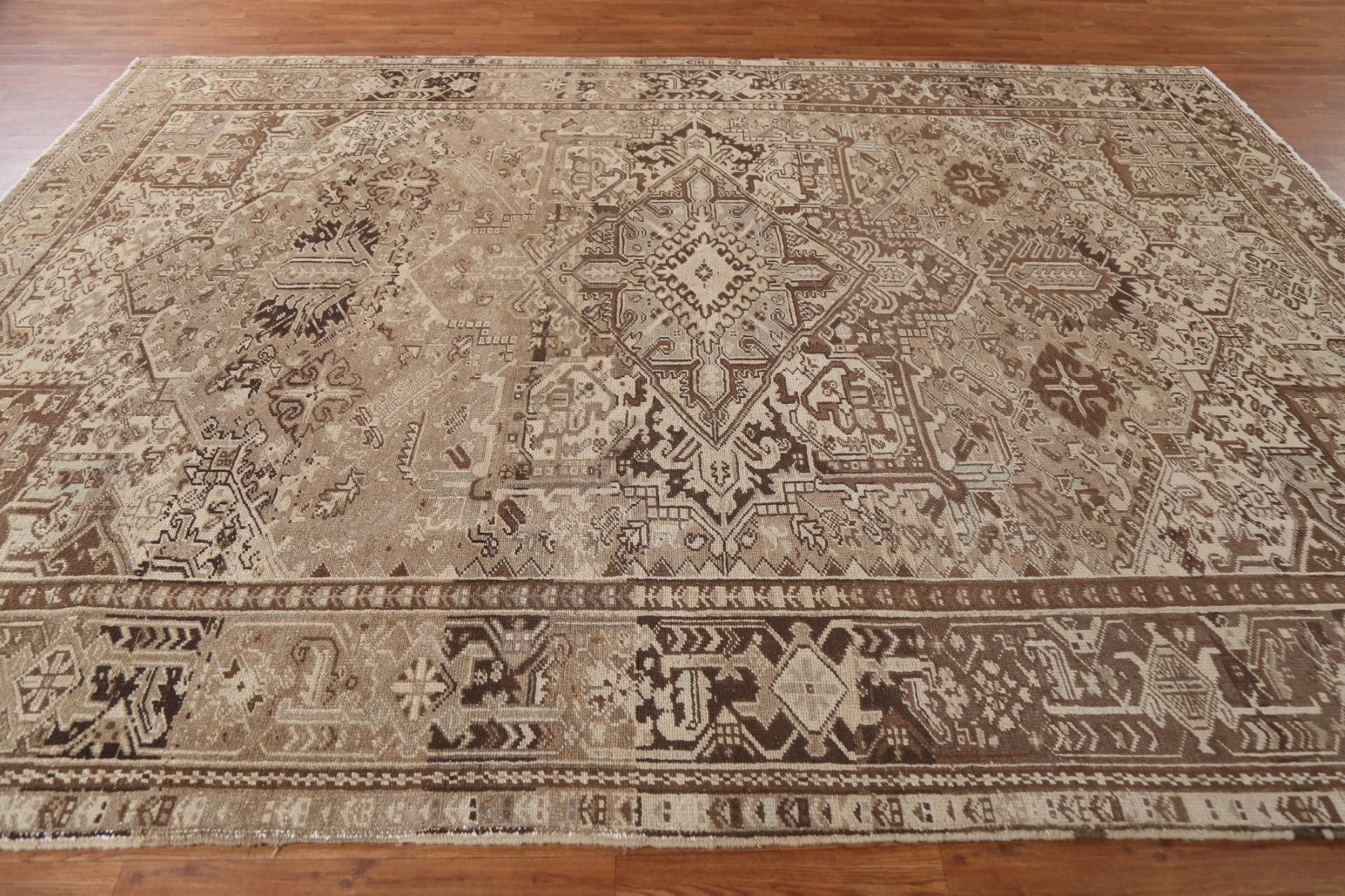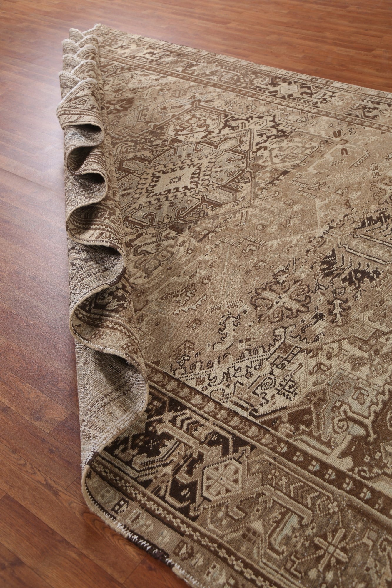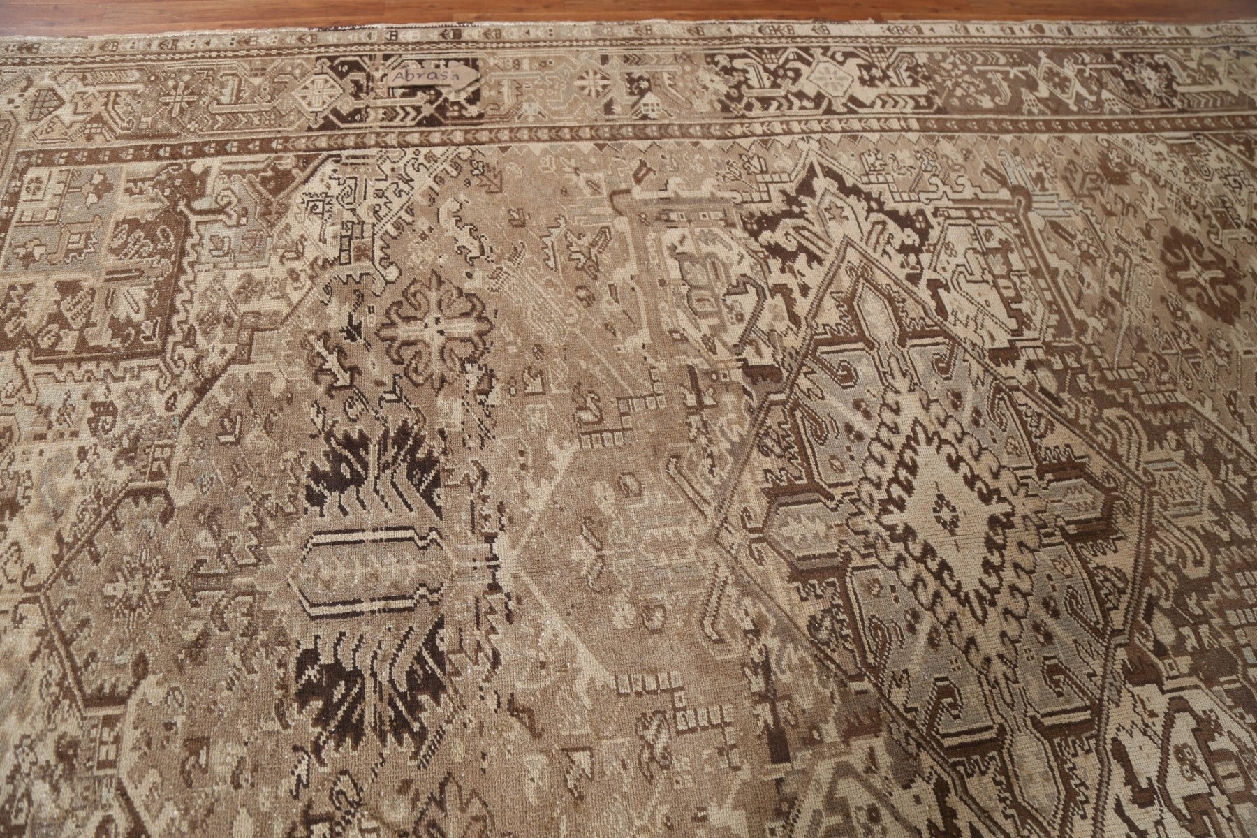 A Beautiful Genuine Persia ( Persia ) Heriz rug is Hand Knotted by skillful weavers in Persia ( Persia ) with 100% Wool Material. This rug is in Very Good (Low Pile-Repair) condition. dimensions are 11' 1'' X 8' 4'' in foot and 338 X 254 in centimeter. the primary color is Beige & Ivories.