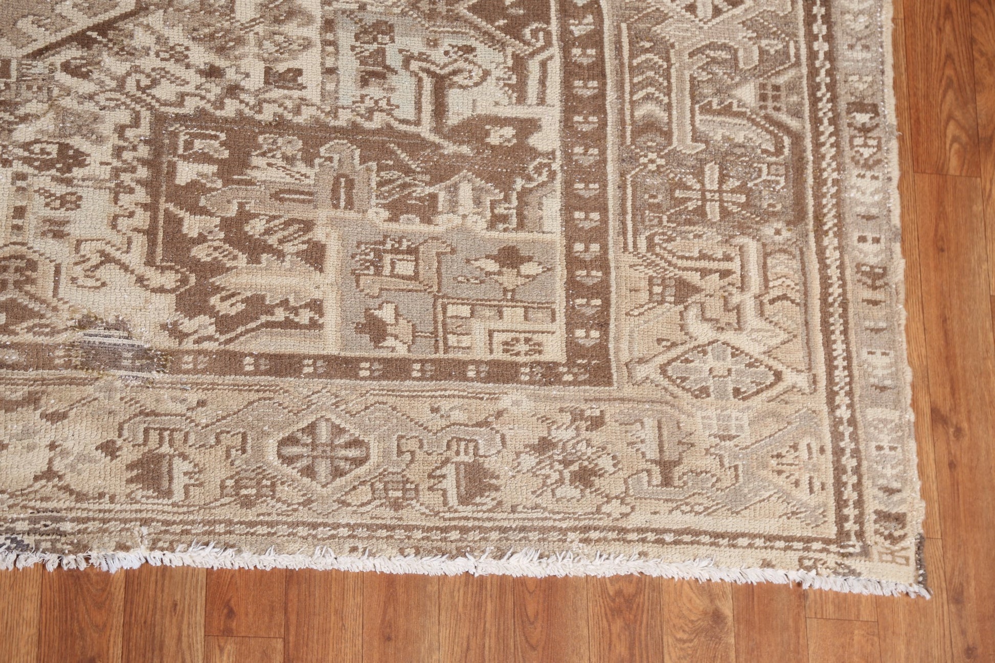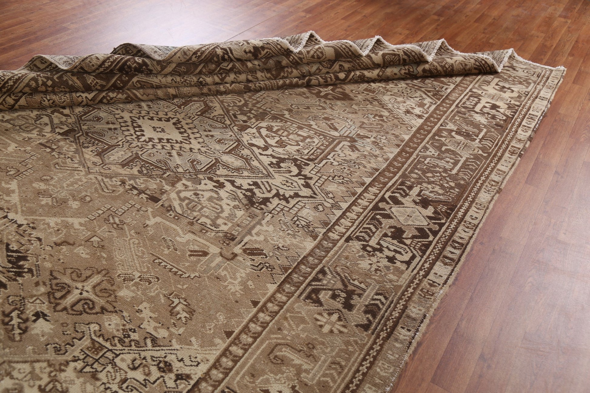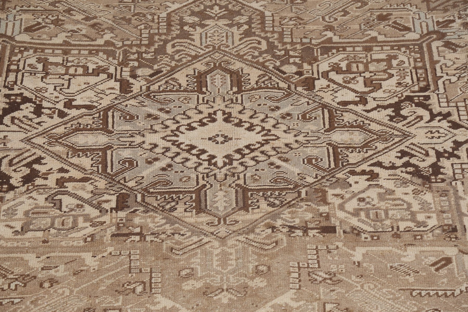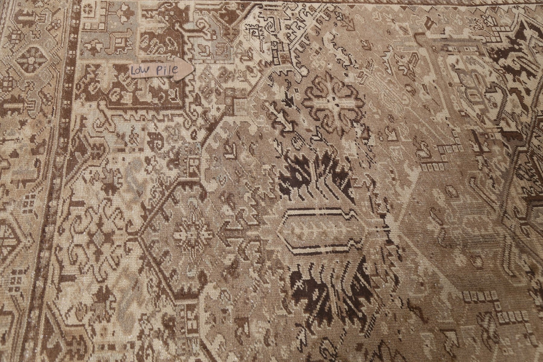 A Beautiful Genuine Persia ( Persia ) Heriz rug is Hand Knotted by skillful weavers in Persia ( Persia ) with 100% Wool Material. This rug is in Very Good (Low Pile-Repair) condition. dimensions are 11' 1'' X 8' 4'' in foot and 338 X 254 in centimeter. the primary color is Beige & Ivories.