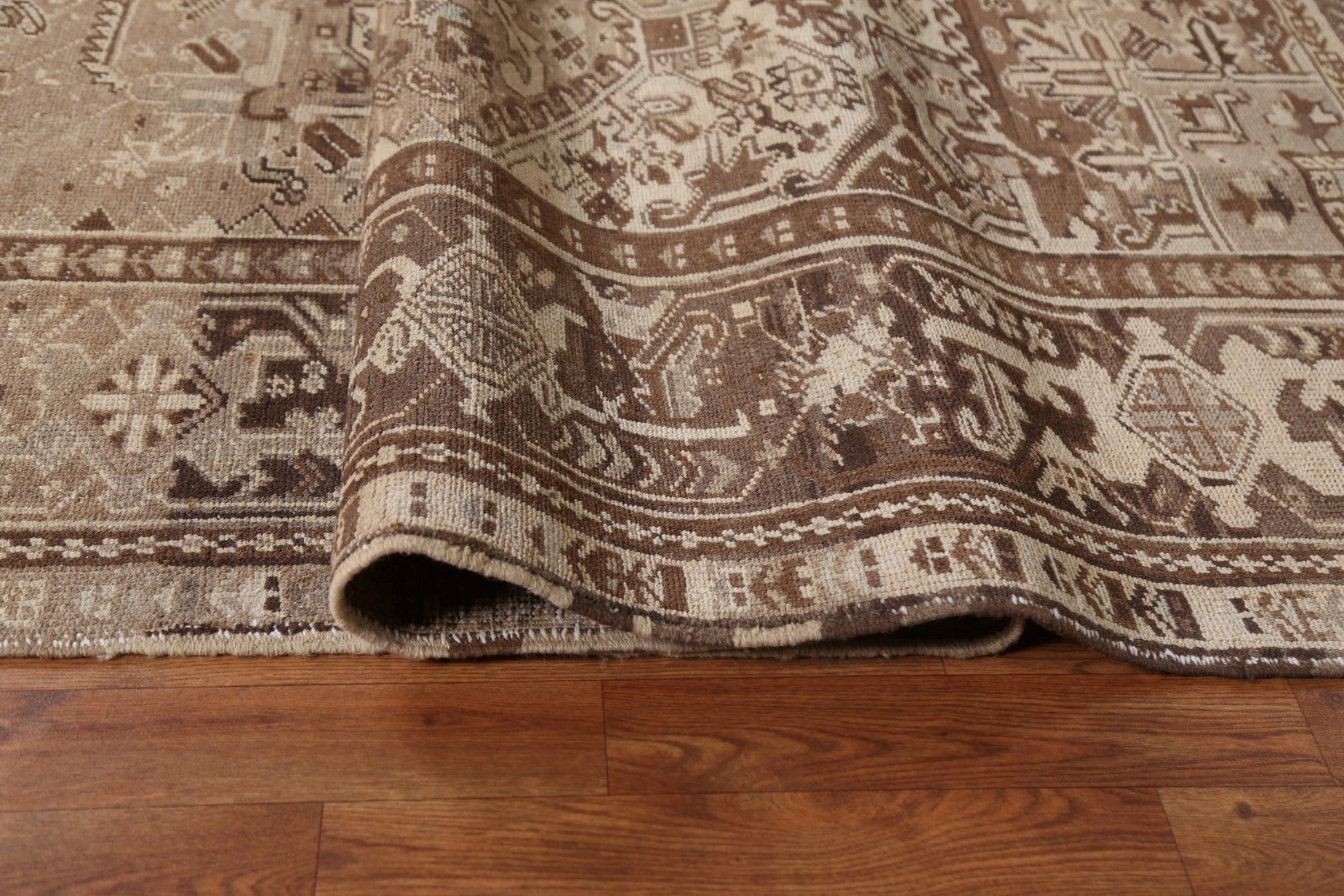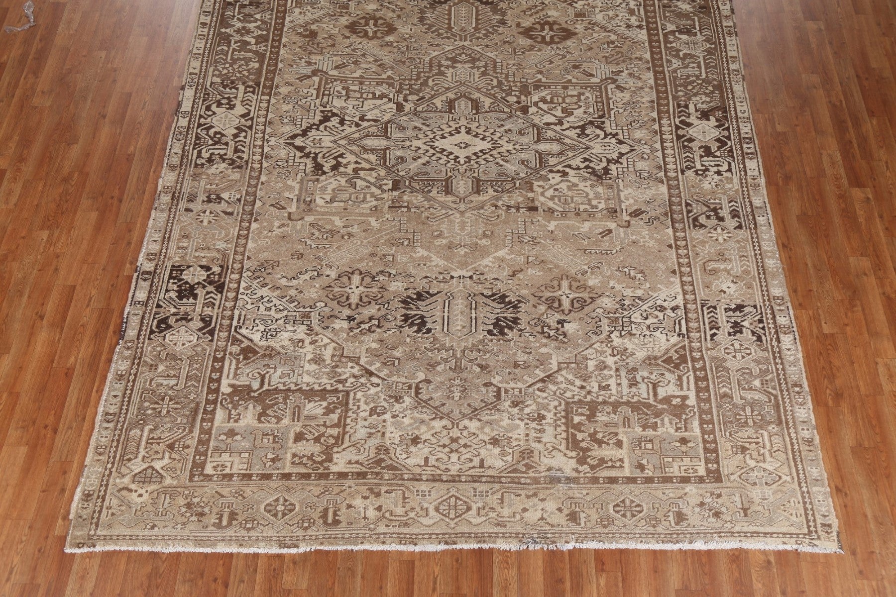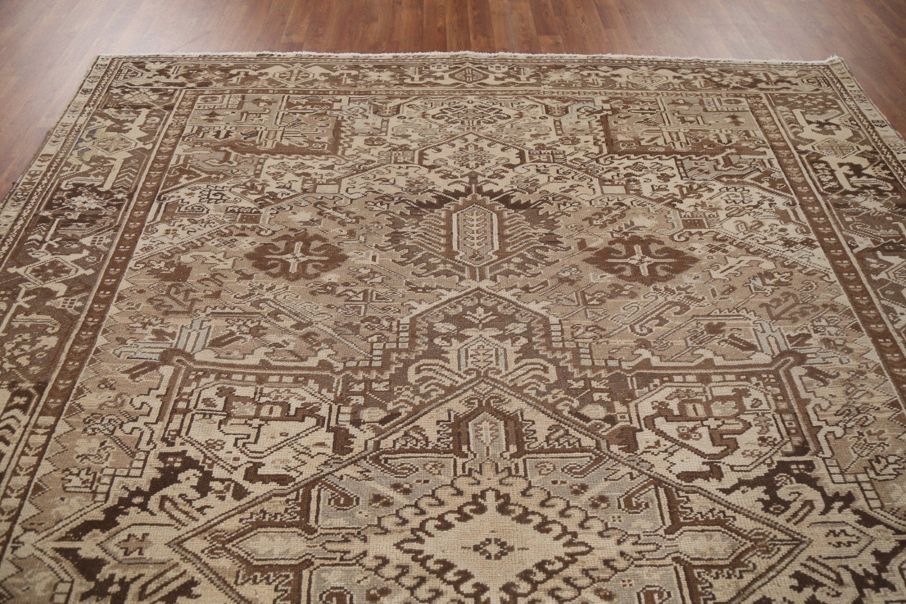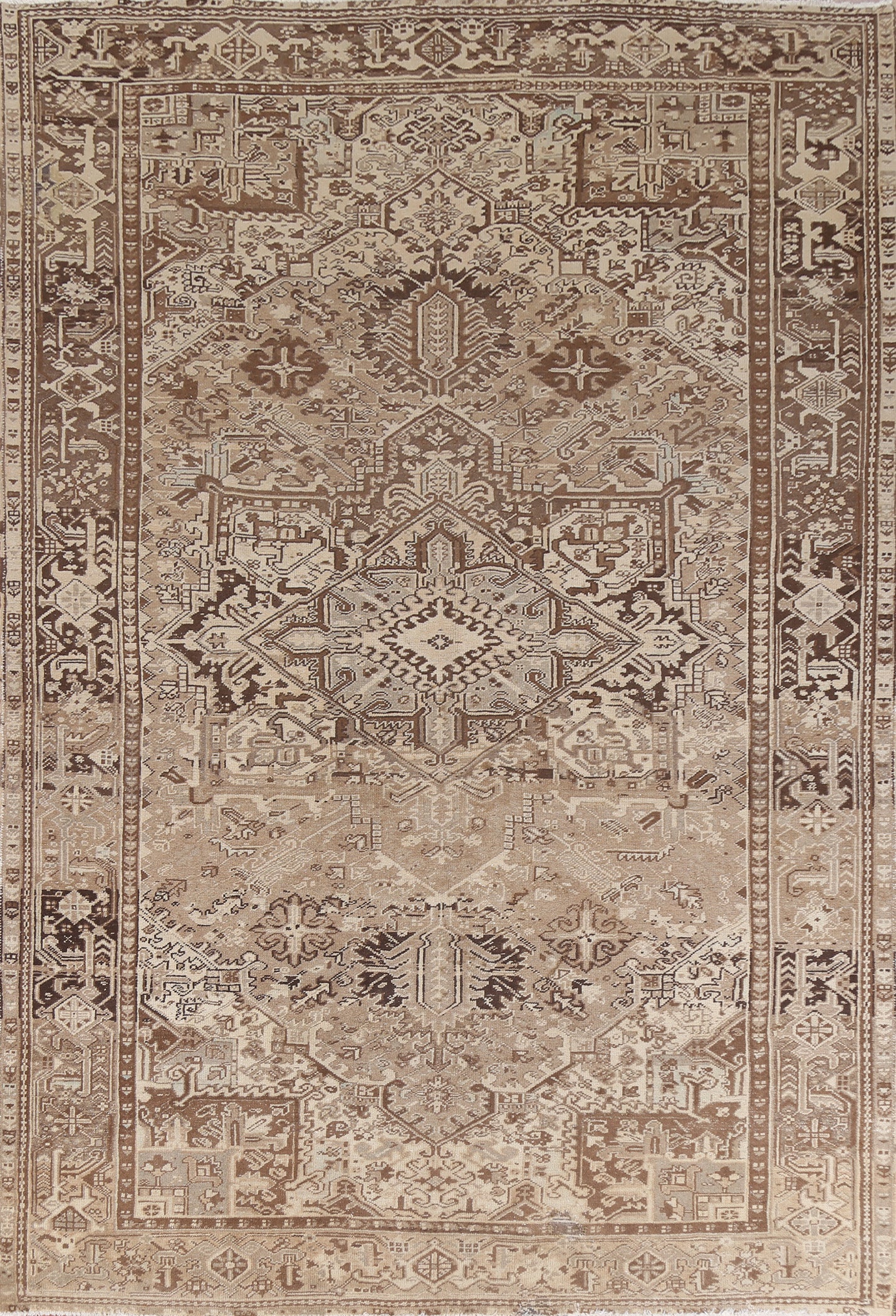 A Beautiful Genuine Persia ( Persia ) Heriz rug is Hand Knotted by skillful weavers in Persia ( Persia ) with 100% Wool Material. This rug is in Very Good (Low Pile-Repair) condition. dimensions are 11' 1'' X 8' 4'' in foot and 338 X 254 in centimeter. the primary color is Beige & Ivories.