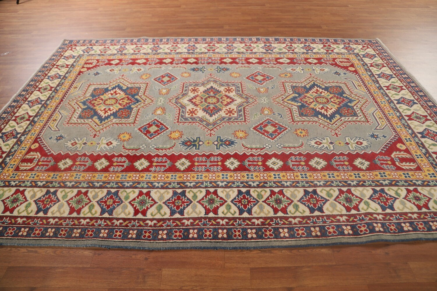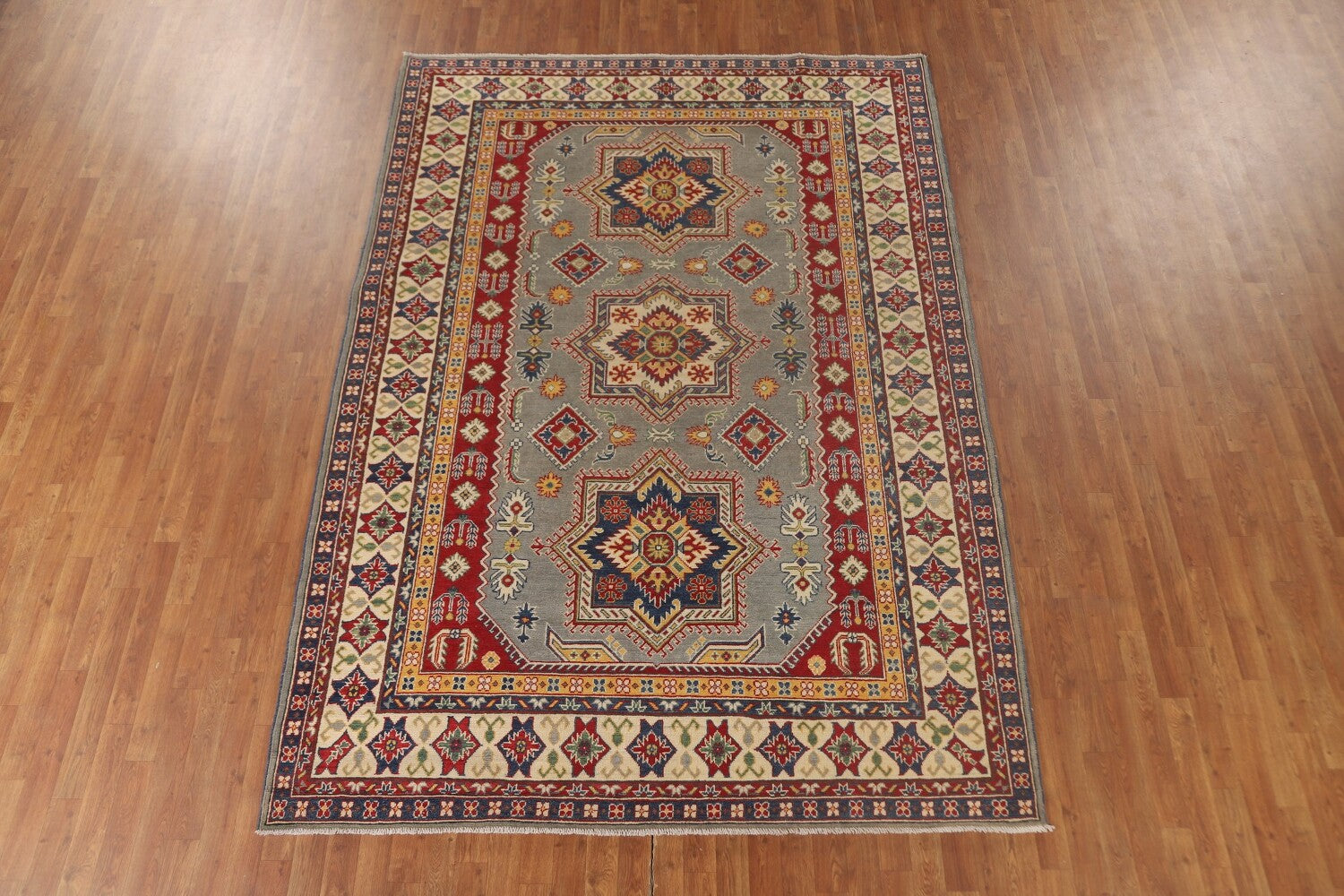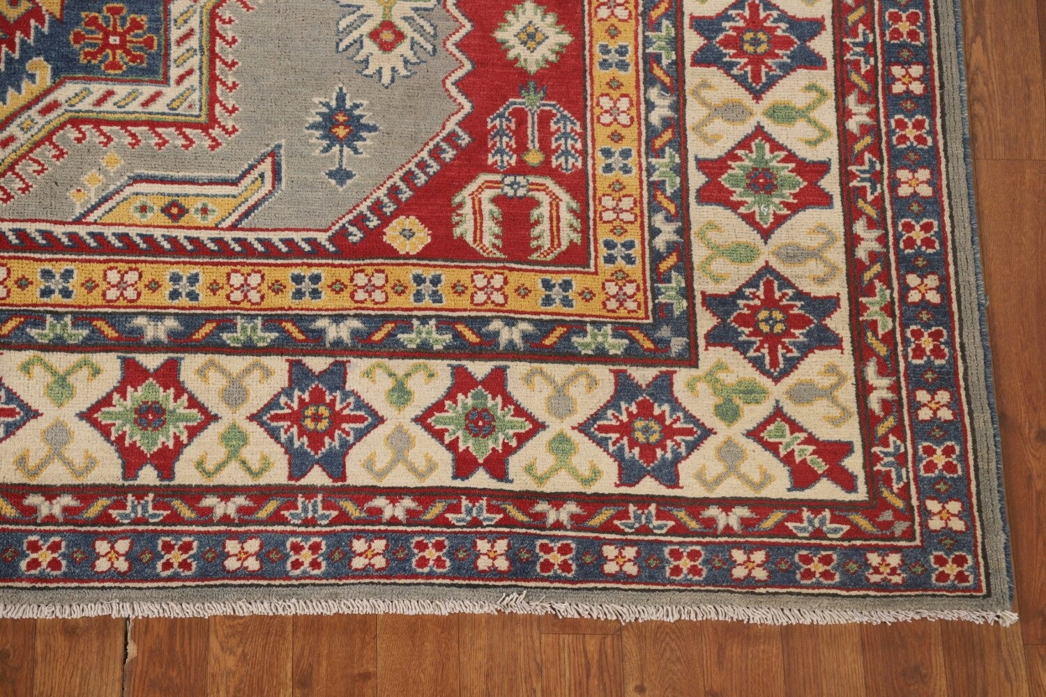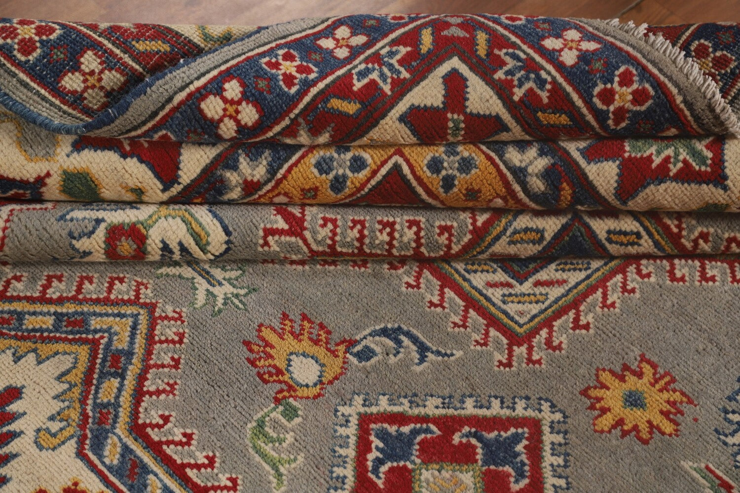 A Beautiful Genuine Pakistan Kazak rug is Hand Knotted by skillful weavers in Pakistan with 100% Wool Material. This rug is in New, First Quality condition. dimensions are 9' 10'' X 6' 11'' in foot and 300 X 211 in centimeter. the primary color is Greys & Charcoal.