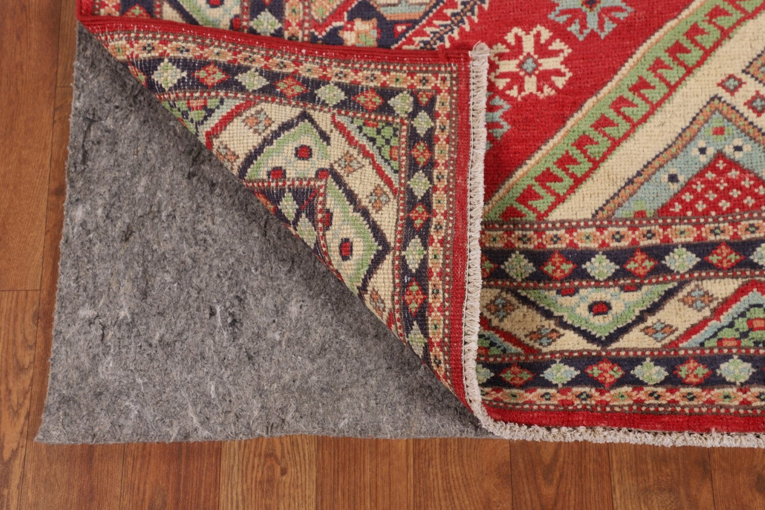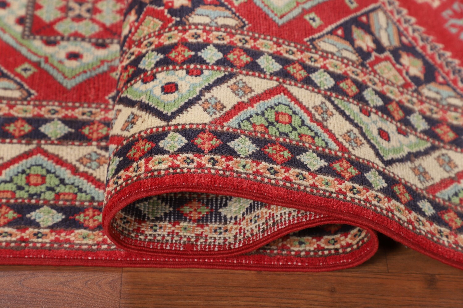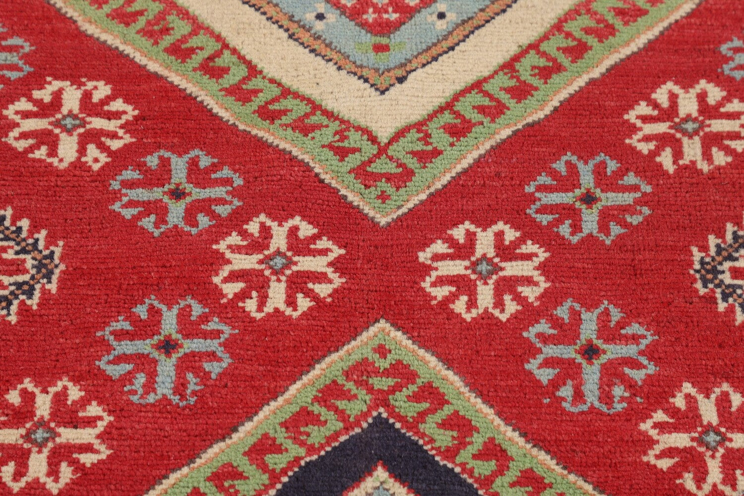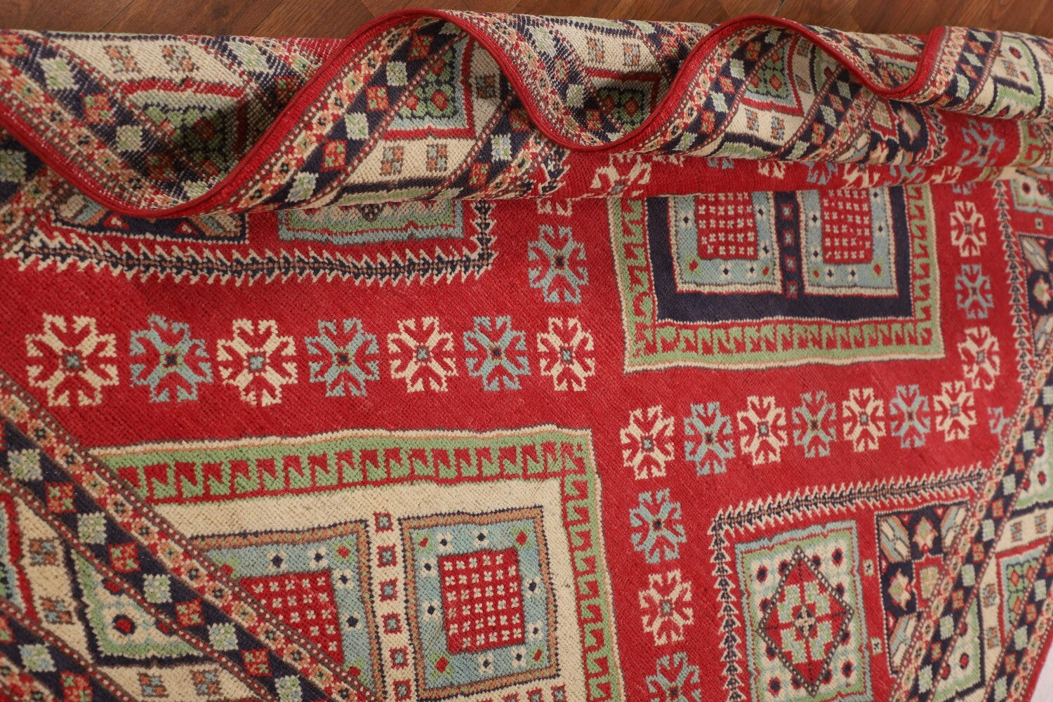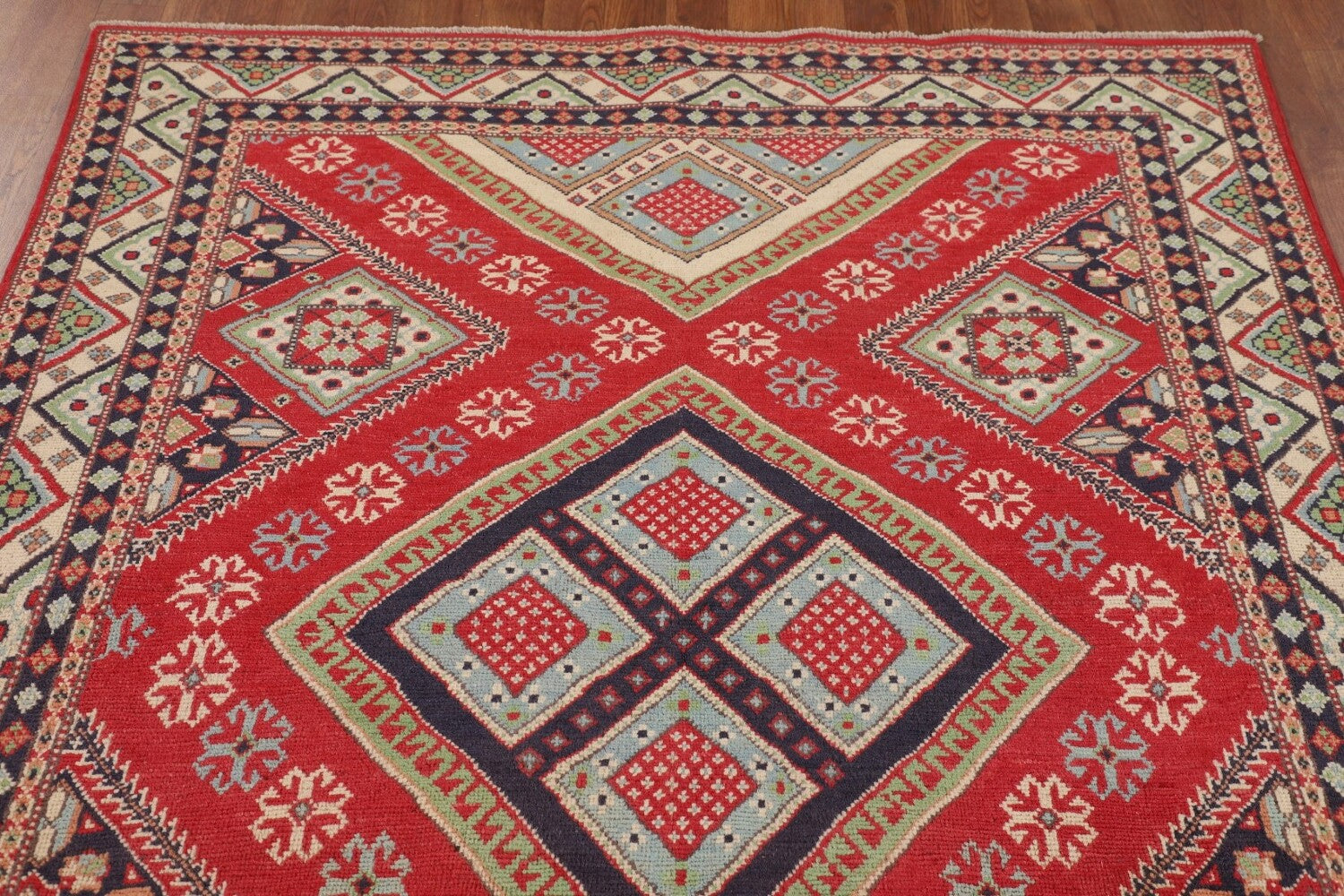 A Beautiful Genuine Pakistan Kazak rug is Hand Knotted by skillful weavers in Pakistan with 100% Wool Material. This rug is in New, First Quality condition. dimensions are 6' 6'' X 4' 10'' in foot and 198 X 147 in centimeter. the primary color is Red.