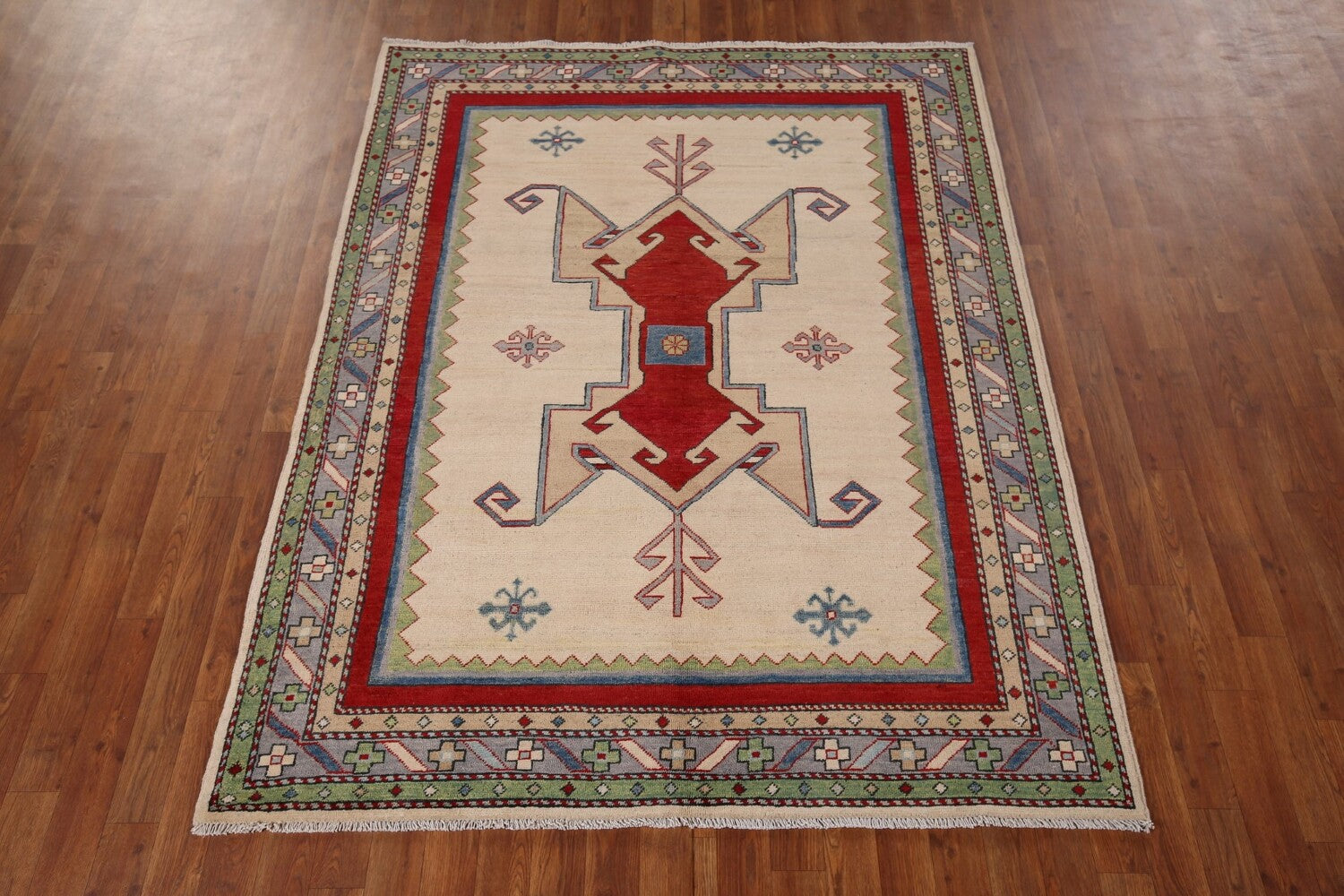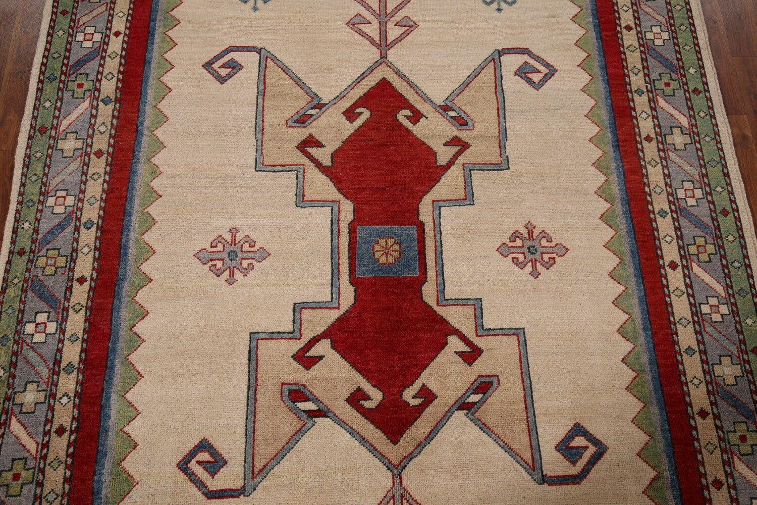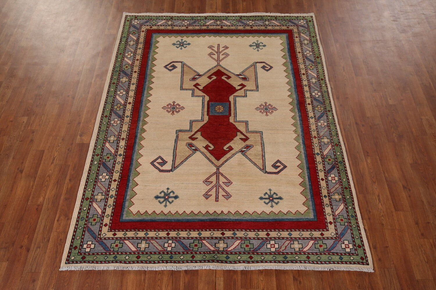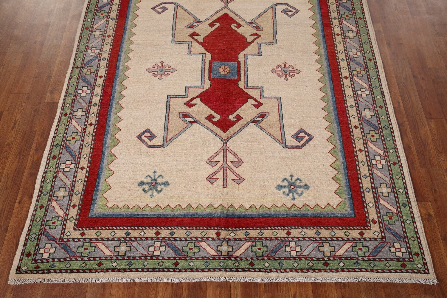 A Beautiful Genuine Pakistan Kazak rug is Hand Knotted by skillful weavers in Pakistan with 100% Wool Material. This rug is in New, First Quality condition. dimensions are 6' 6'' X 5' 0'' in foot and 198 X 152 in centimeter. the primary color is Beige & Ivories.