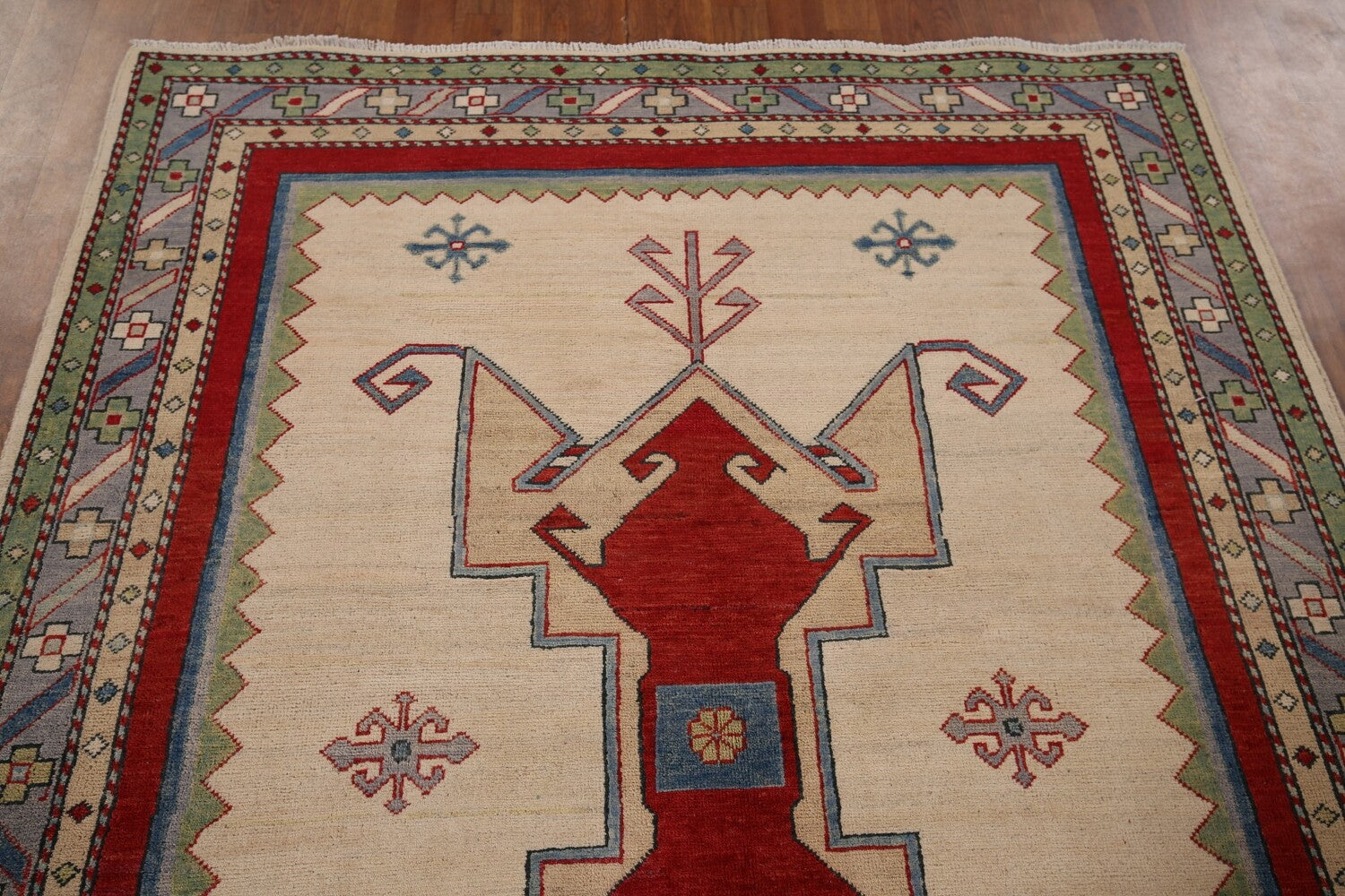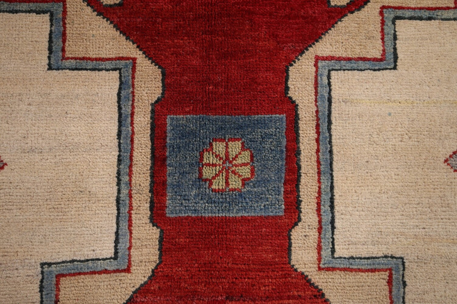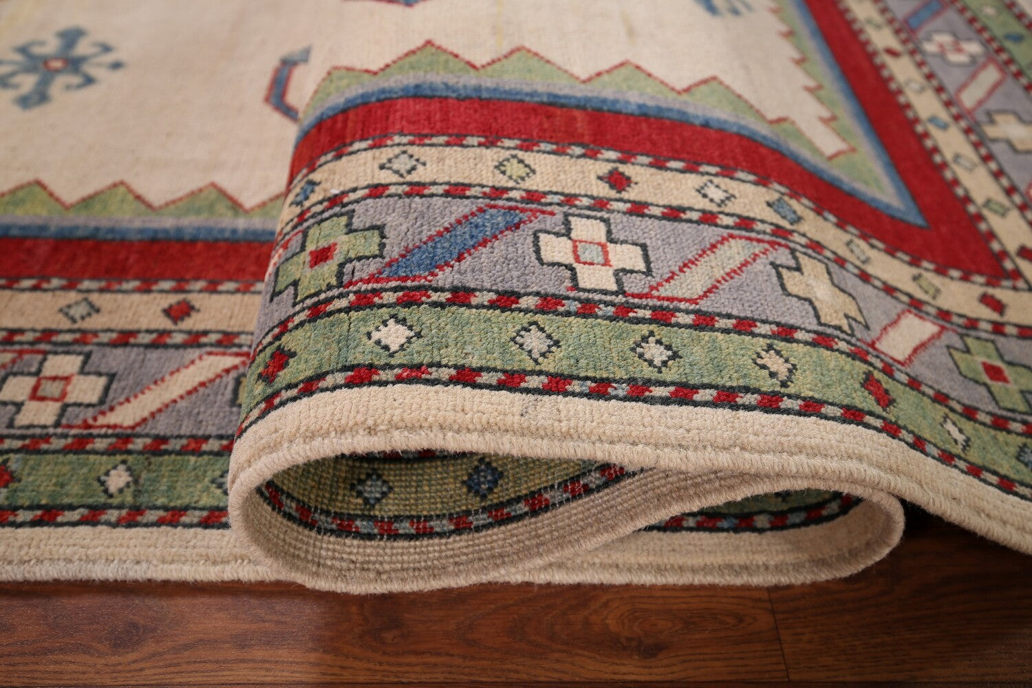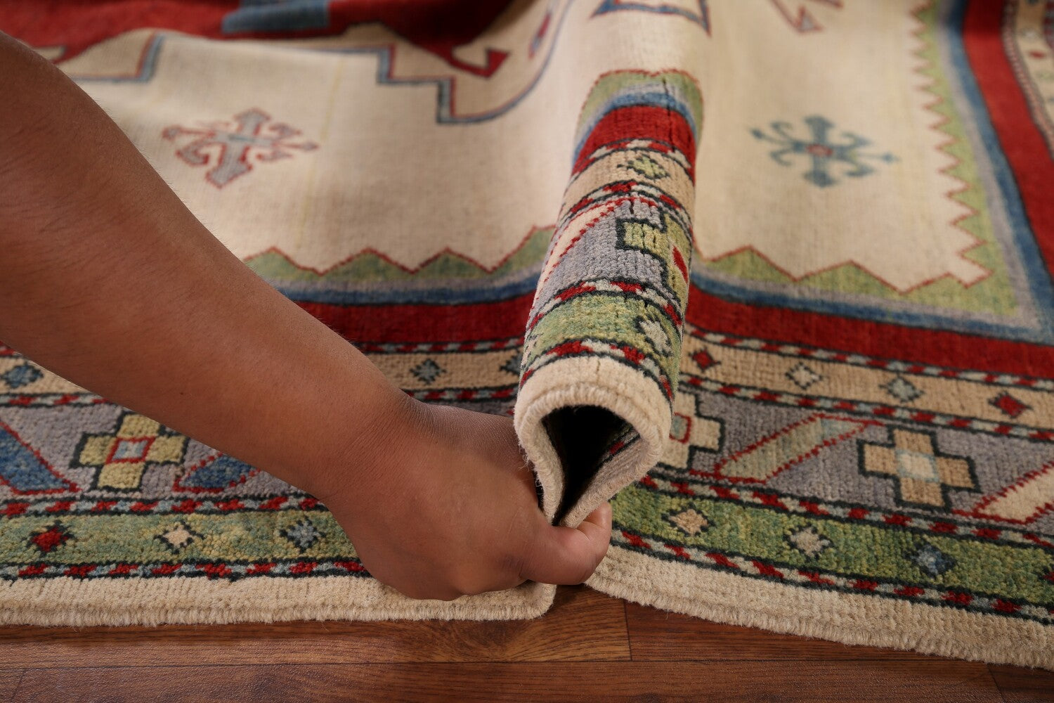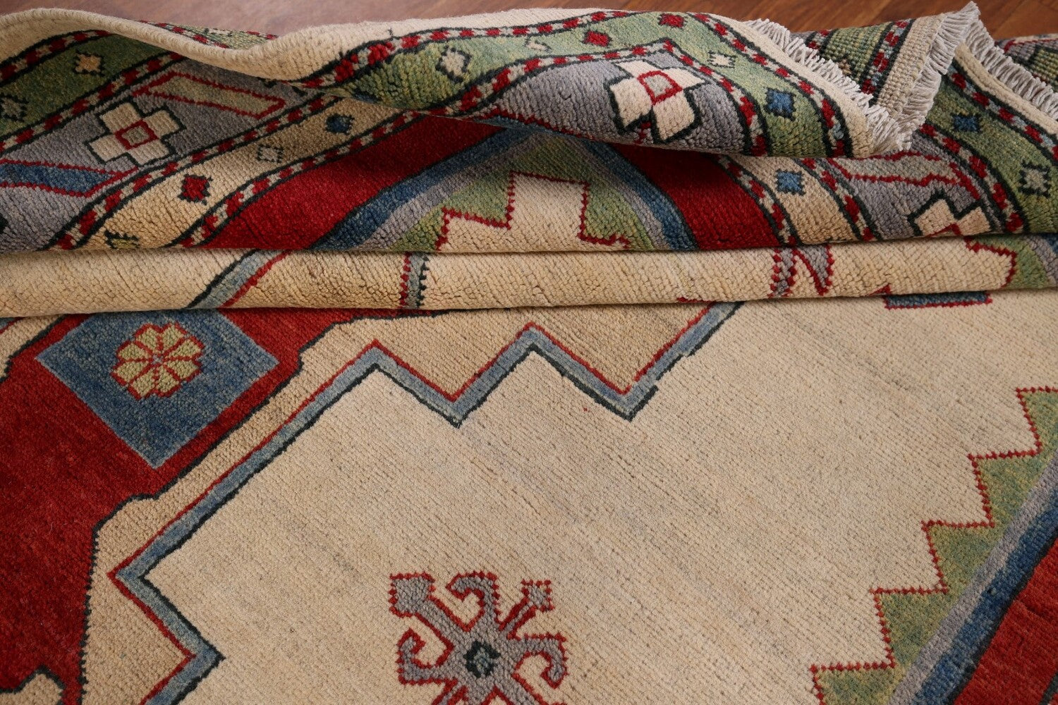 A Beautiful Genuine Pakistan Kazak rug is Hand Knotted by skillful weavers in Pakistan with 100% Wool Material. This rug is in New, First Quality condition. dimensions are 6' 6'' X 5' 0'' in foot and 198 X 152 in centimeter. the primary color is Beige & Ivories.