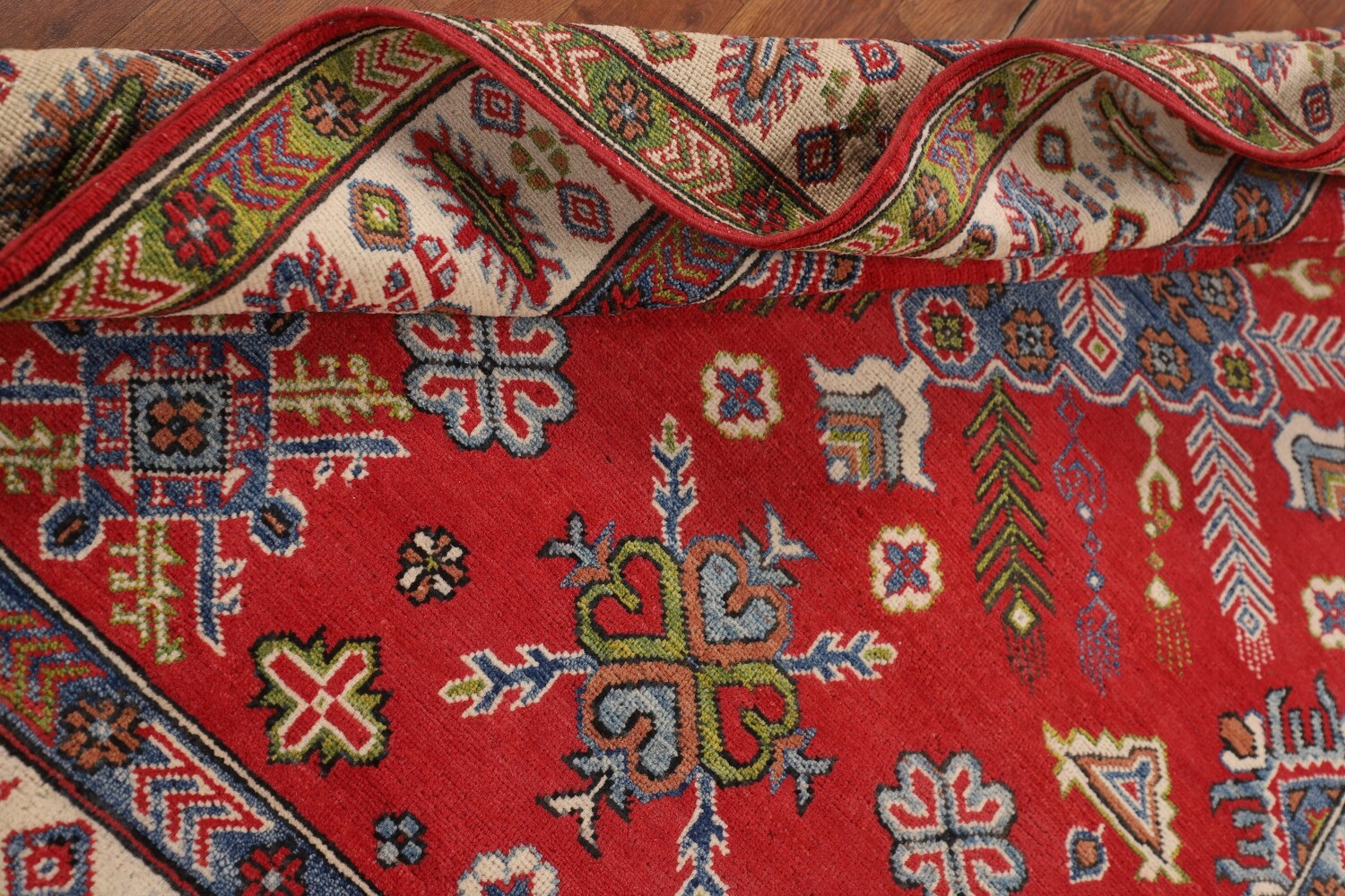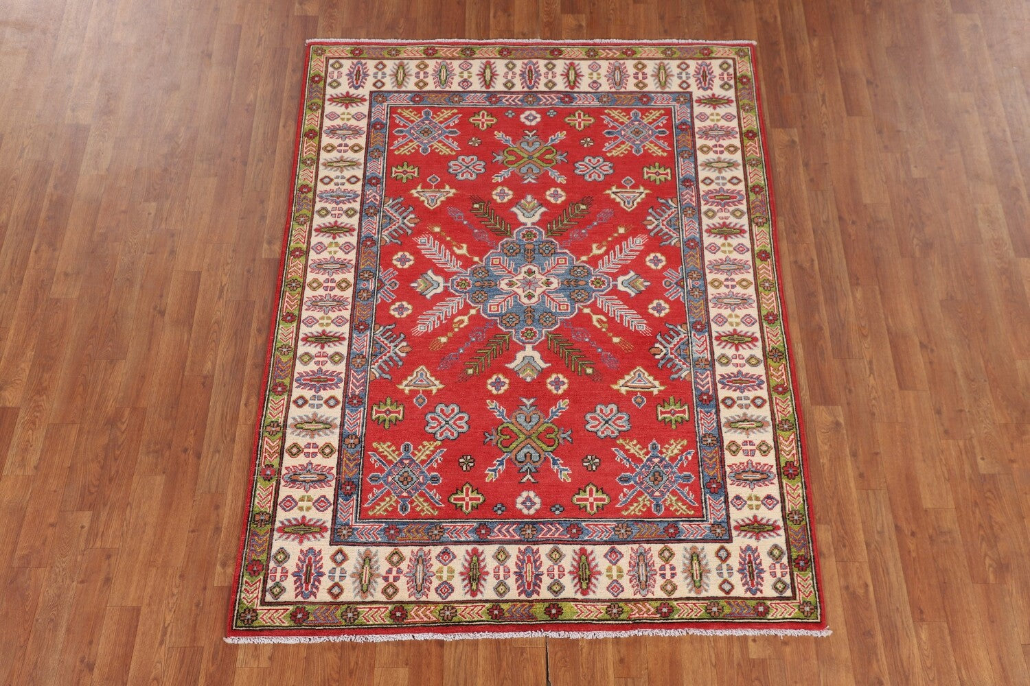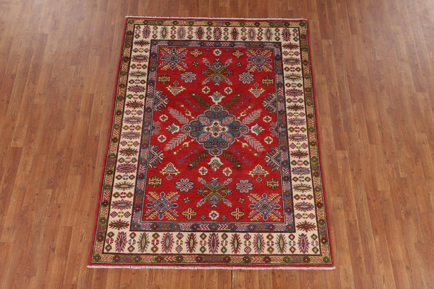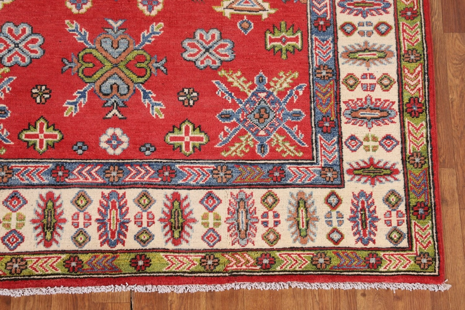 A Beautiful Genuine Pakistan Kazak rug is Hand Knotted by skillful weavers in Pakistan with 100% Wool Material. This rug is in New, First Quality condition. dimensions are 6' 8'' X 4' 11'' in foot and 203 X 150 in centimeter. the primary color is Red.