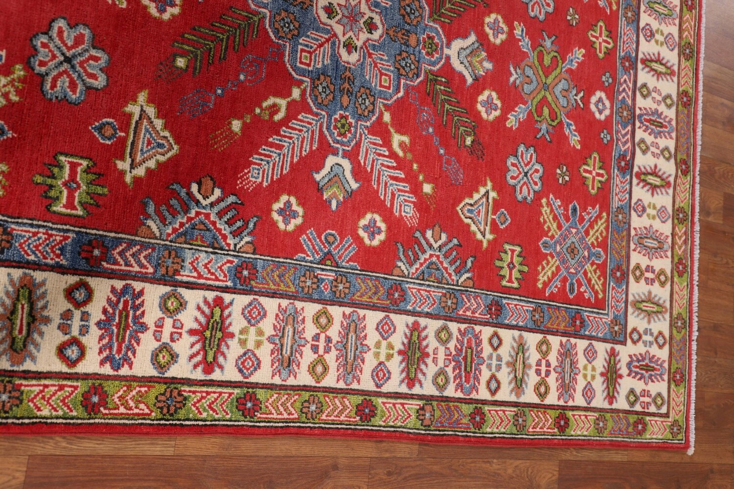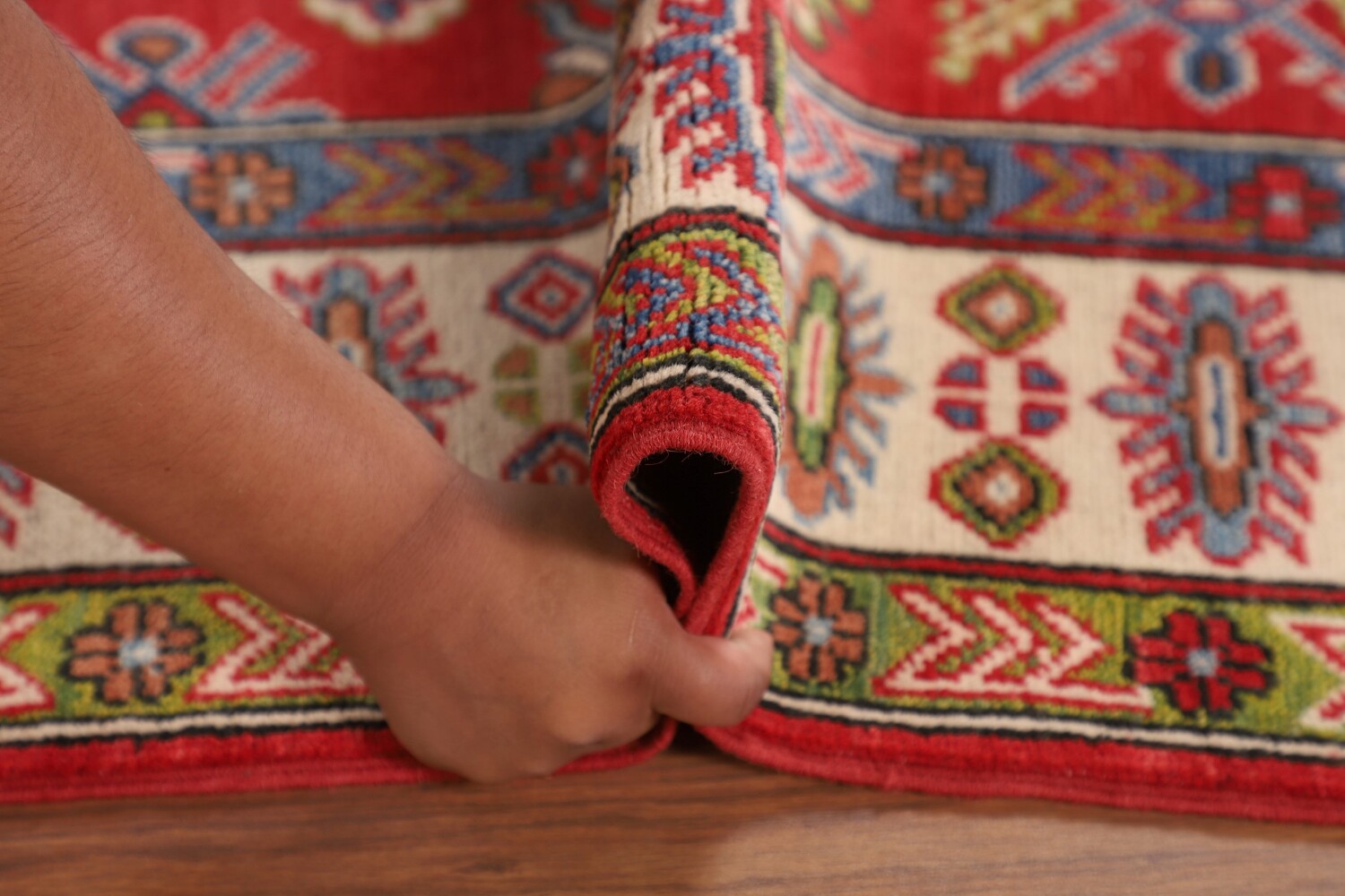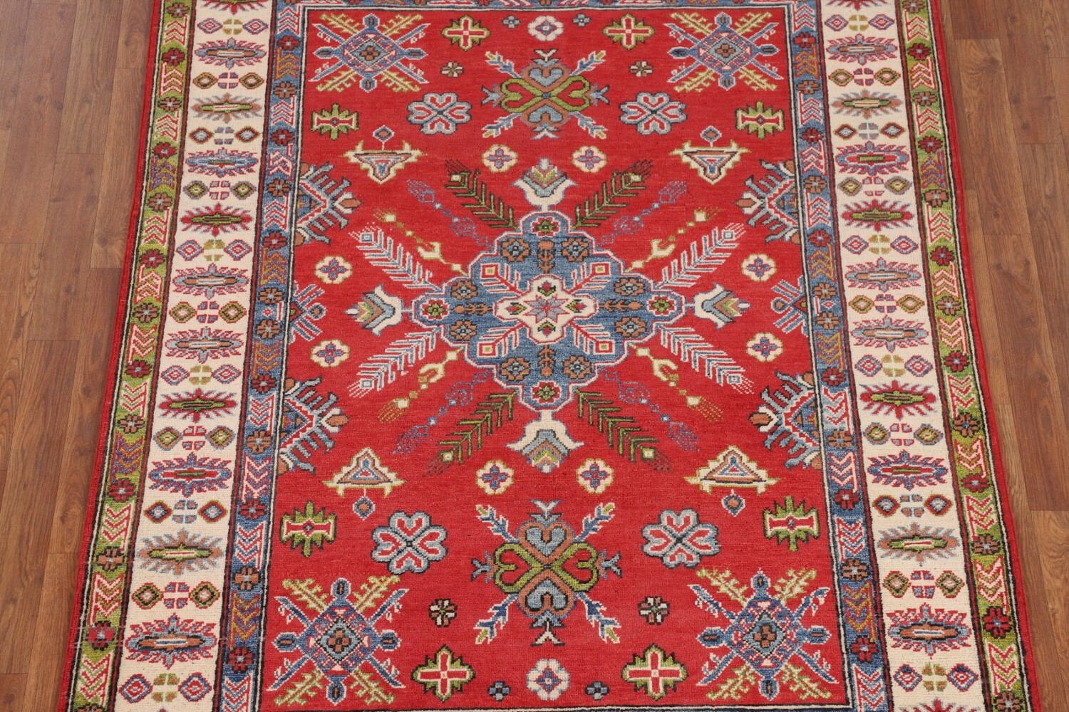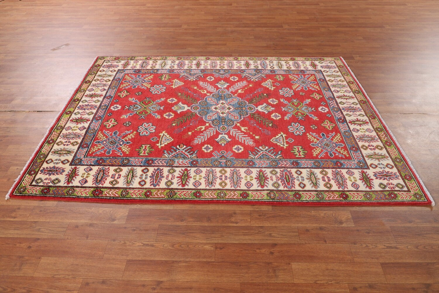 A Beautiful Genuine Pakistan Kazak rug is Hand Knotted by skillful weavers in Pakistan with 100% Wool Material. This rug is in New, First Quality condition. dimensions are 6' 8'' X 4' 11'' in foot and 203 X 150 in centimeter. the primary color is Red.