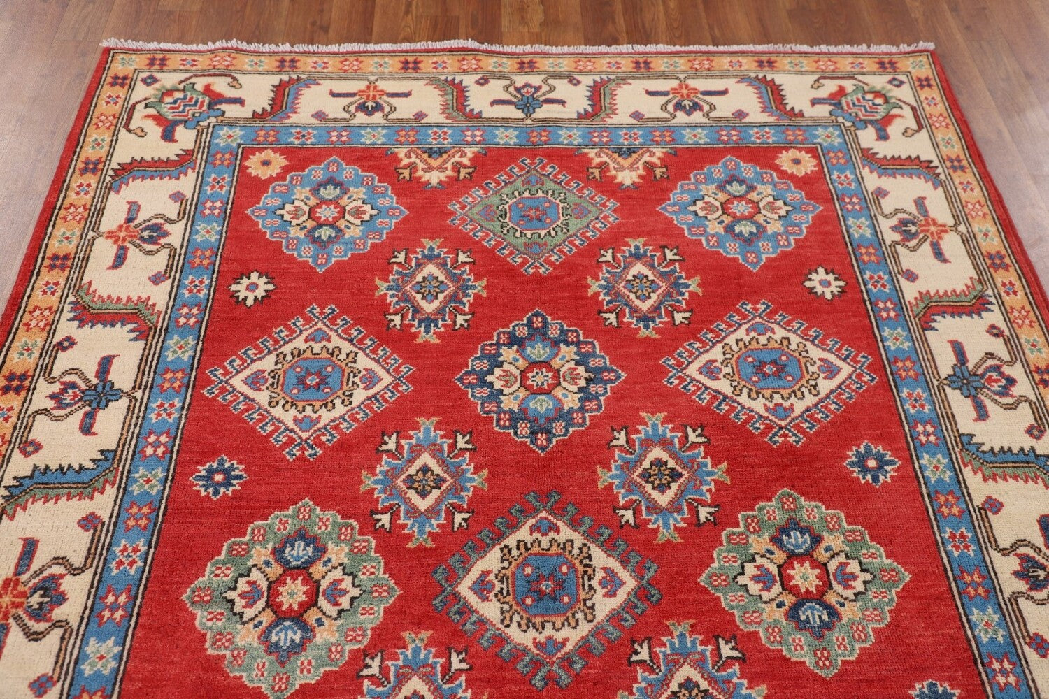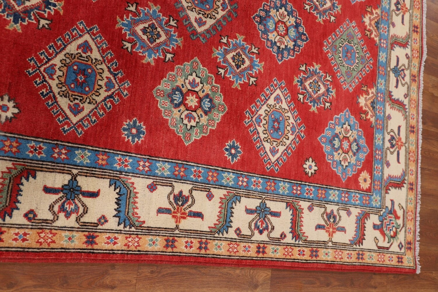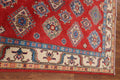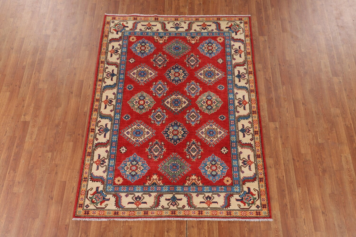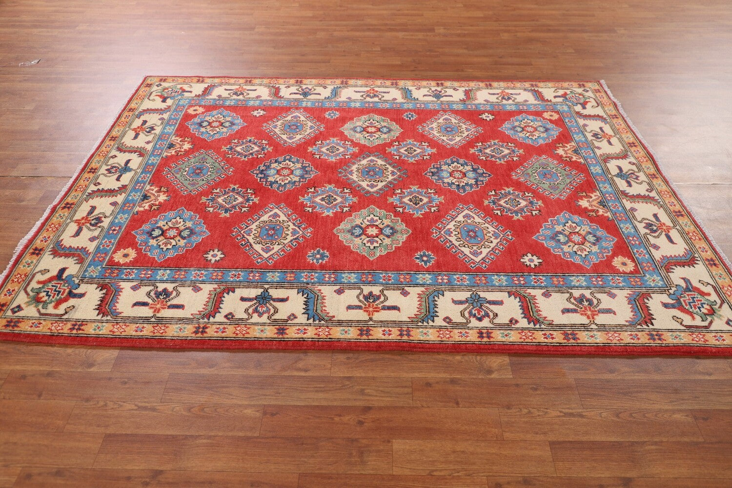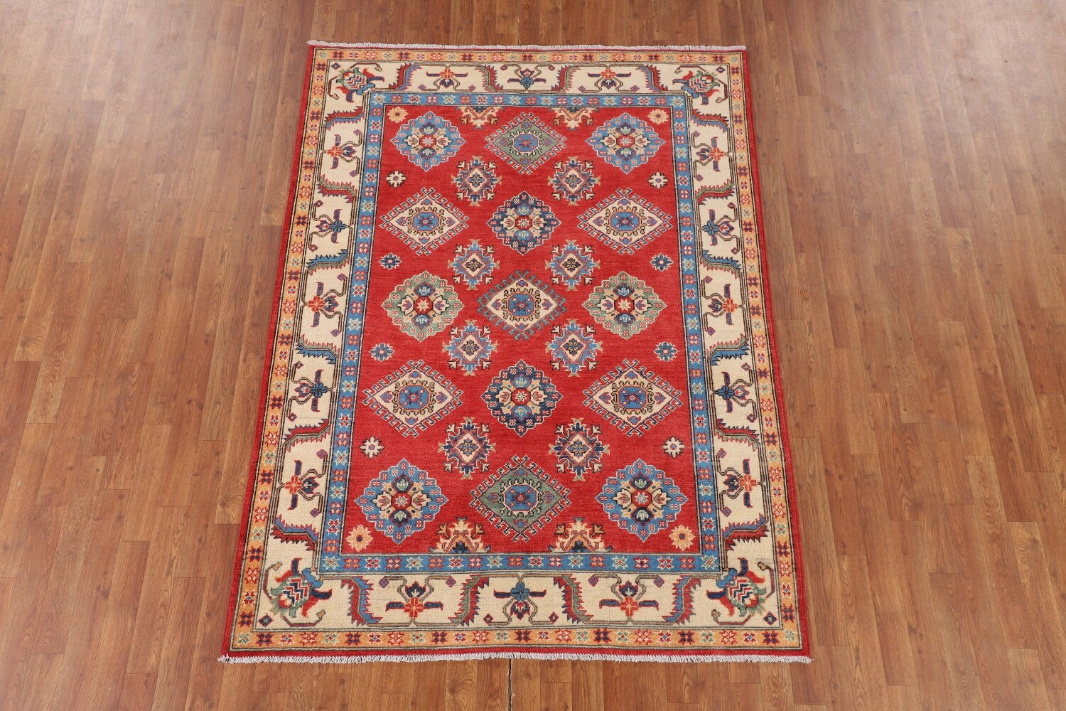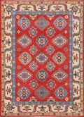 A Beautiful Genuine Pakistan Kazak rug is Hand Knotted by skillful weavers in Pakistan with 100% Wool Material. This rug is in New, First Quality condition. dimensions are 7' 0'' X 5' 2'' in foot and 213 X 157 in centimeter. the primary color is Red.