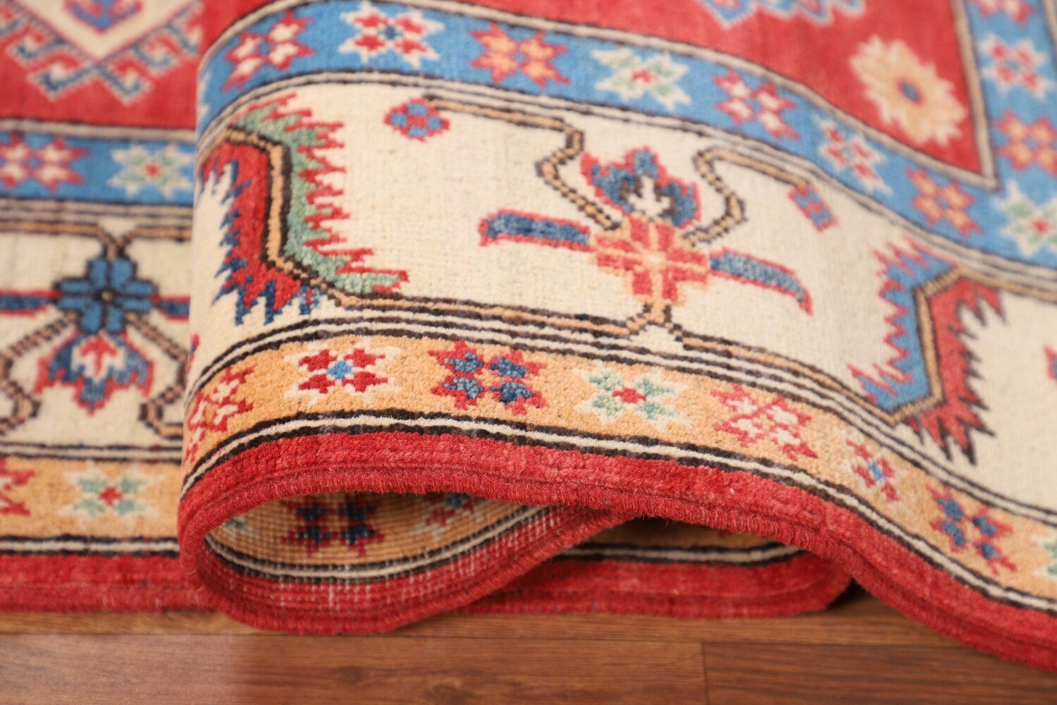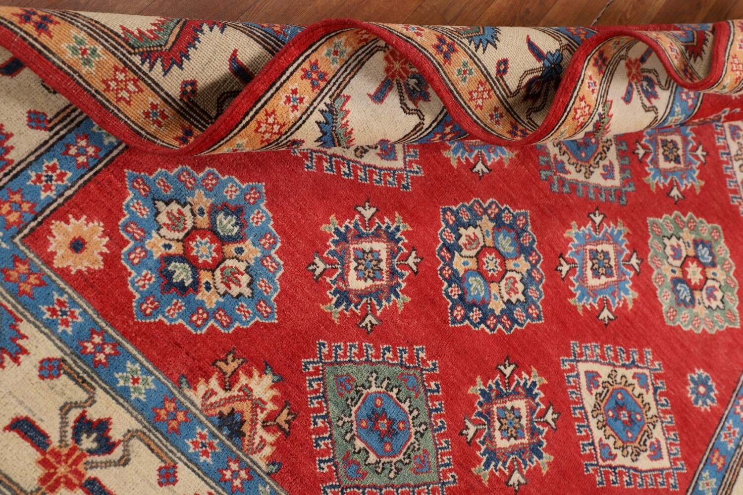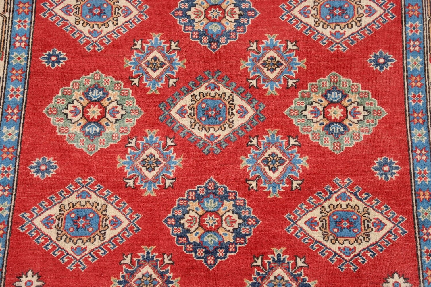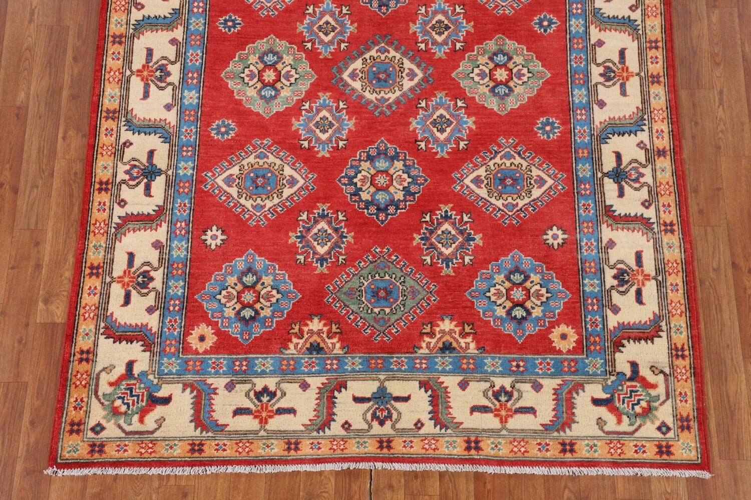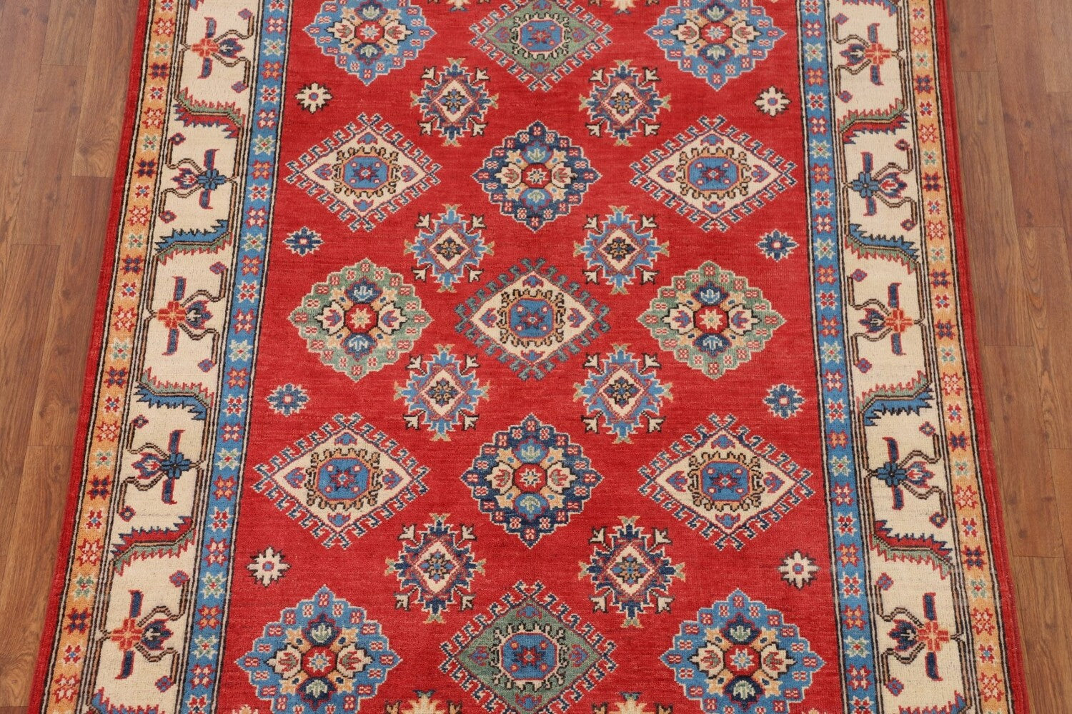 A Beautiful Genuine Pakistan Kazak rug is Hand Knotted by skillful weavers in Pakistan with 100% Wool Material. This rug is in New, First Quality condition. dimensions are 7' 0'' X 5' 2'' in foot and 213 X 157 in centimeter. the primary color is Red.