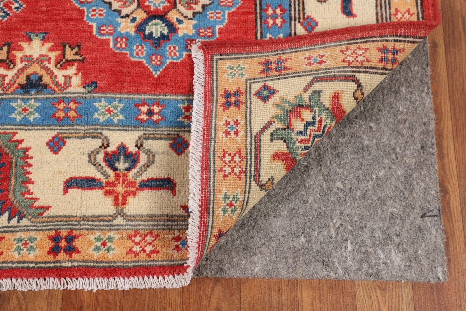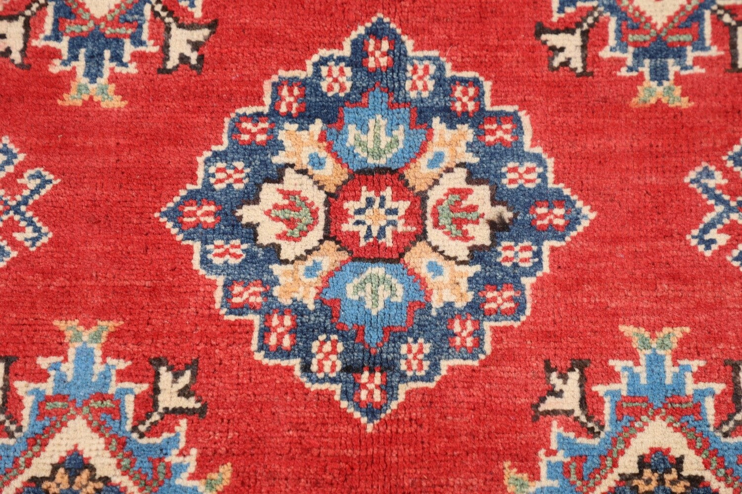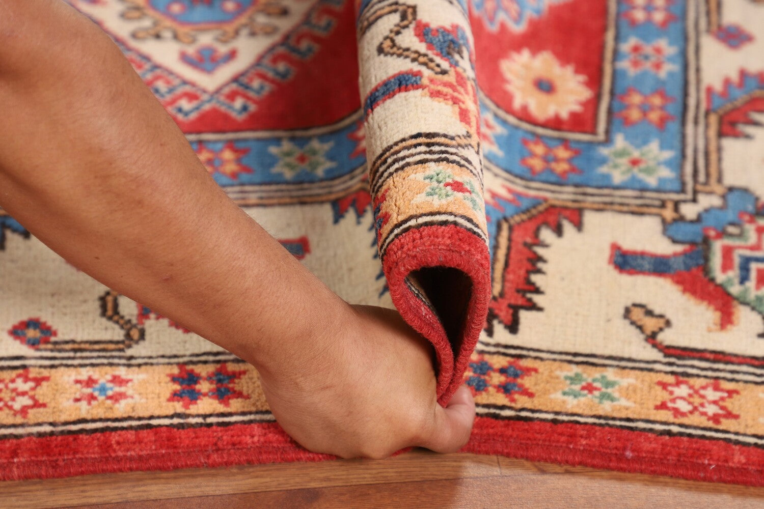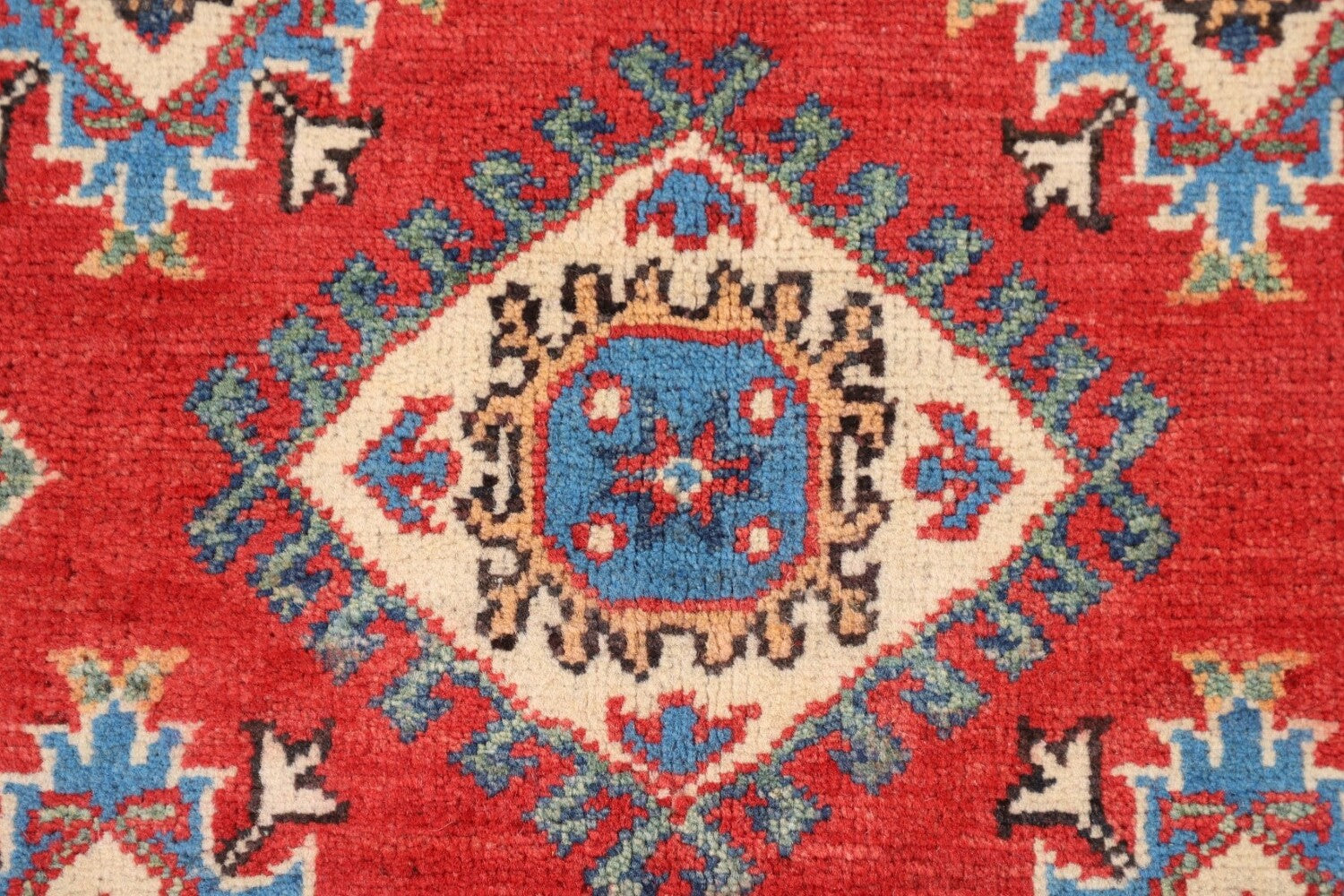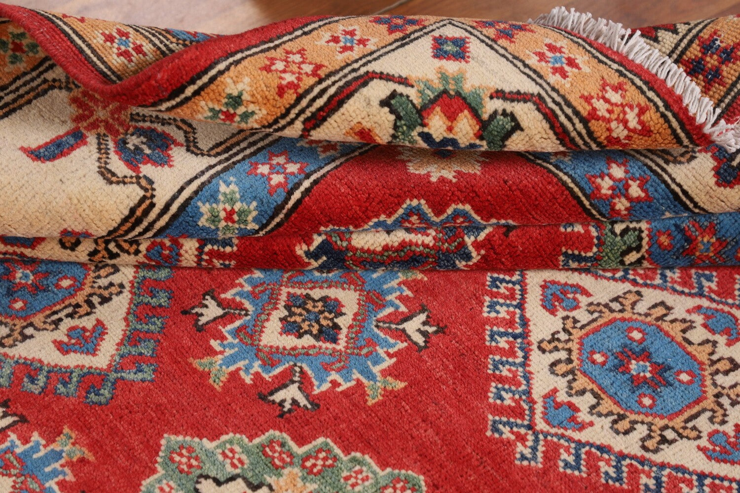A Beautiful Genuine Pakistan Kazak rug is Hand Knotted by skillful weavers in Pakistan with 100% Wool Material. This rug is in New, First Quality condition. dimensions are 7' 0'' X 5' 2'' in foot and 213 X 157 in centimeter. the primary color is Red.