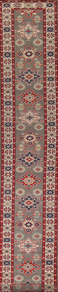 A Beautiful Genuine Pakistan Kazak rug is Hand Knotted by skillful weavers in Pakistan with 100% Wool Material. This rug is in New, First Quality condition. dimensions are 19' 2'' X 2' 2'' in foot and 584 X 66 in centimeter. the primary color is Greys & Charcoal.