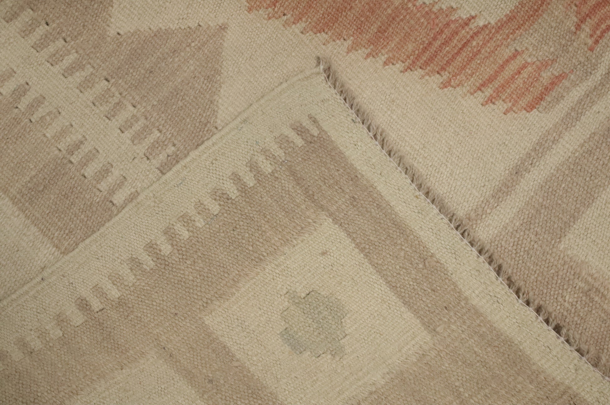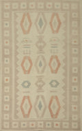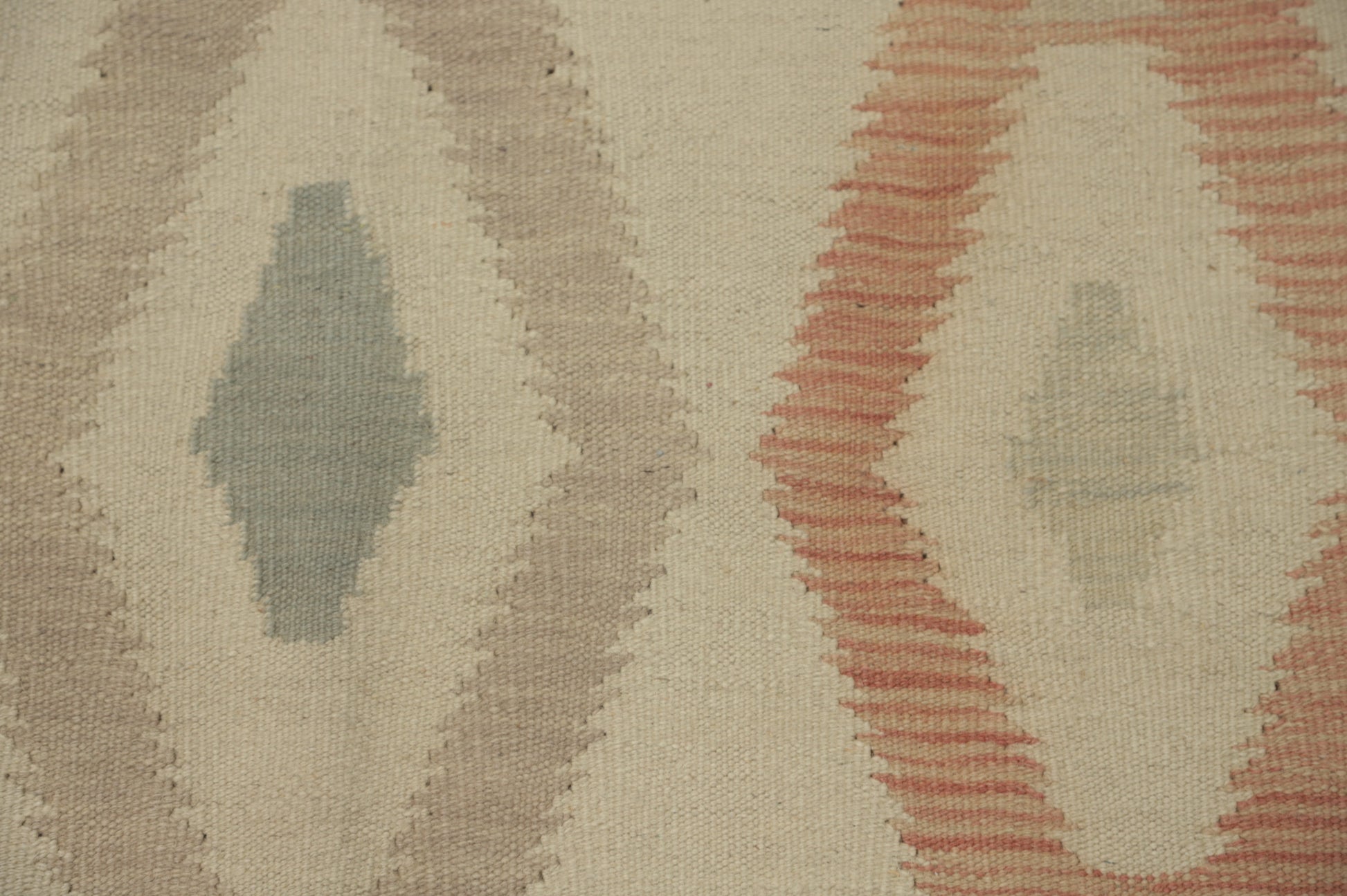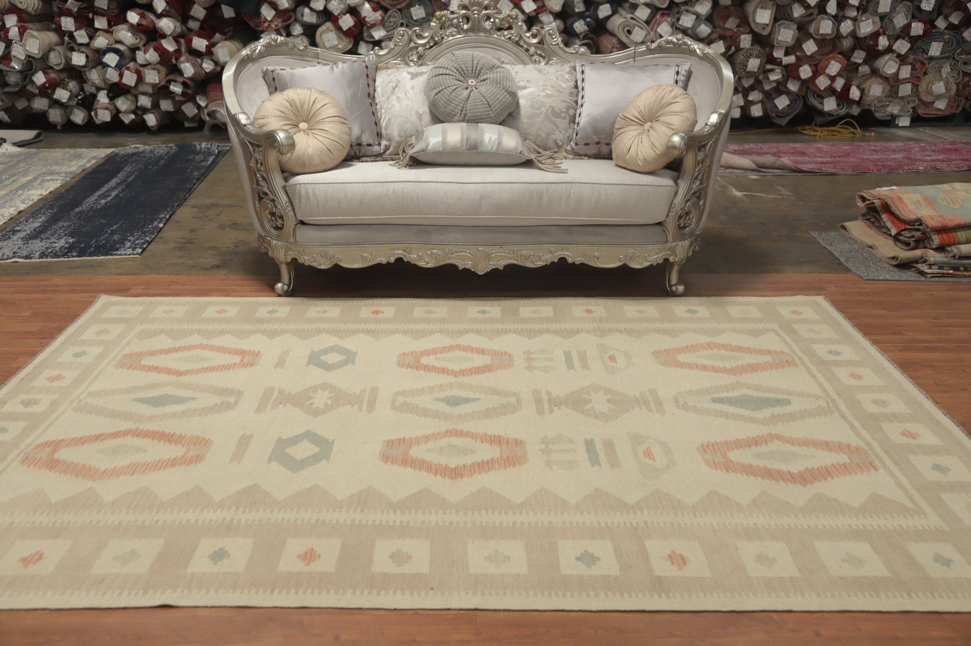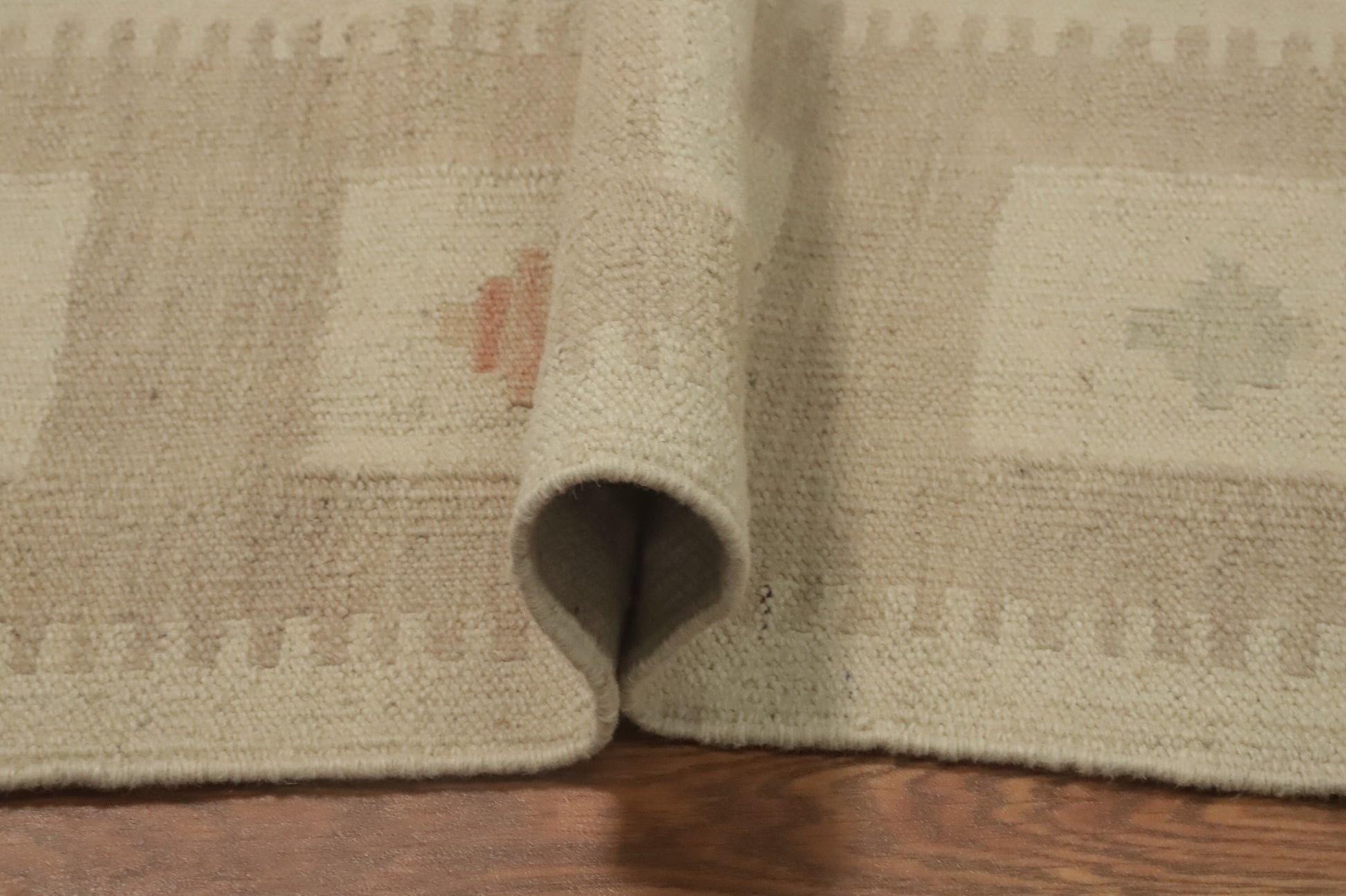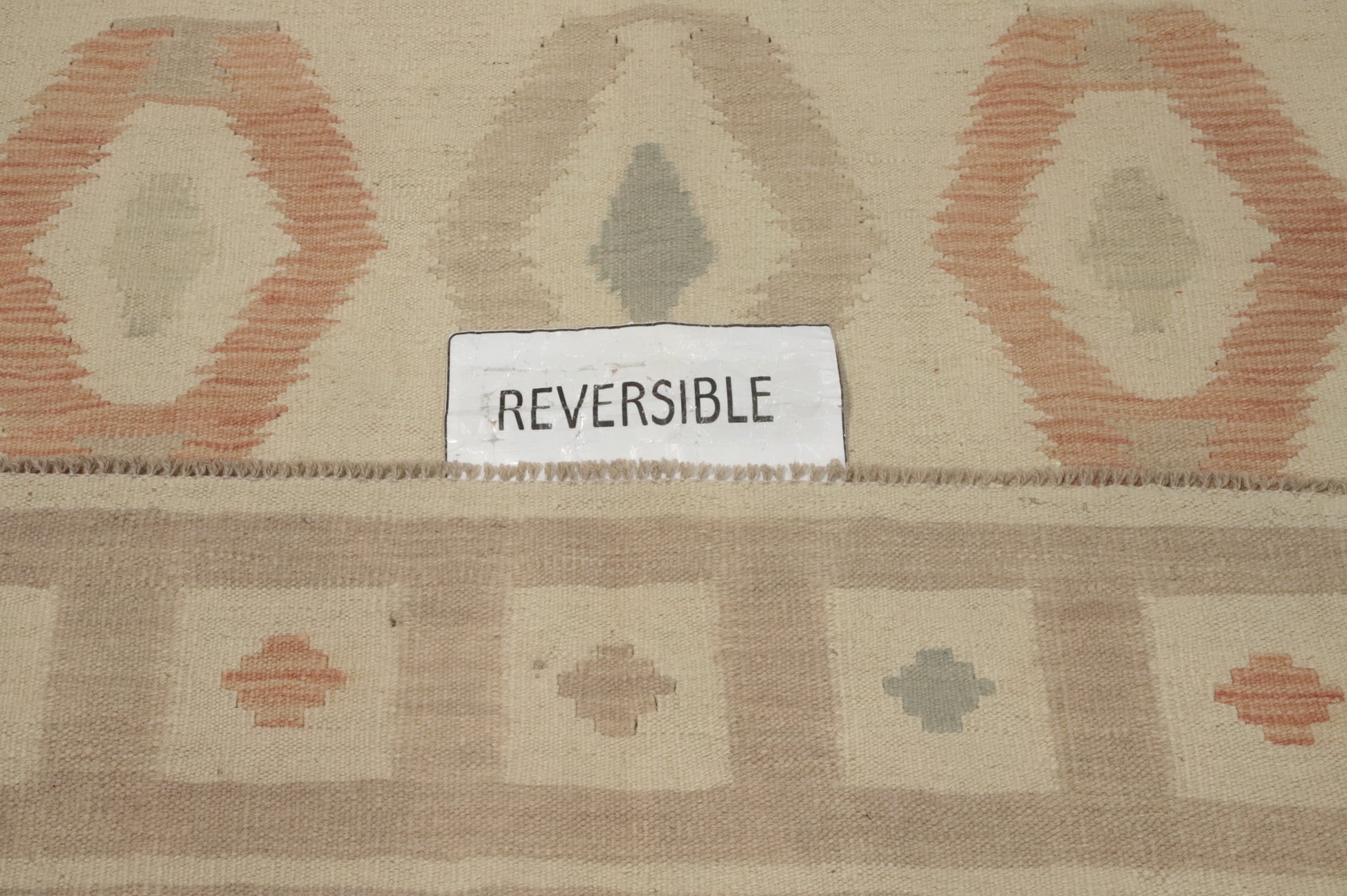 A Beautiful Genuine Pakistan Kilim rug is Hand Woven by skillful weavers in Pakistan with 100% Wool Material. This rug is in New, First Quality condition. dimensions are 9' 10'' X 6' 7'' in foot and 300 X 201 in centimeter. the primary color is Beige & Ivories.