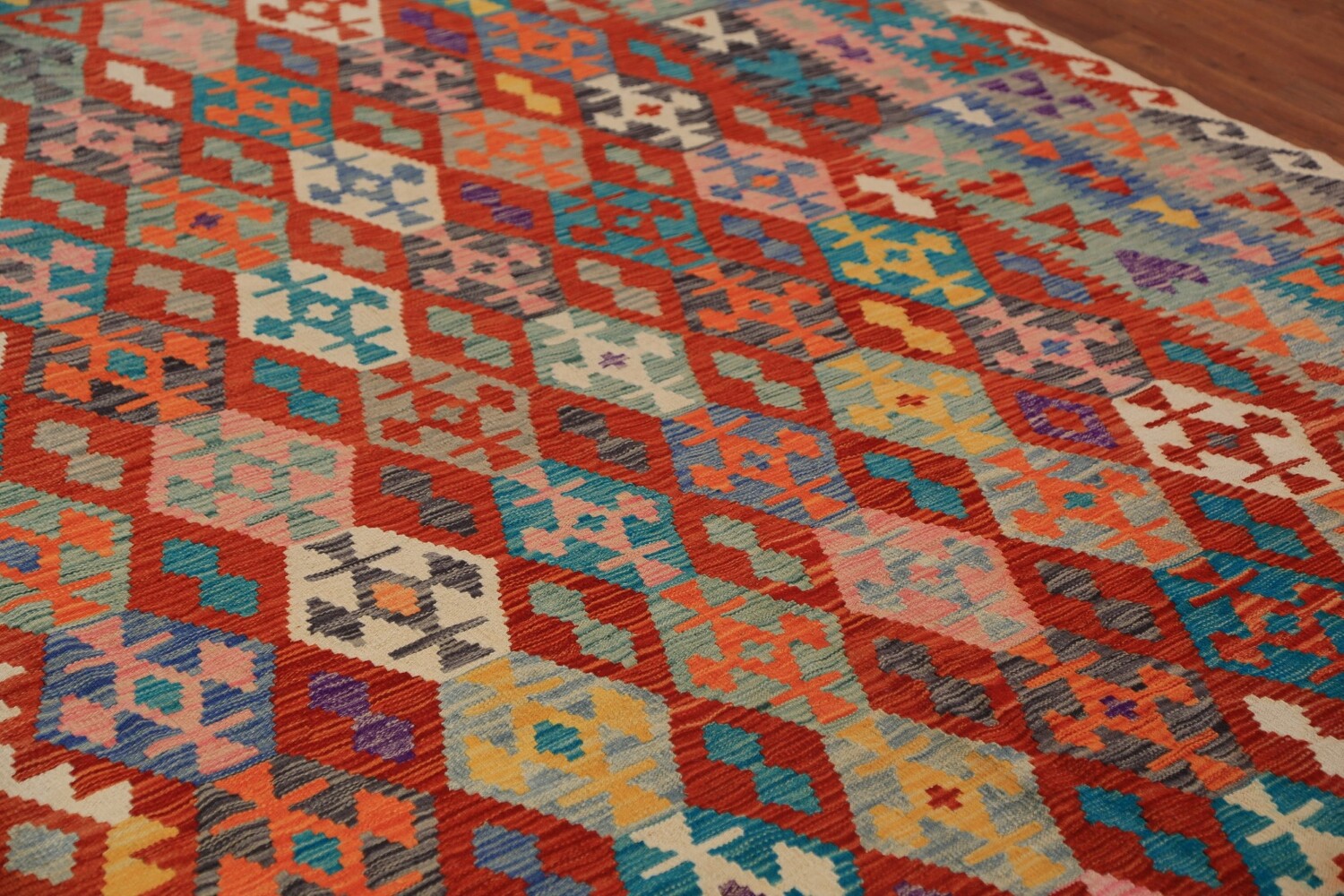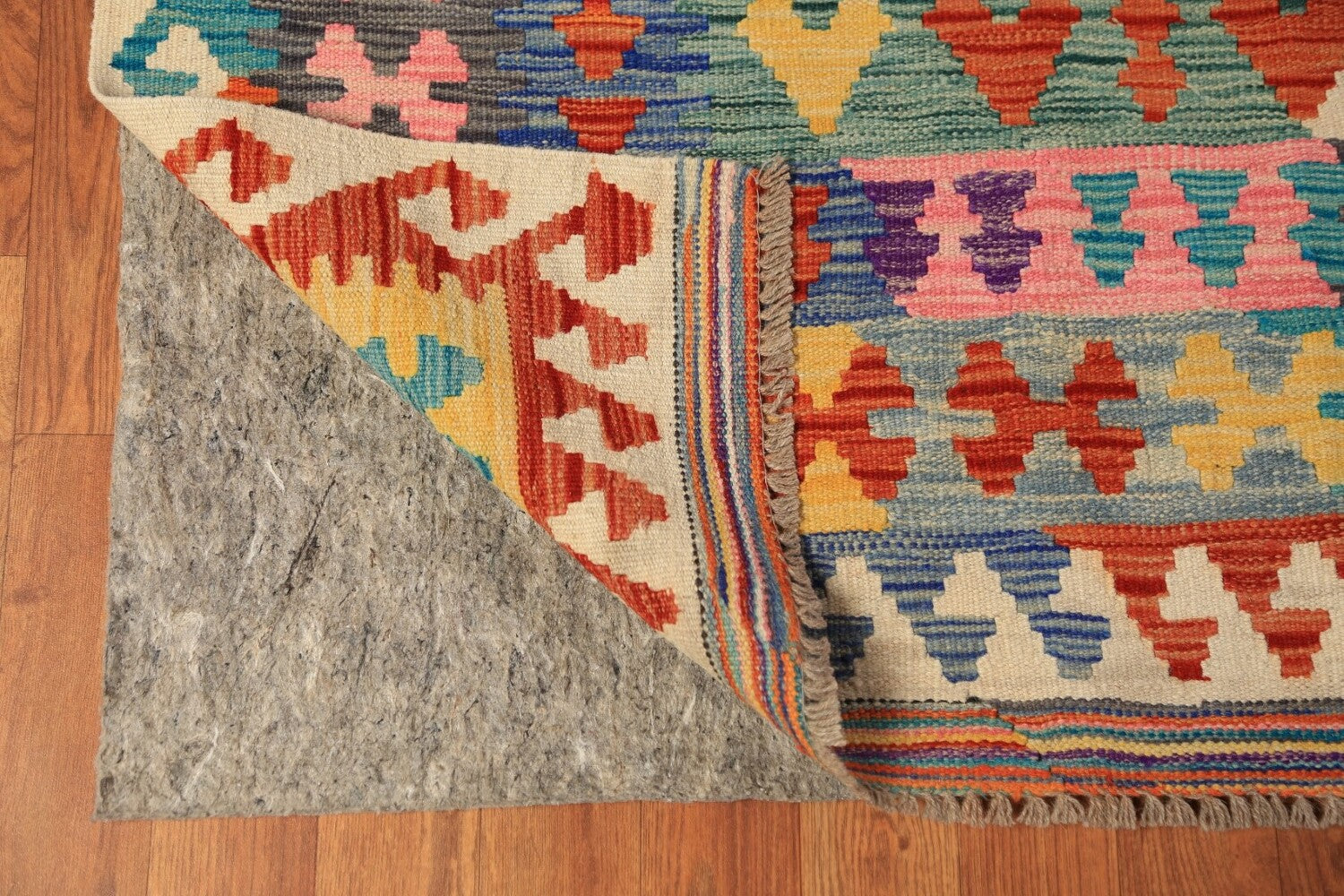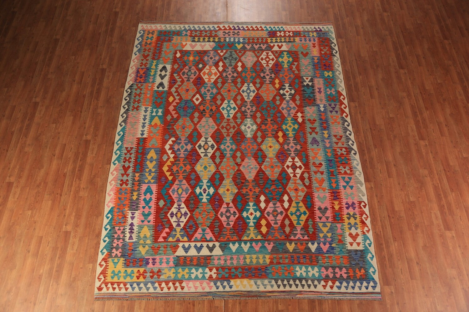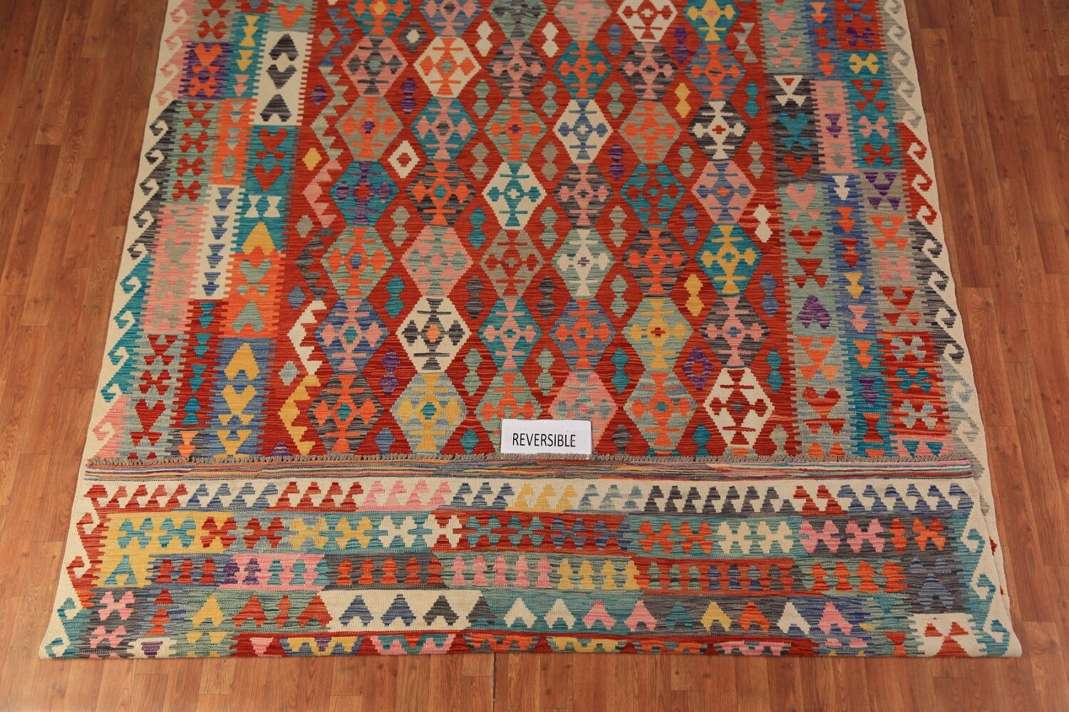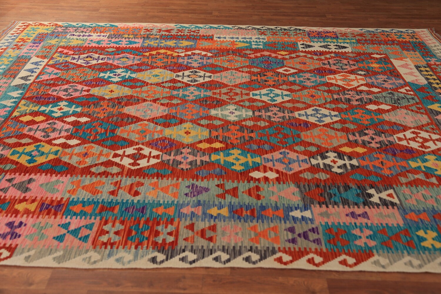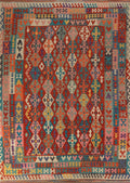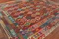 A Beautiful Genuine Pakistan Kilim rug is Hand Woven by skillful weavers in Pakistan with 100% Wool Material. This rug is in New, First Quality condition. dimensions are 11' 2'' X 8' 3'' in foot and 340 X 251 in centimeter. the primary color is Multi-Colored.