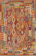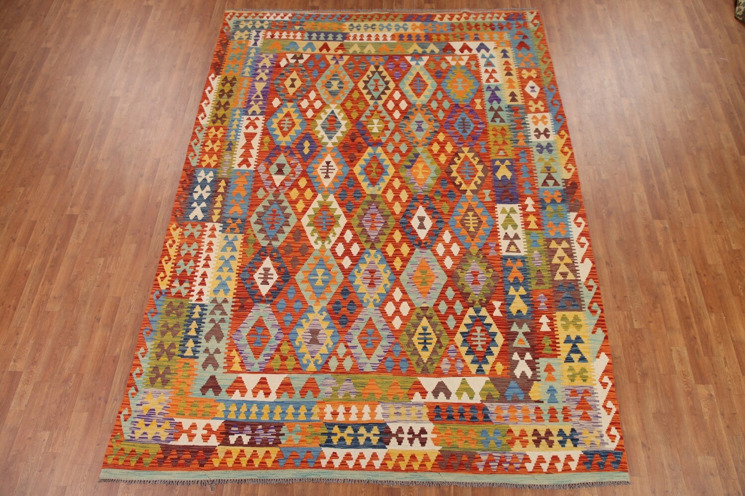 A Beautiful Genuine Pakistan Kilim rug is Hand Woven by skillful weavers in Pakistan with 100% Wool Material. This rug is in New, First Quality condition. dimensions are 11' 2'' X 8' 3'' in foot and 340 X 251 in centimeter. the primary color is Multi-Colored.