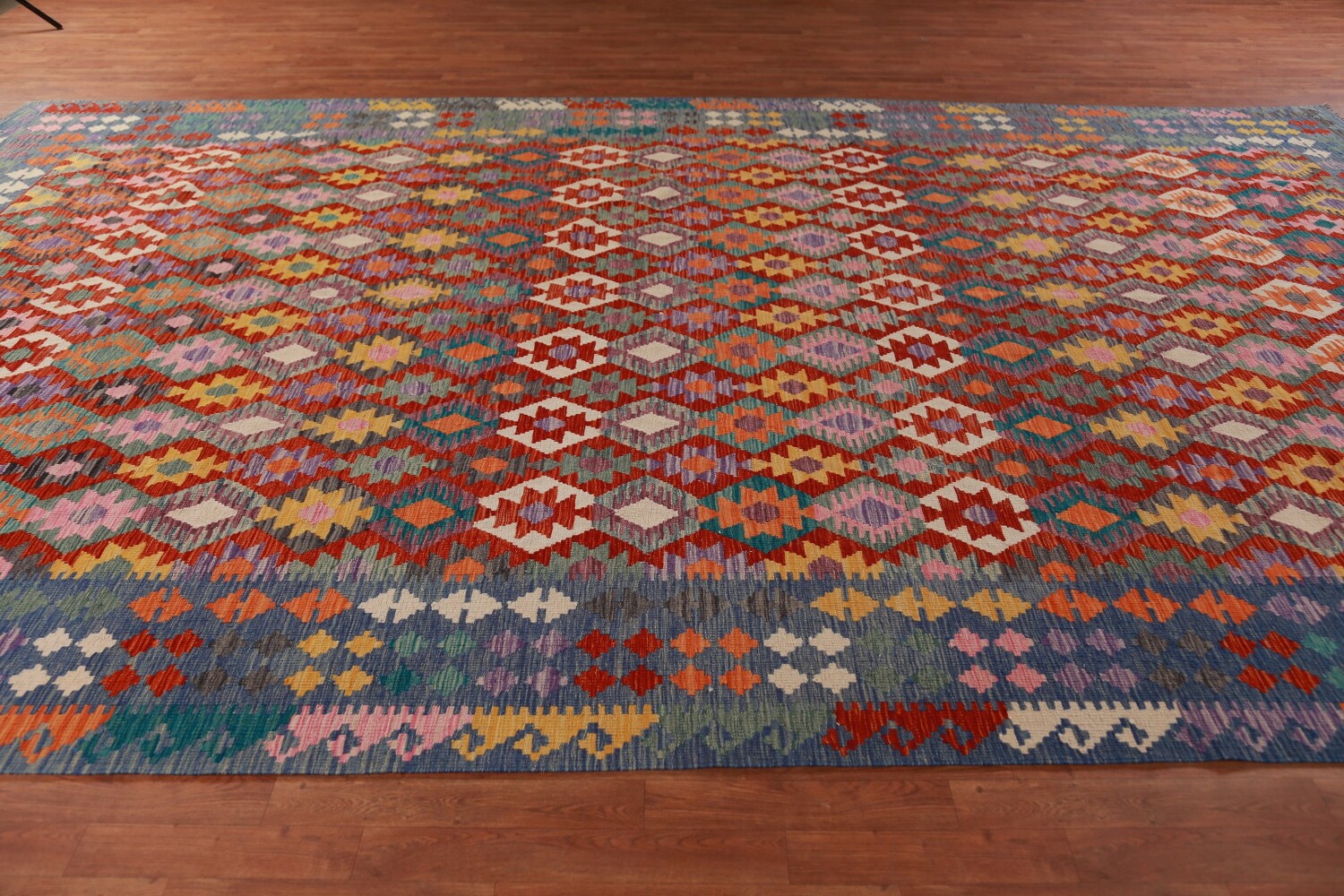 A Beautiful Genuine Pakistan Kilim rug is Hand Woven by skillful weavers in Pakistan with 100% Wool Material. This rug is in New, First Quality condition. dimensions are 16' 1'' X 9' 10'' in foot and 490 X 300 in centimeter. the primary color is Multi-Colored.