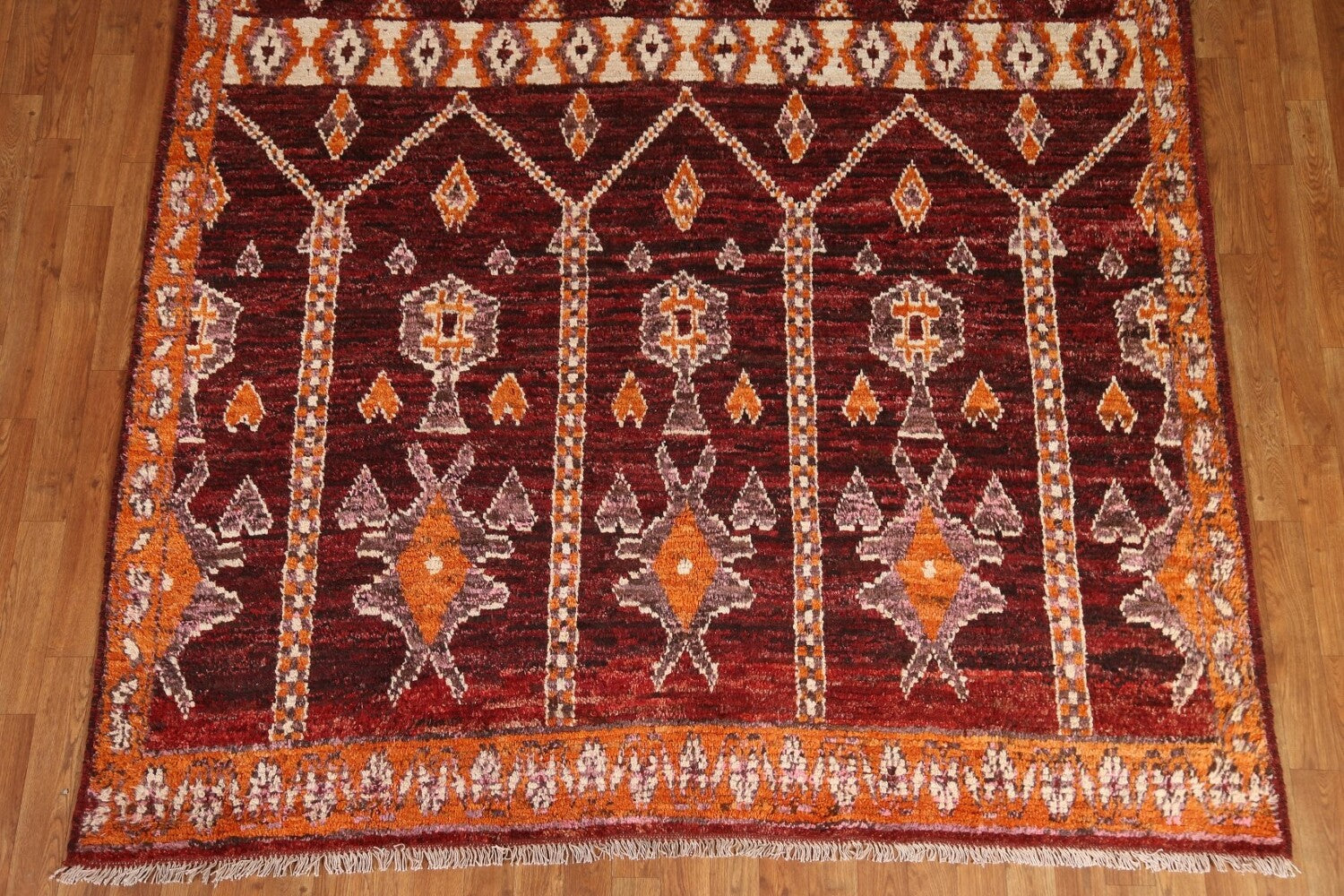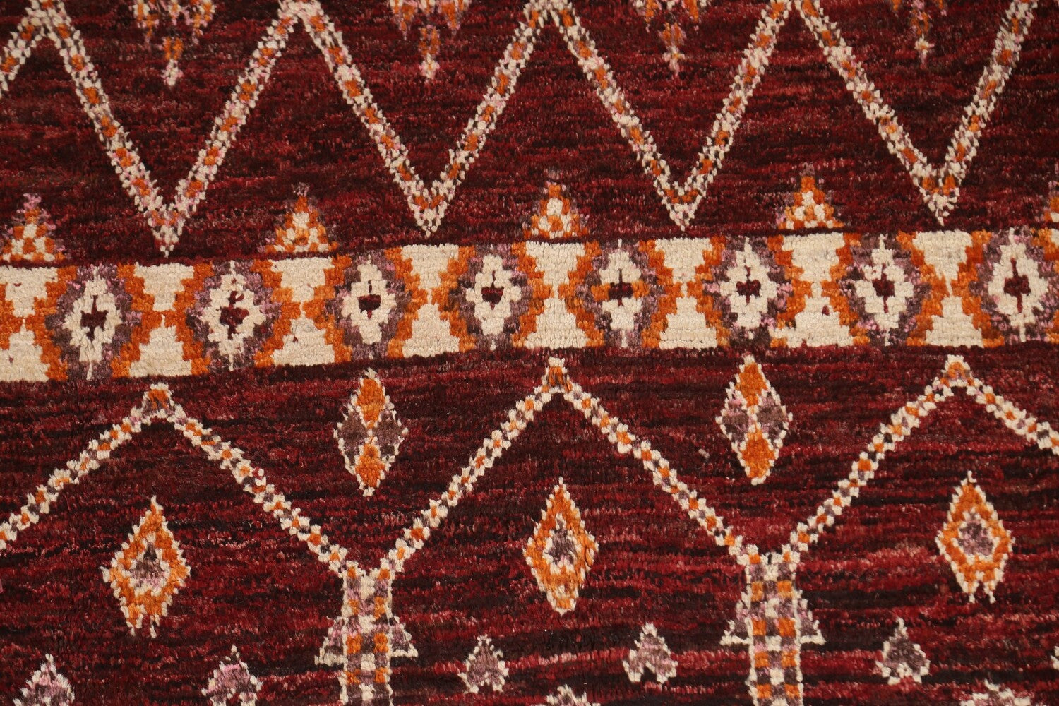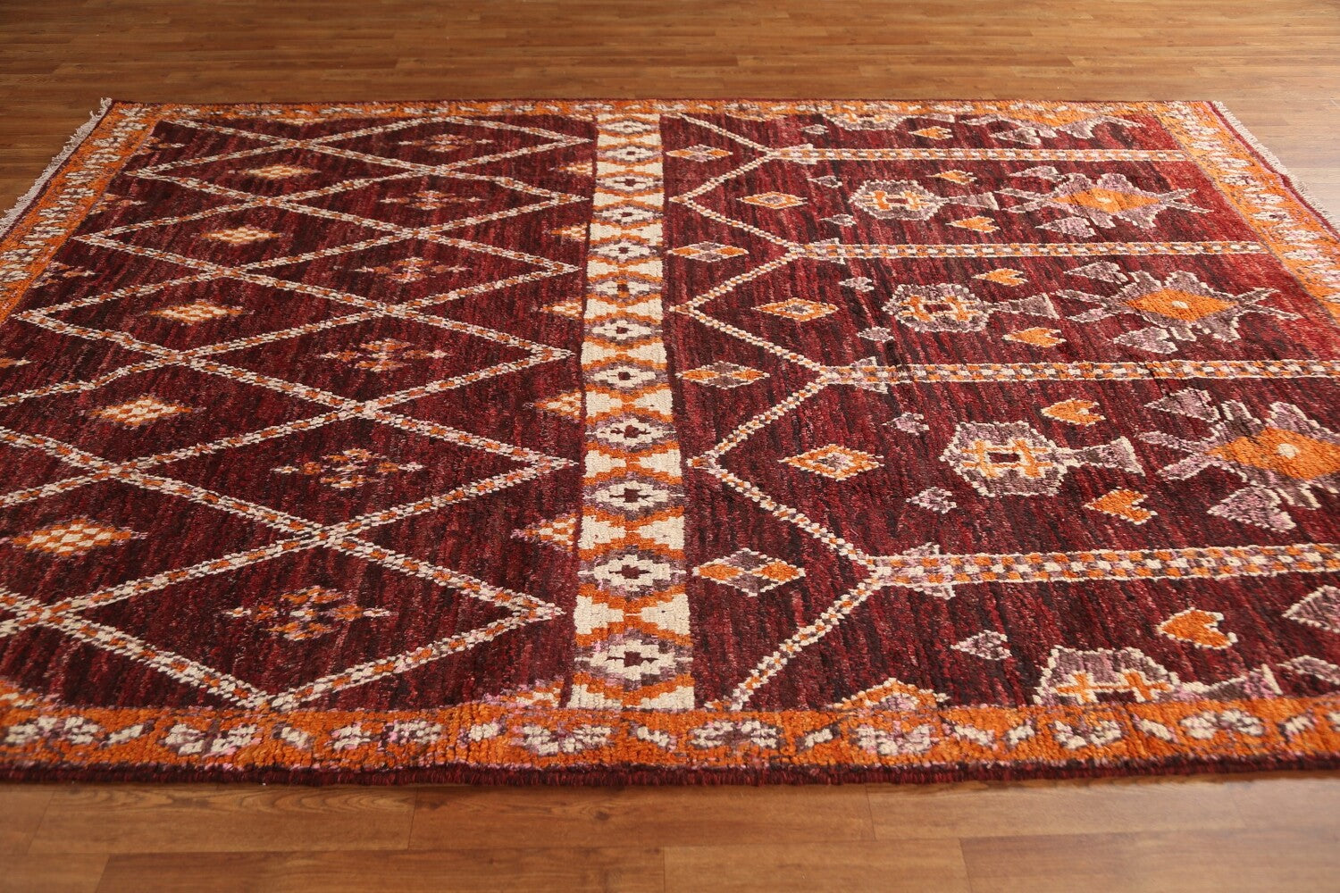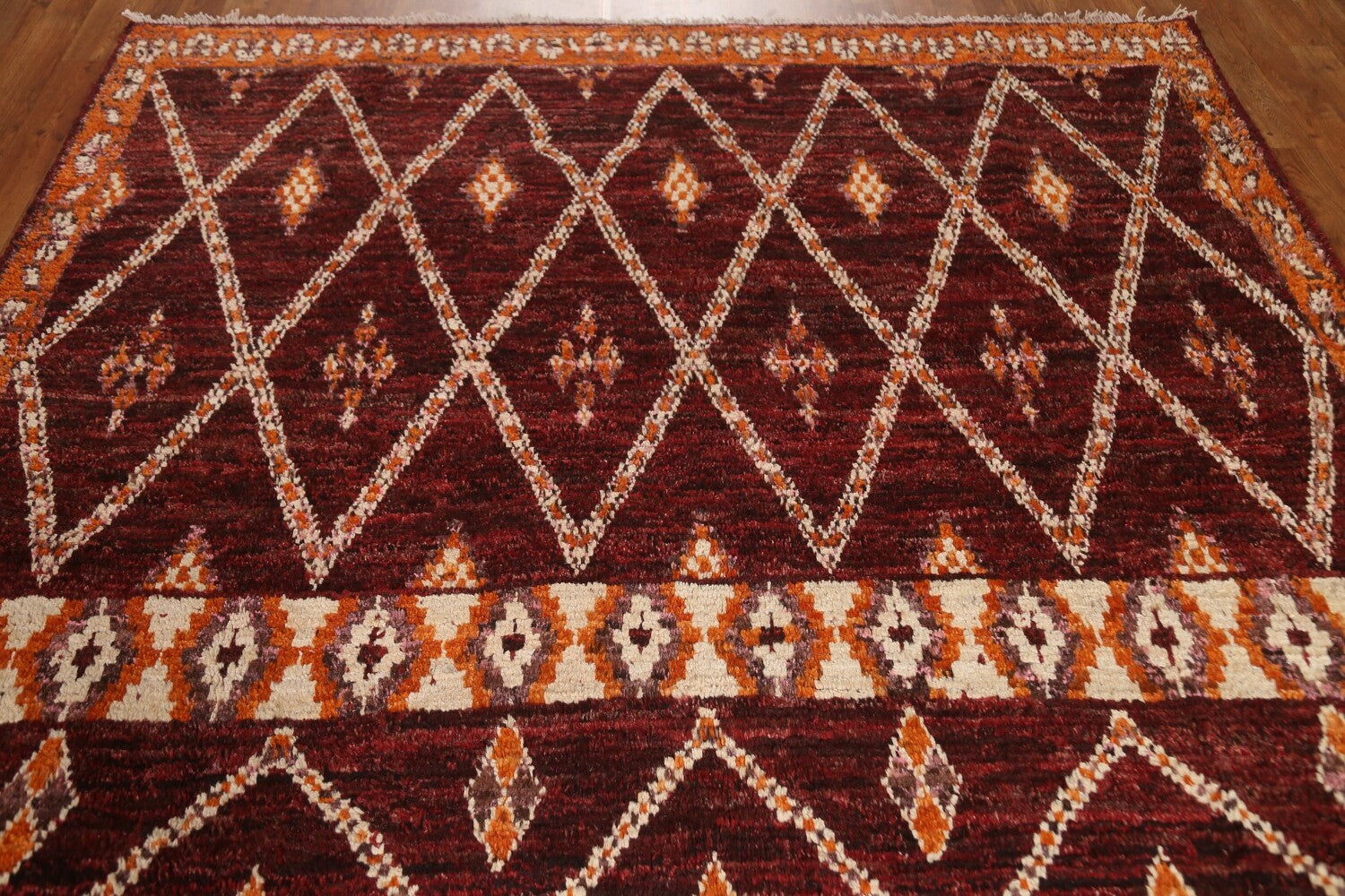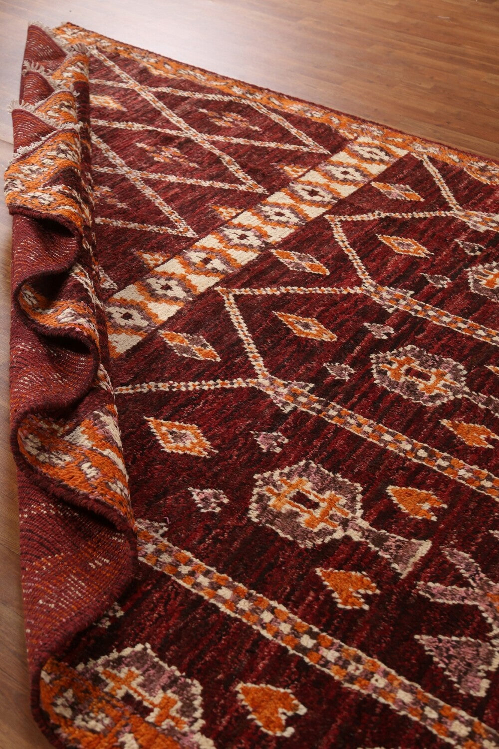 A Beautiful Genuine Pakistan Moroccan rug is Hand Knotted by skillful weavers in Pakistan with 100% Wool Material. This rug is in New, First Quality condition. dimensions are 9' 8'' X 6' 10'' in foot and 295 X 208 in centimeter. the primary color is Red.