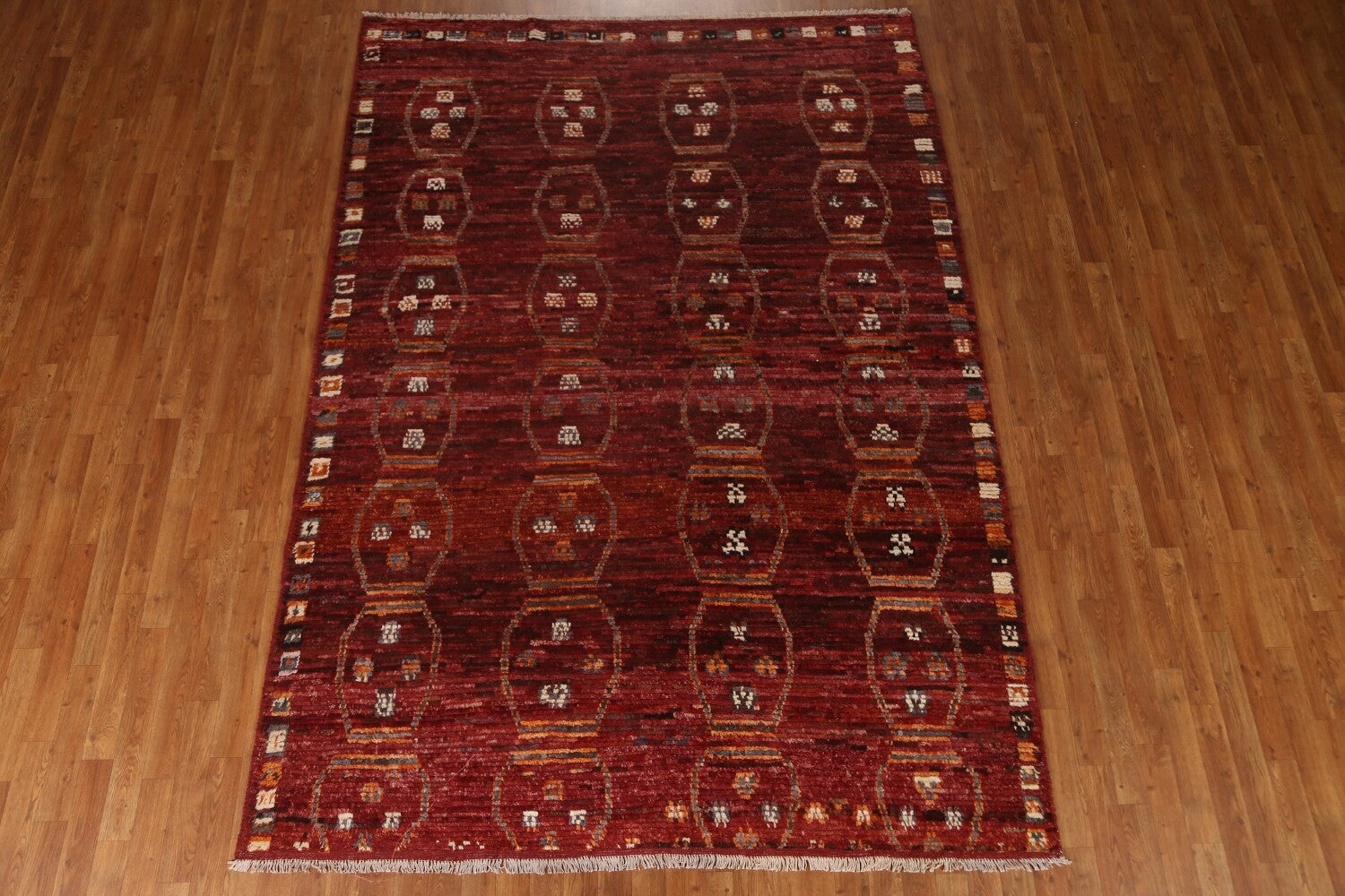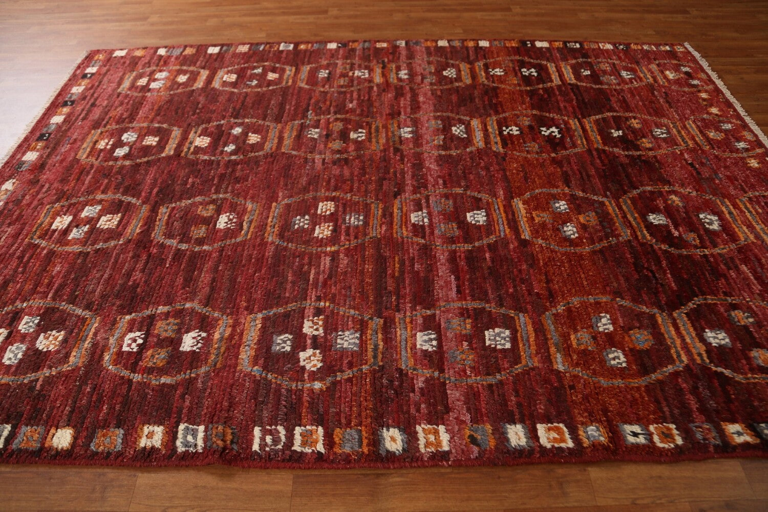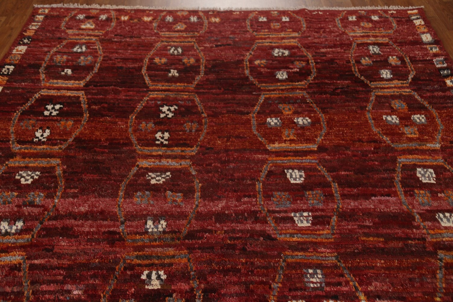 A Beautiful Genuine Pakistan Moroccan rug is Hand Knotted by skillful weavers in Pakistan with 100% Wool Material. This rug is in condition. dimensions are 9' 6'' X 6' 10'' in foot and 290 X 208 in centimeter. the primary color is Red.