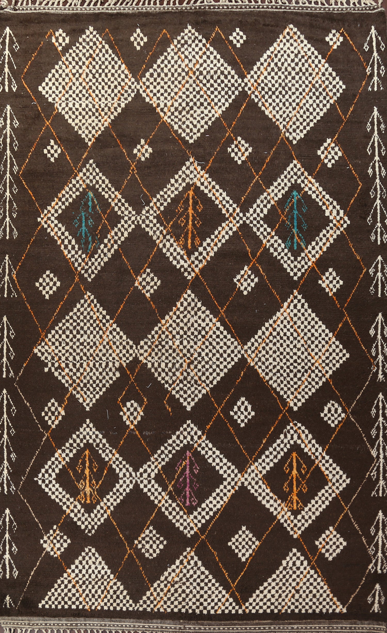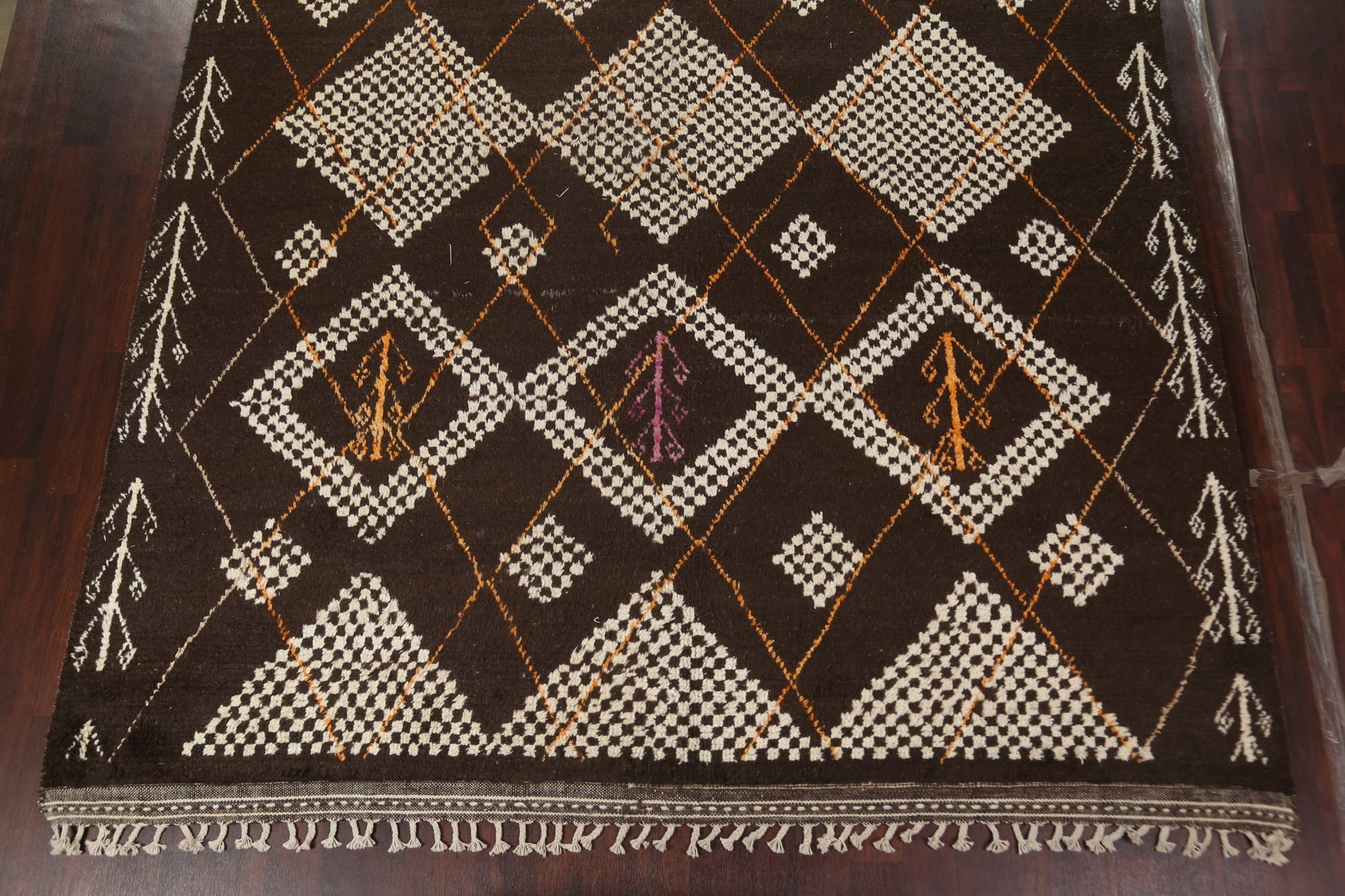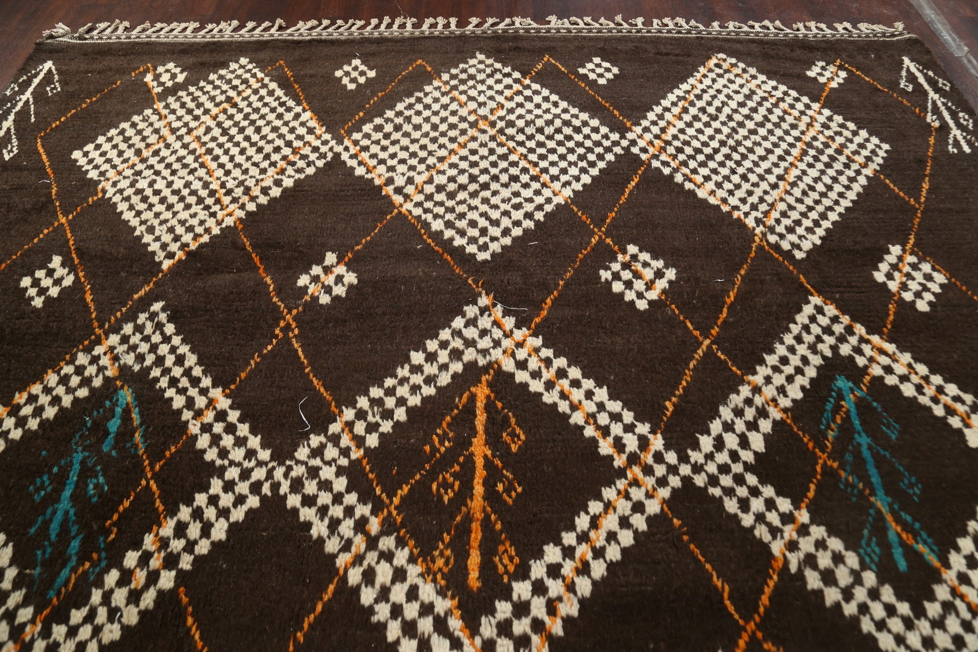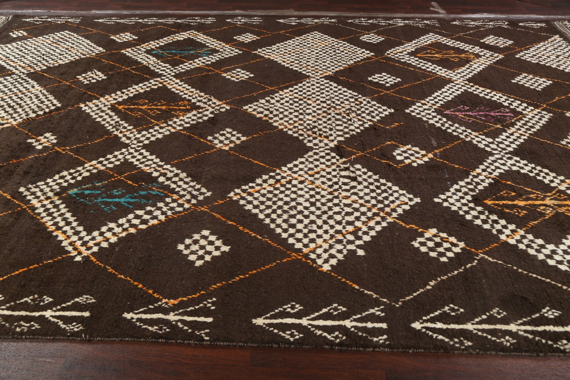 A Beautiful Genuine Morocco Moroccan rug is Hand Knotted by skillful weavers in Morocco with 100% Wool Material. This rug is in New, First Quality condition. dimensions are 14' 11'' X 9' 11'' in foot and 455 X 302 in centimeter. the primary color is Brown.