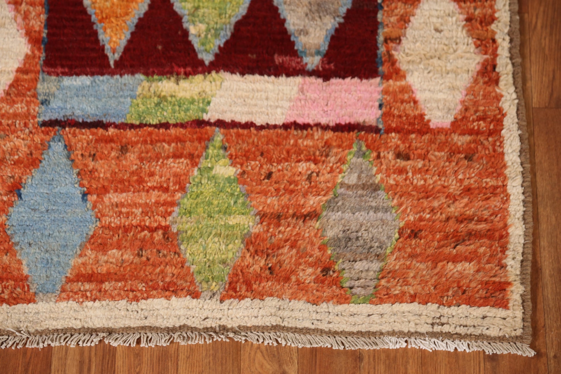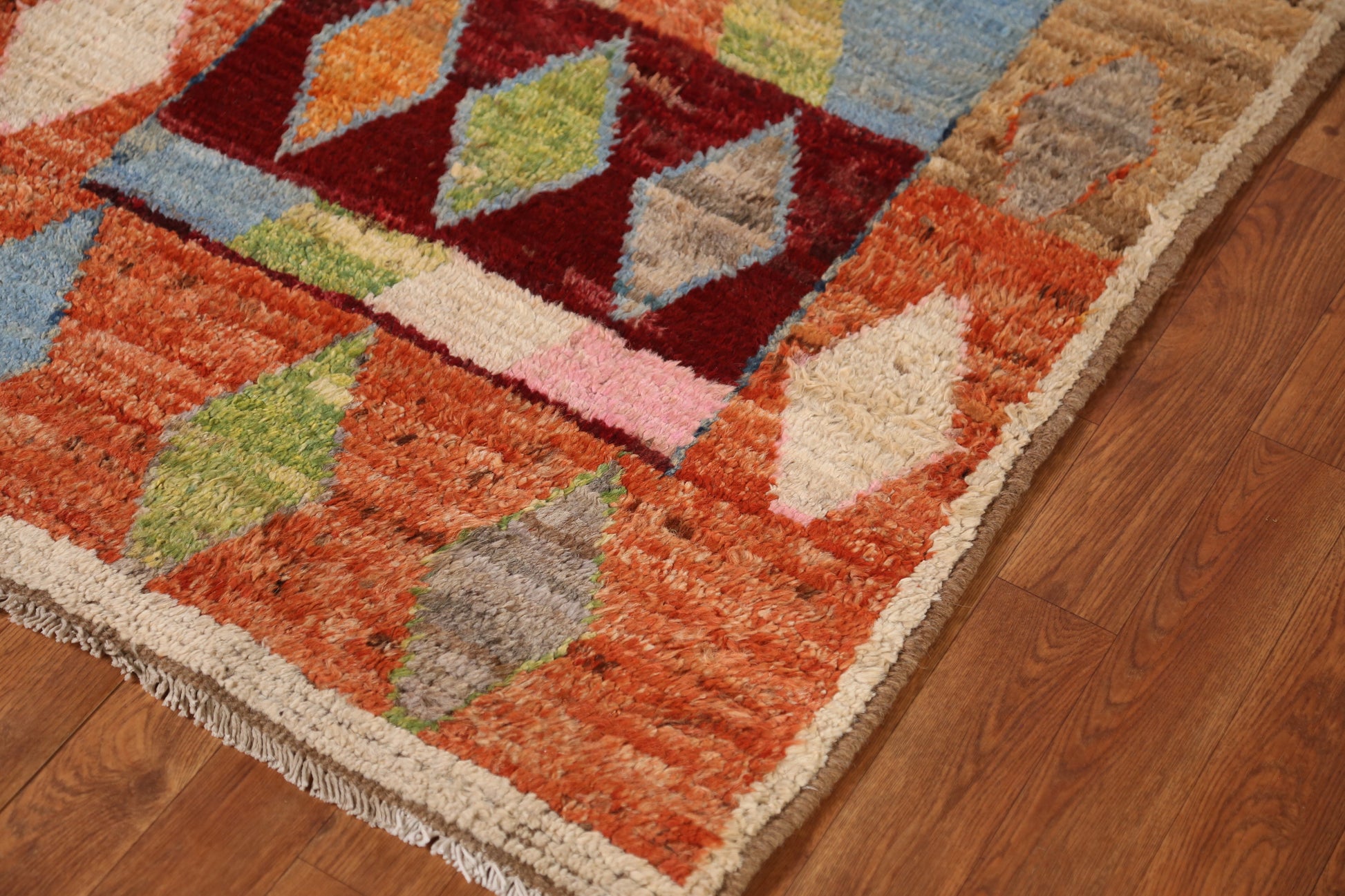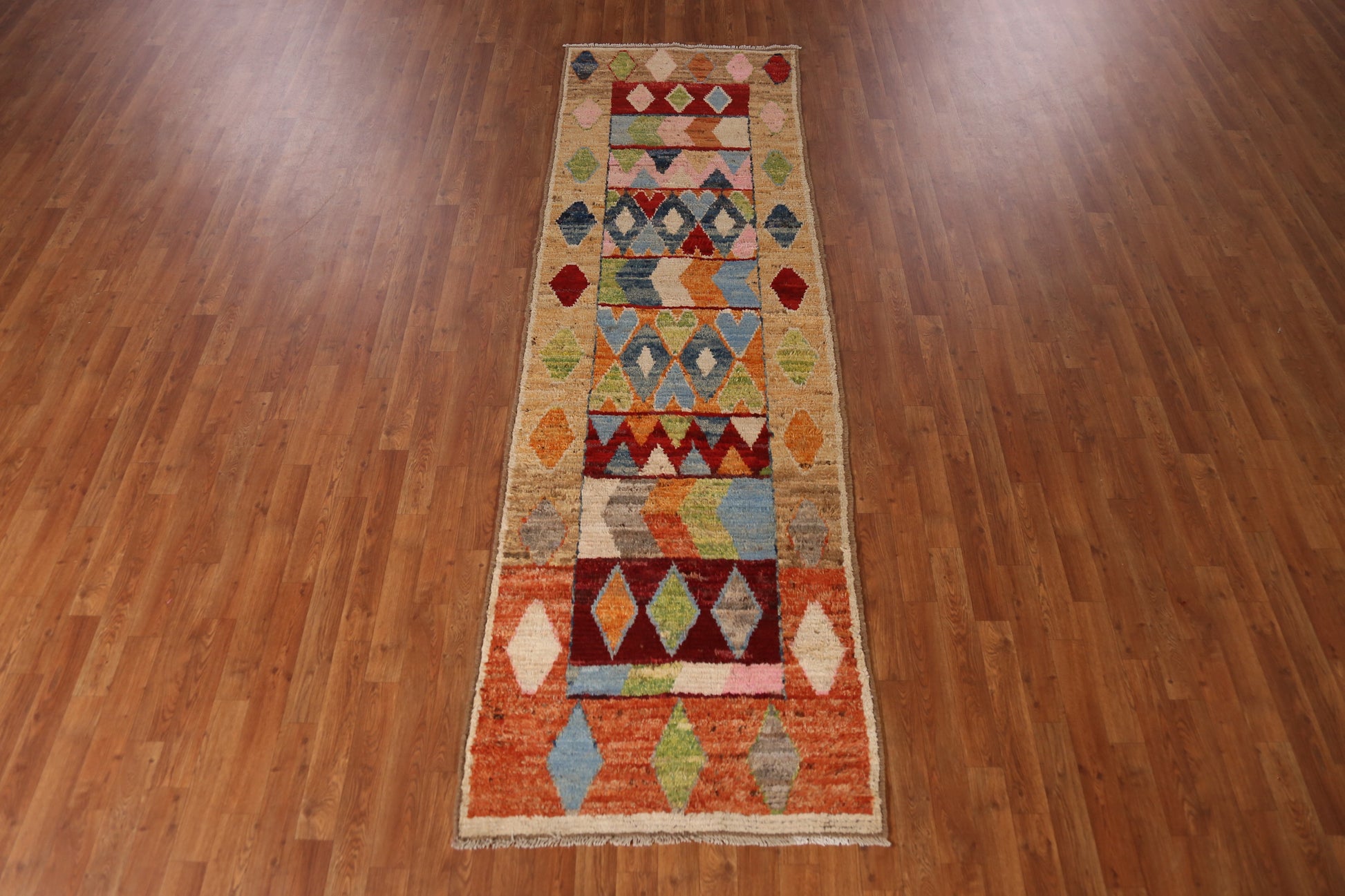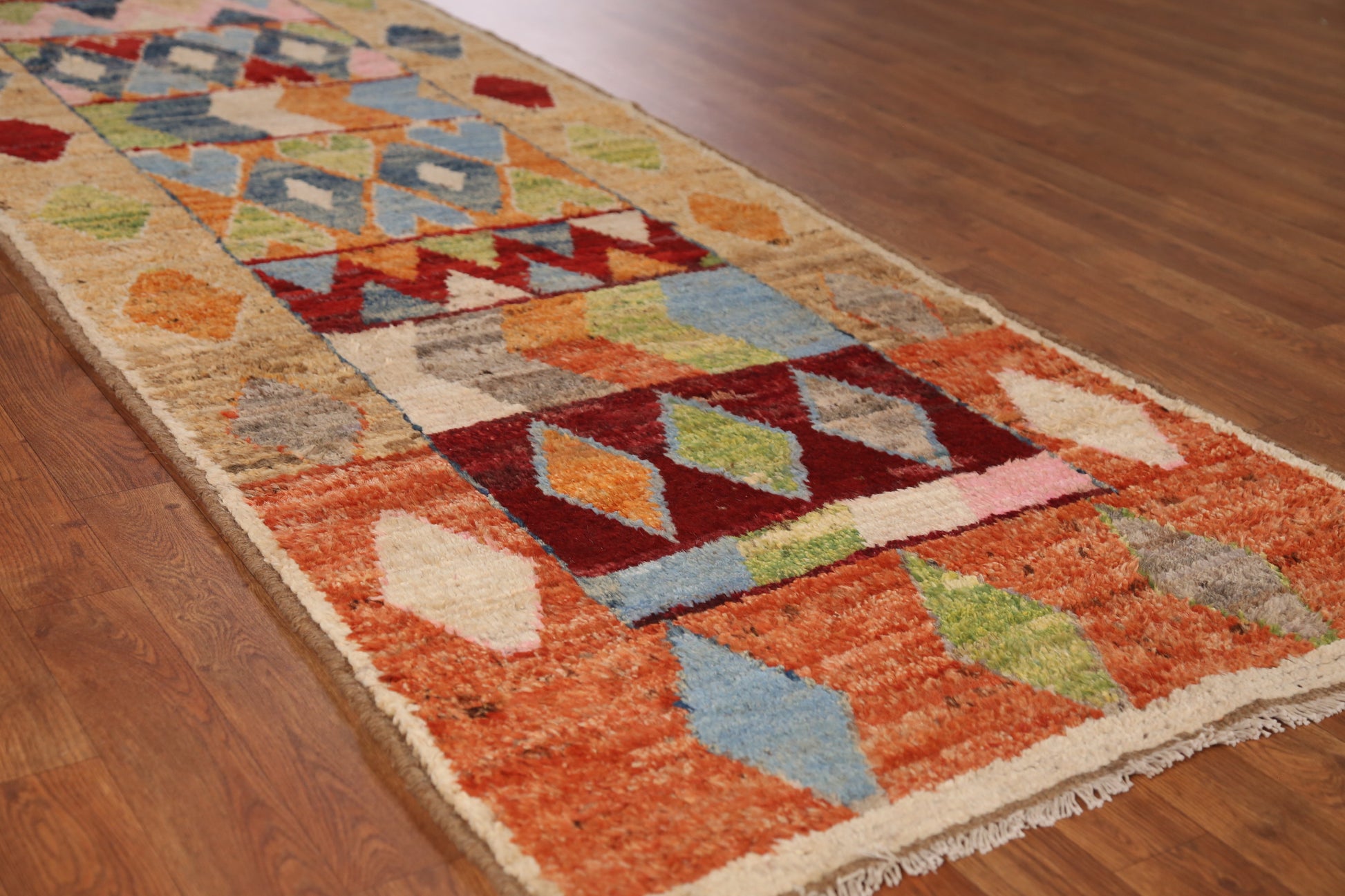 A Beautiful Genuine Pakistan Moroccan rug is Hand Knotted by skillful weavers in Pakistan with 100% Wool Material. This rug is in New, First Quality condition. dimensions are 9' 9'' X 3' 0'' in foot and 297 X 91 in centimeter. the primary color is Multi-Colored.