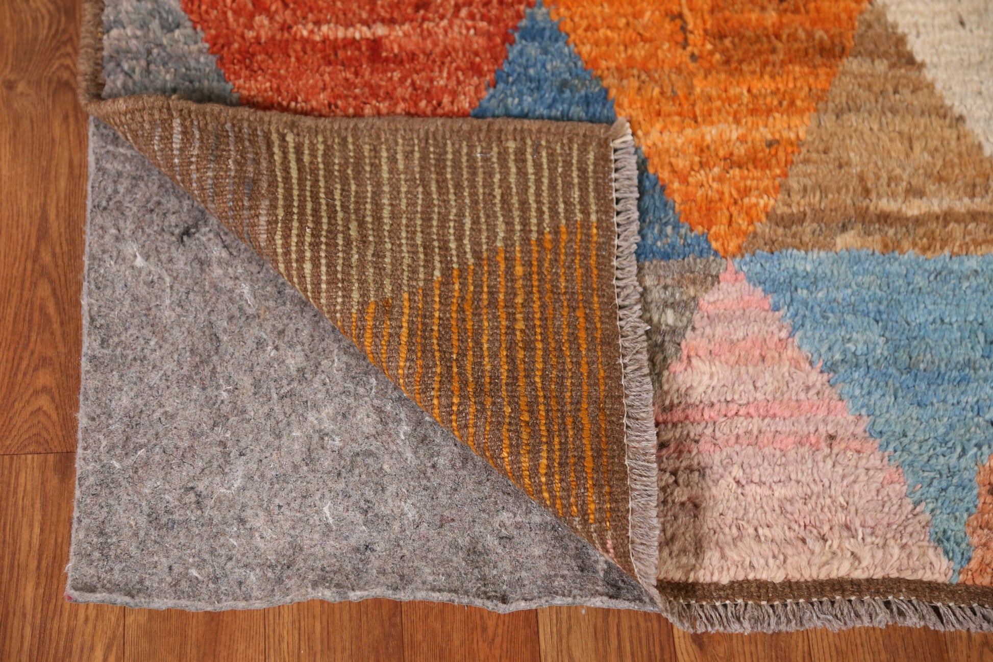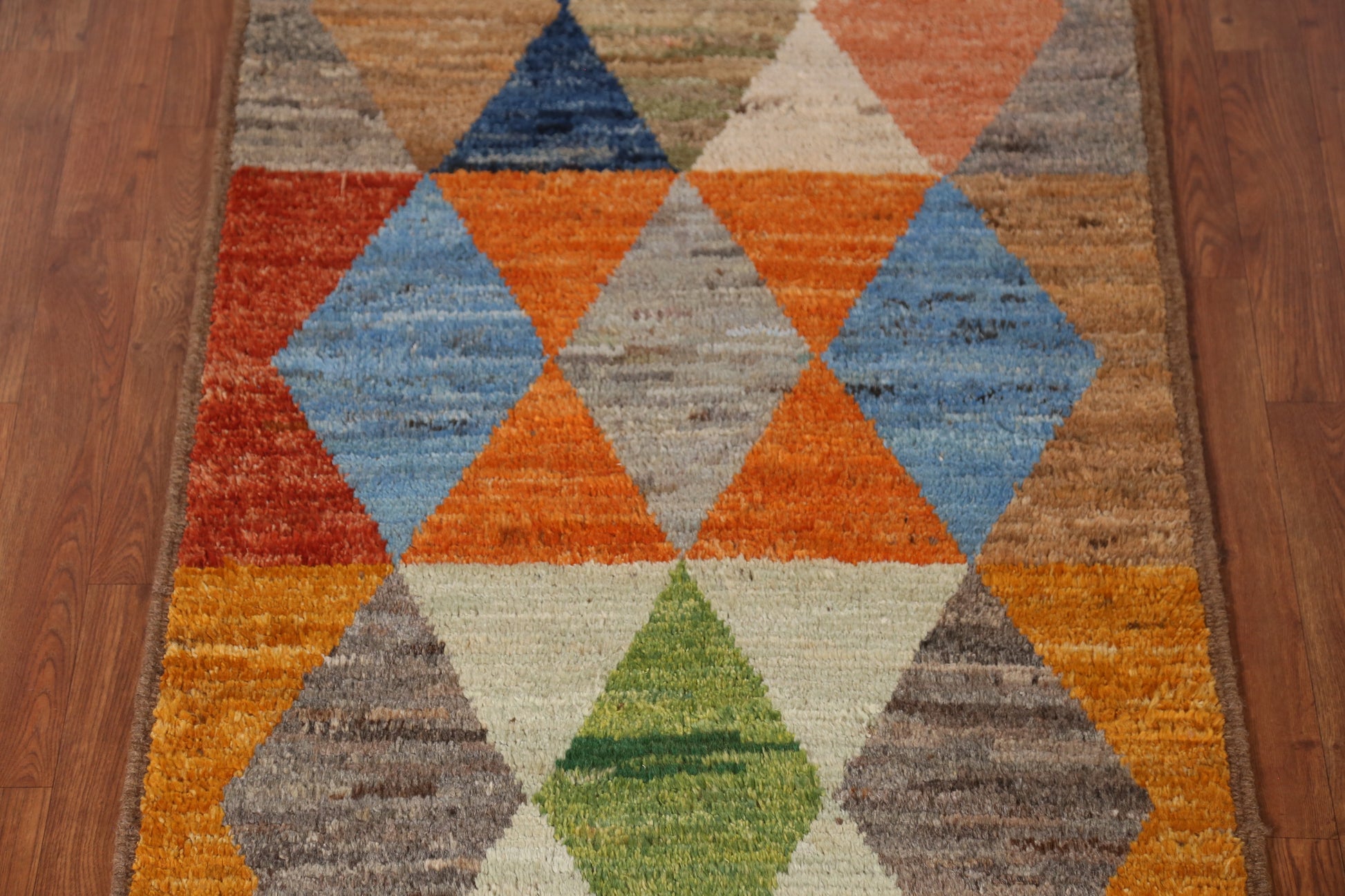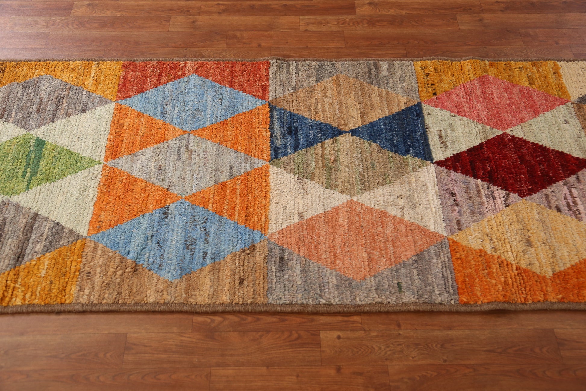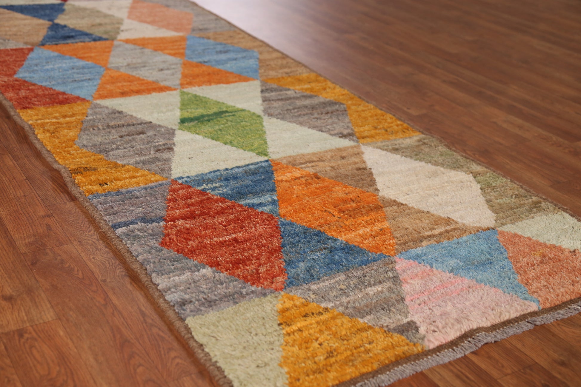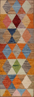 A Beautiful Genuine Pakistan Moroccan rug is Hand Knotted by skillful weavers in Pakistan with 100% Wool Material. This rug is in New, First Quality condition. dimensions are 9' 11'' X 2' 11'' in foot and 302 X 89 in centimeter. the primary color is Multi-Colored.