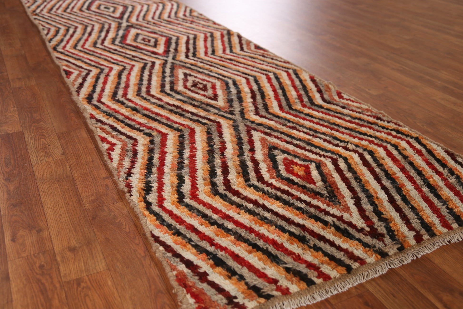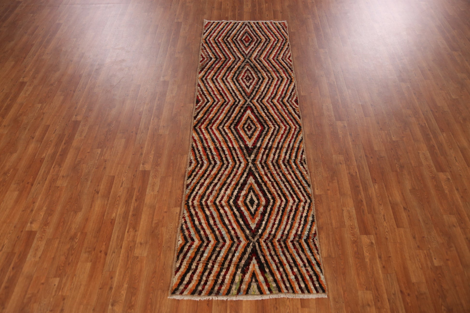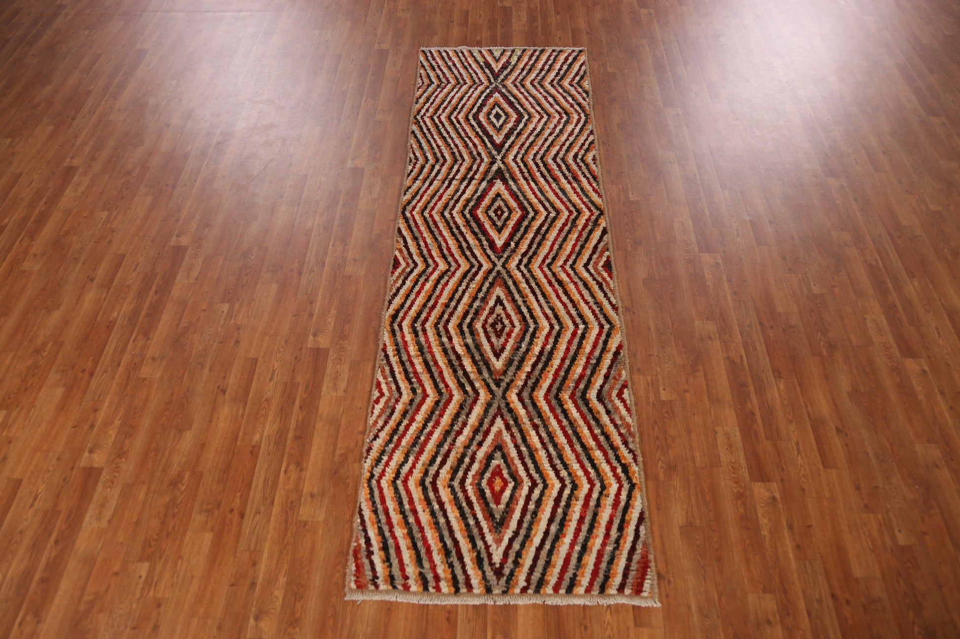 A Beautiful Genuine Pakistan Moroccan rug is Hand Knotted by skillful weavers in Pakistan with 100% Wool Material. This rug is in New, First Quality condition. dimensions are 9' 5'' X 2' 10'' in foot and 287 X 86 in centimeter. the primary color is Multi-Colored.